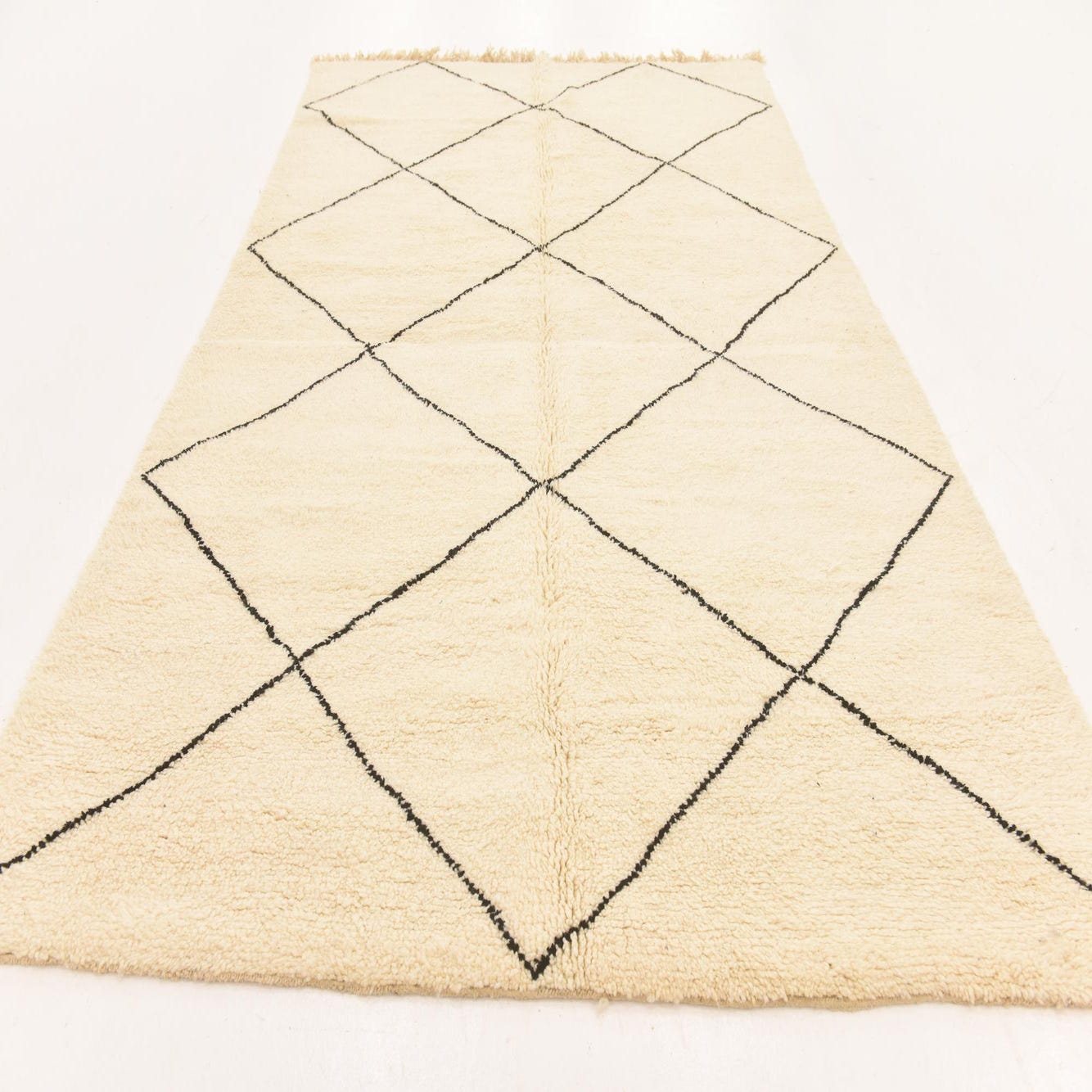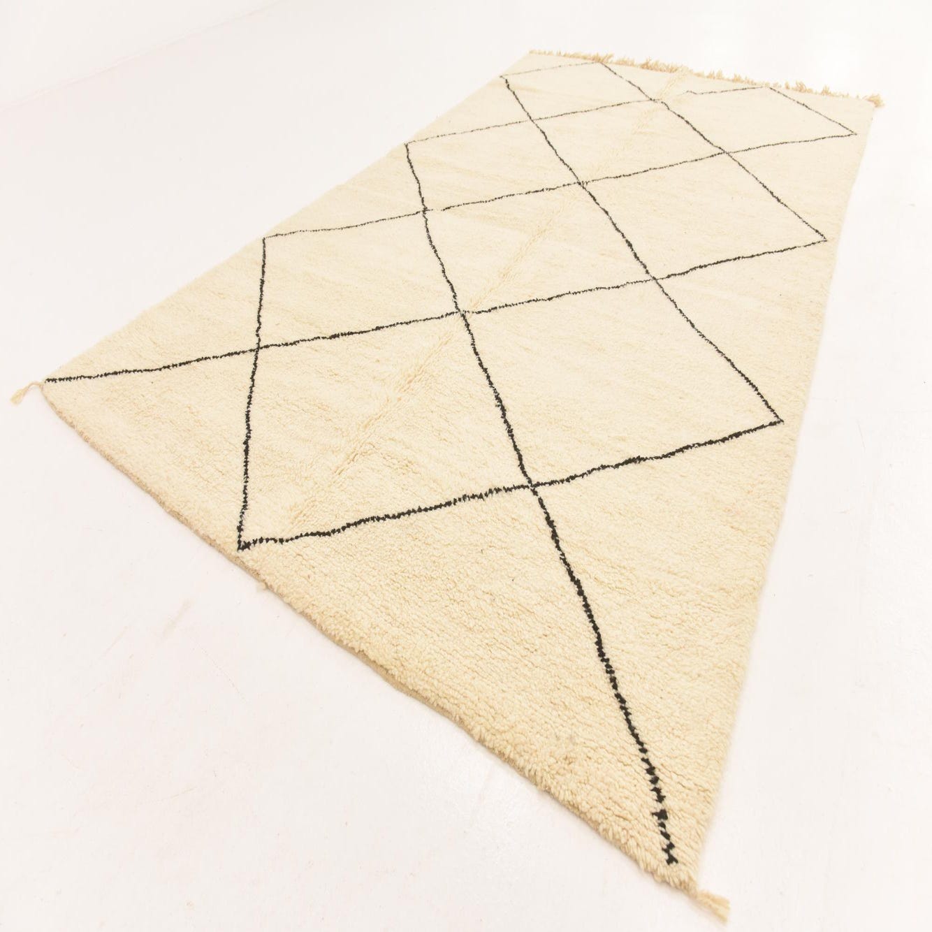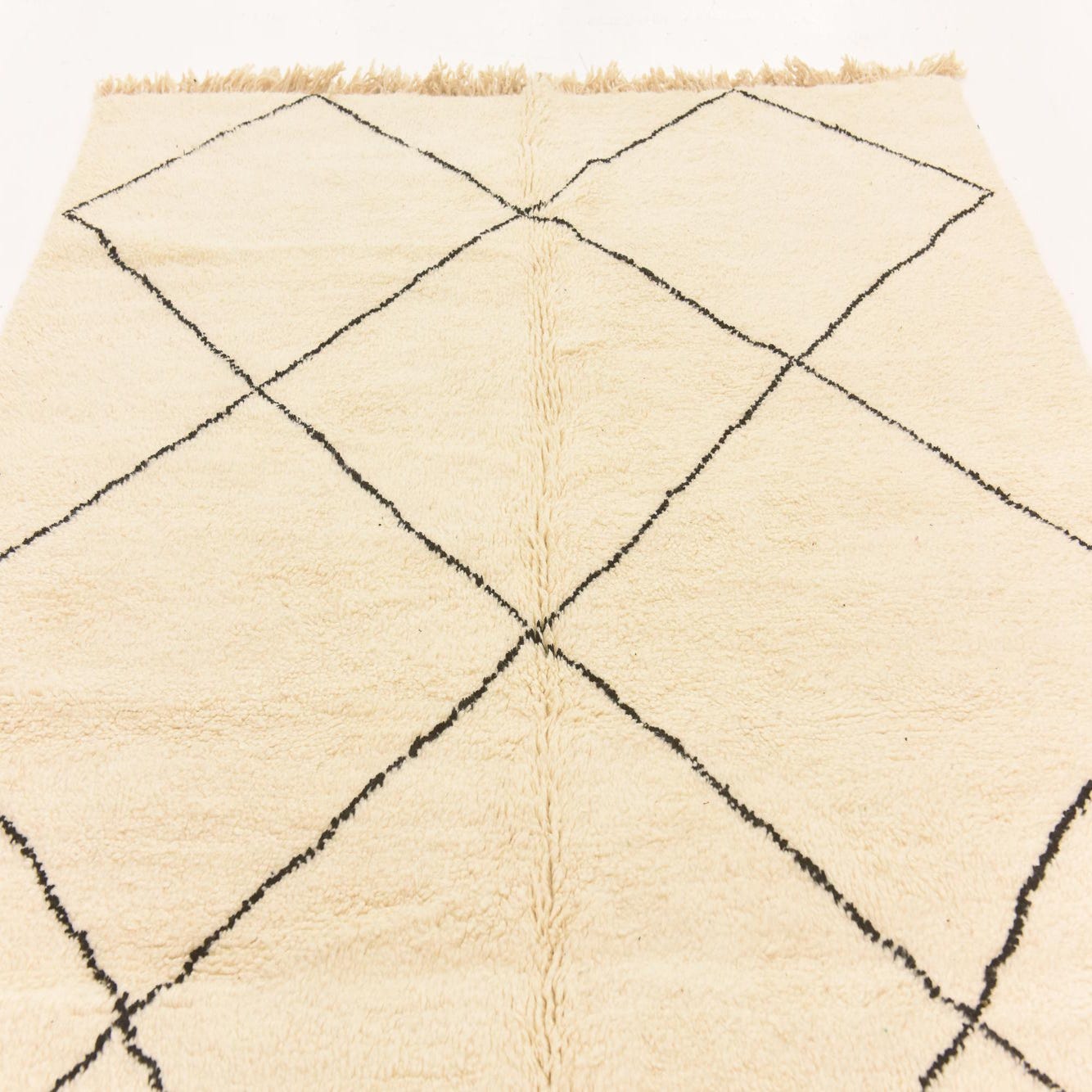 This hand-knotted Moroccan rug, sized at a versatile 6x9, showcases a timeless aesthetic characterized by its simple yet bold geometric pattern. The design features a series of black diamond shapes set against a cream background, providing a striking contrast that is both sophisticated and eye-catching. The texture of the rug is indicative of its 100% wool construction, providing a plush feel underfoot.