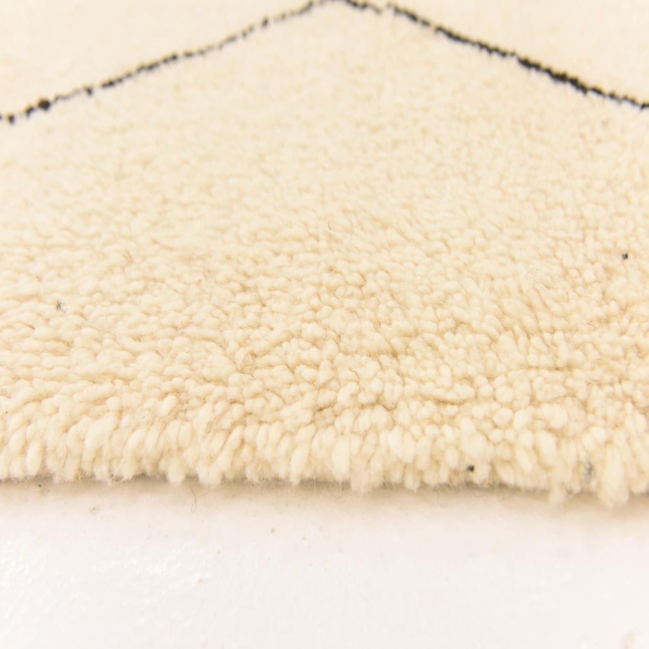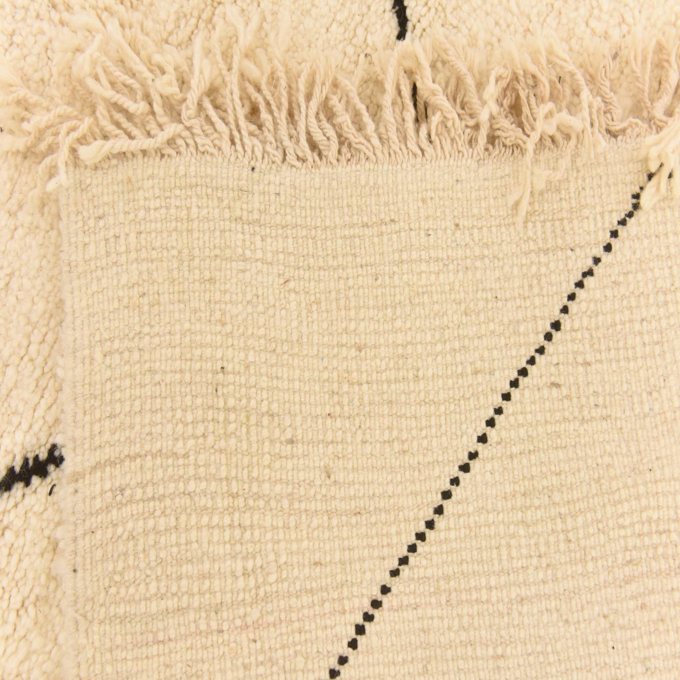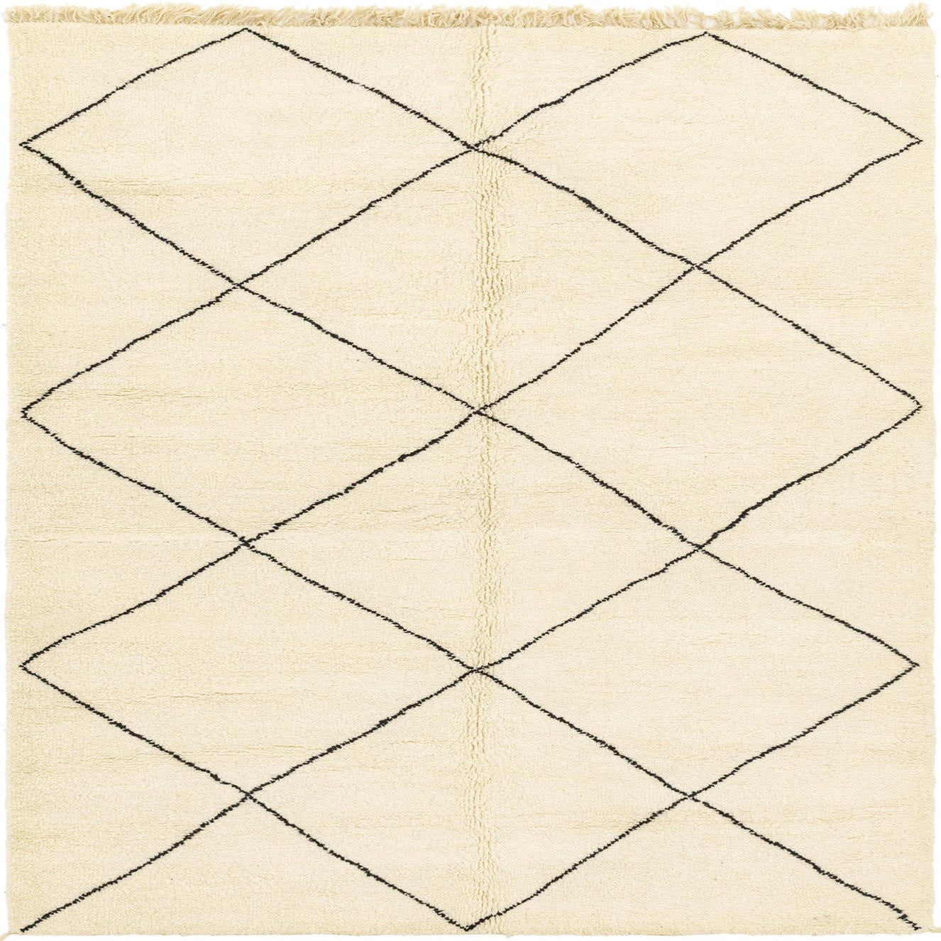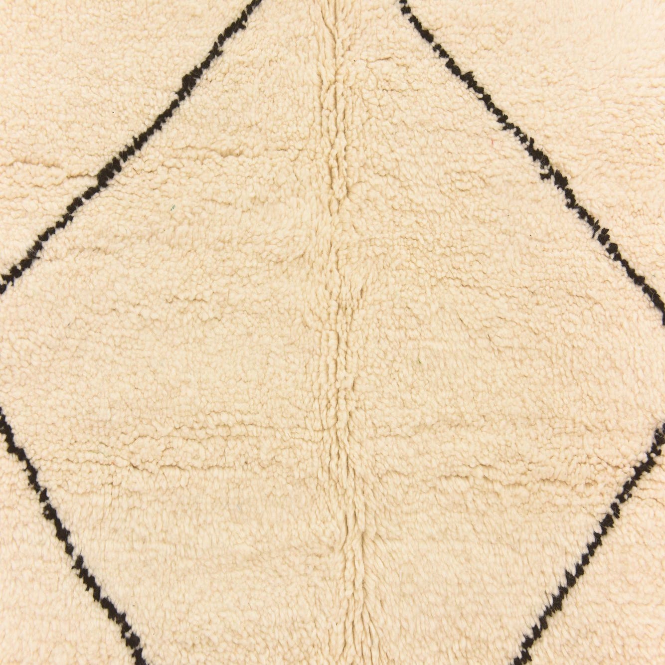 This hand-knotted Moroccan rug, sized at a versatile 6x9, showcases a timeless aesthetic characterized by its simple yet bold geometric pattern. The design features a series of black diamond shapes set against a cream background, providing a striking contrast that is both sophisticated and eye-catching. The texture of the rug is indicative of its 100% wool construction, providing a plush feel underfoot.