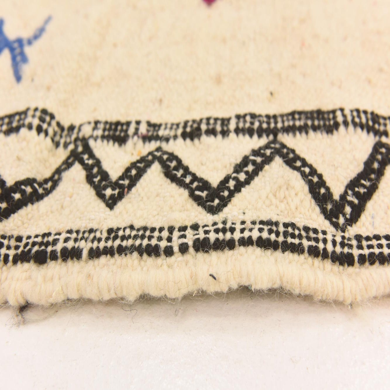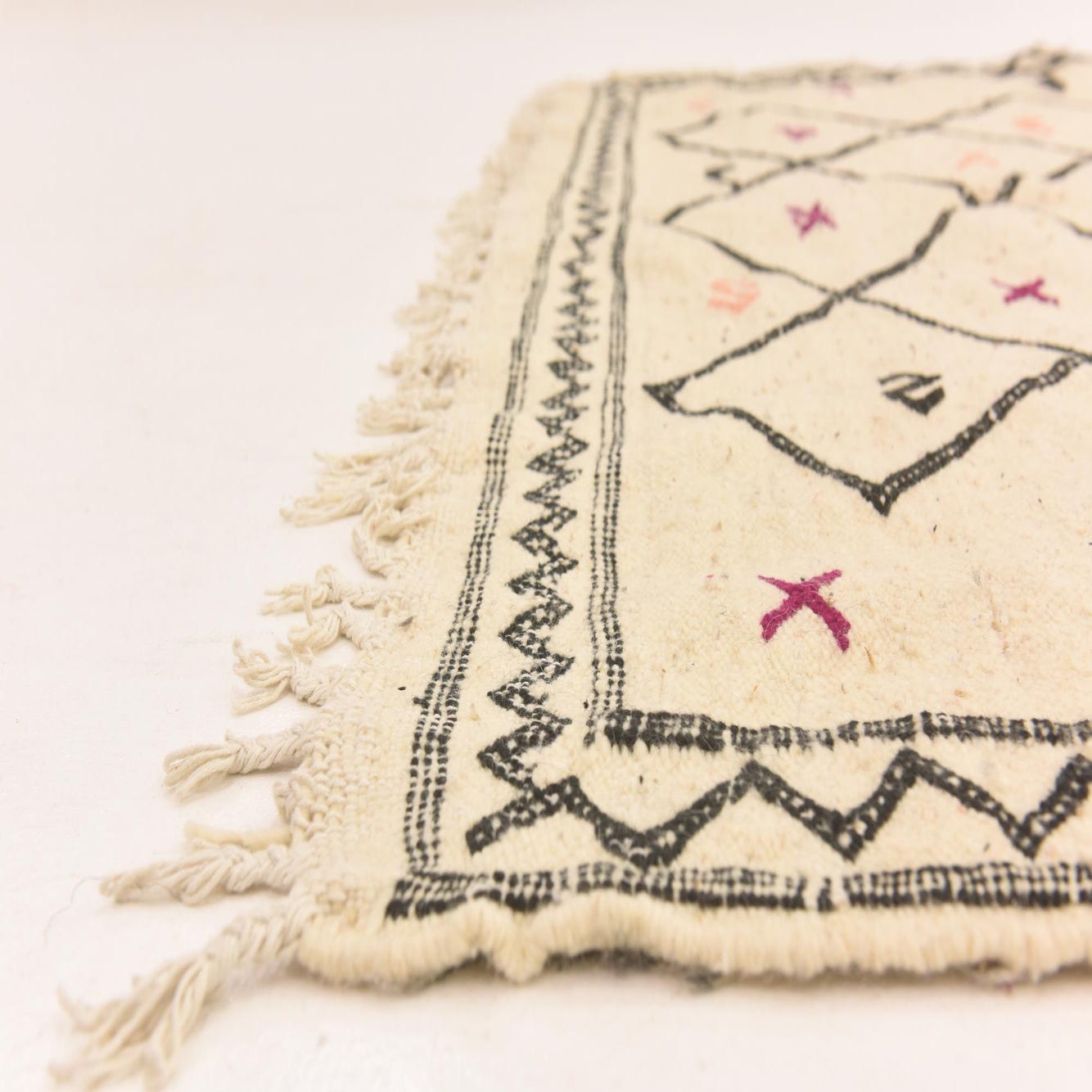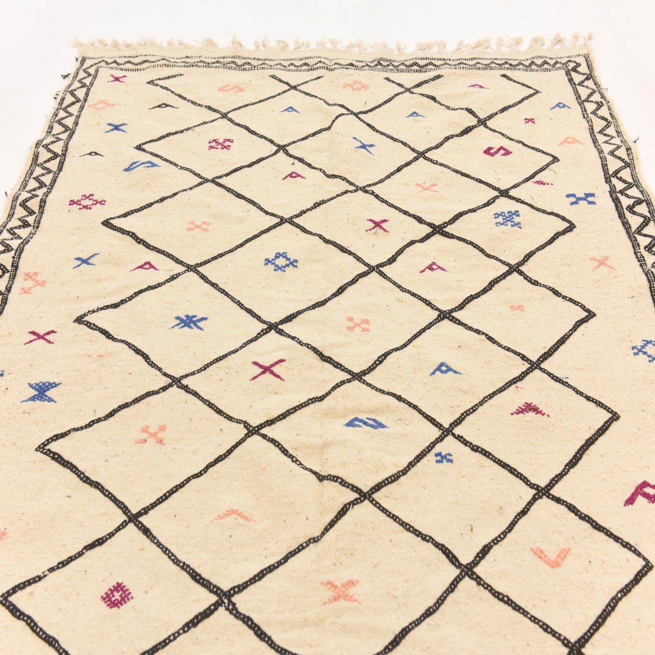 The rug presents a cream background overlaid with a classic diamond lattice pattern in black, providing a versatile foundation for the vibrant accents scattered across its surface. The pops of navy blue, purple, salmon, and maroon create a subtle yet impactful visual interest, reflecting the authentic Moroccan design ethos. The pattern is complemented by traditional fringe detail along the edges, enhancing the authentic feel of the rug.
