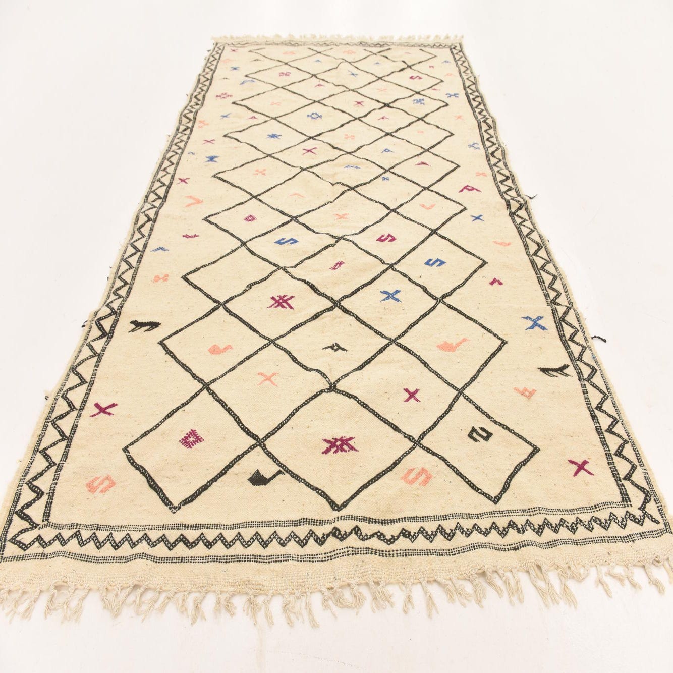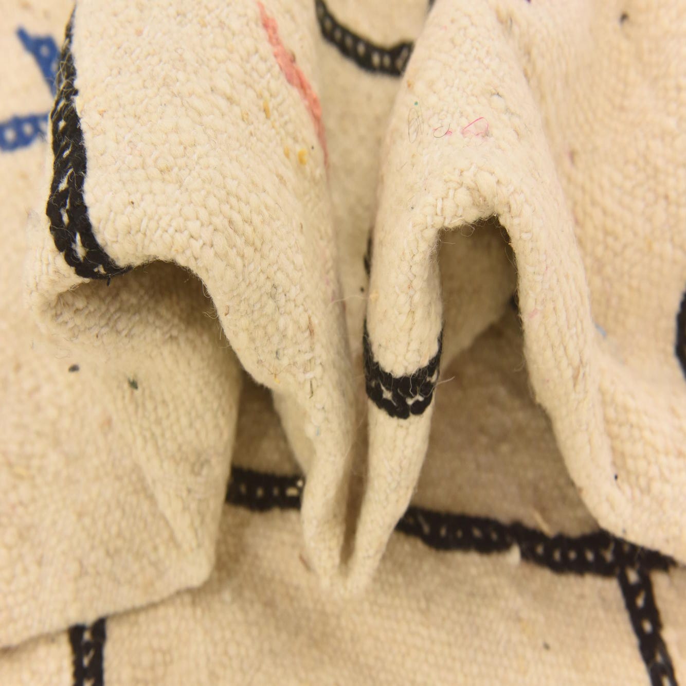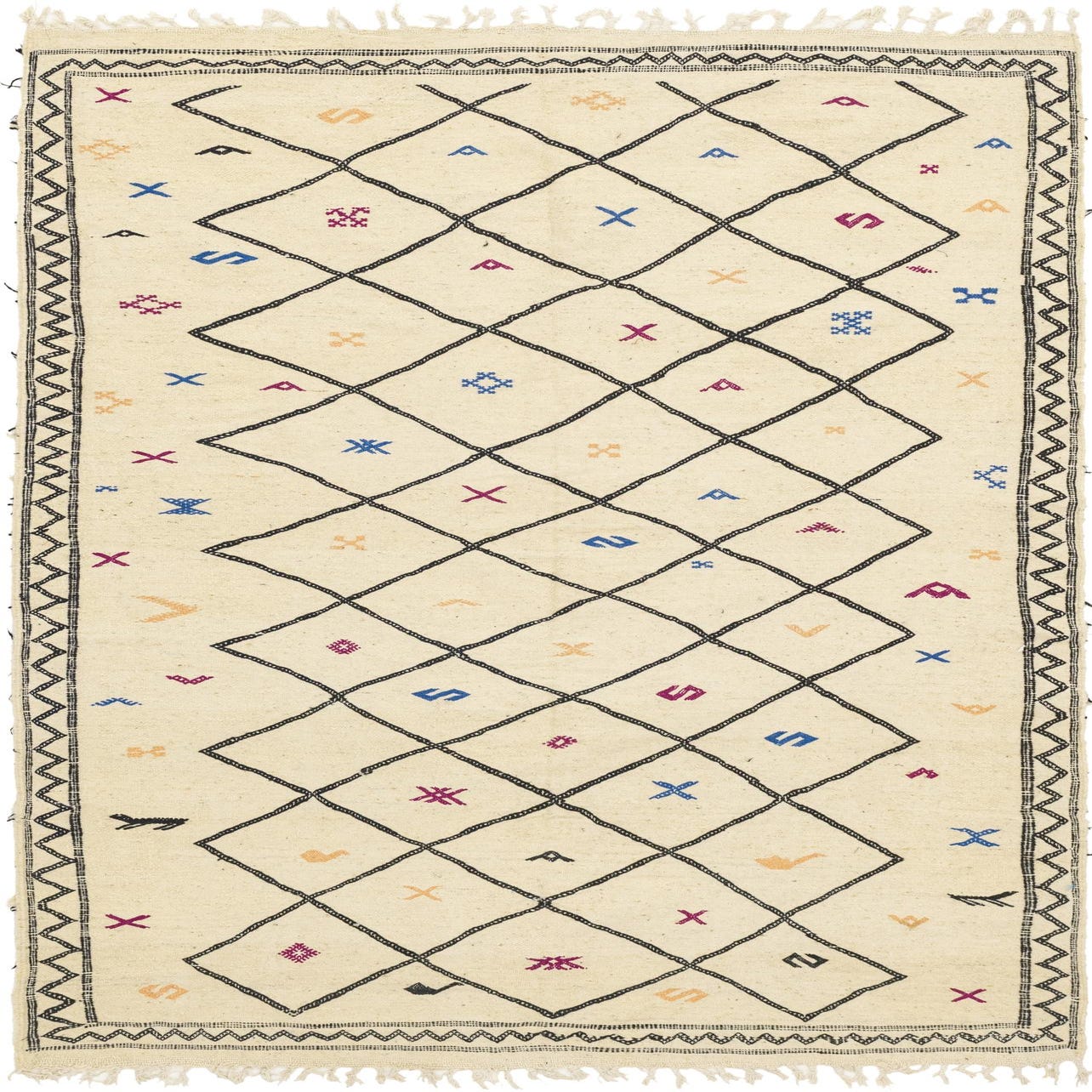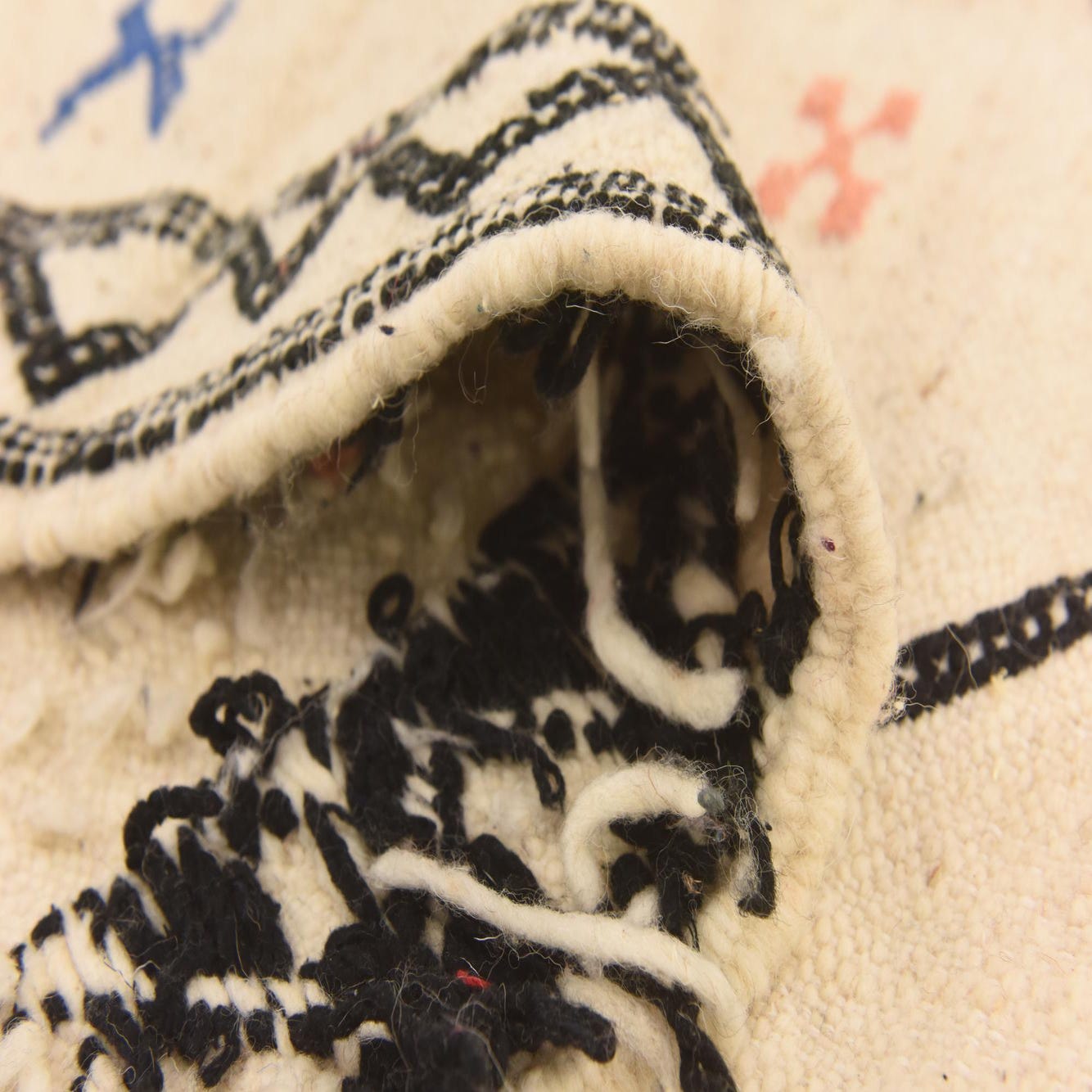 The rug presents a cream background overlaid with a classic diamond lattice pattern in black, providing a versatile foundation for the vibrant accents scattered across its surface. The pops of navy blue, purple, salmon, and maroon create a subtle yet impactful visual interest, reflecting the authentic Moroccan design ethos. The pattern is complemented by traditional fringe detail along the edges, enhancing the authentic feel of the rug.