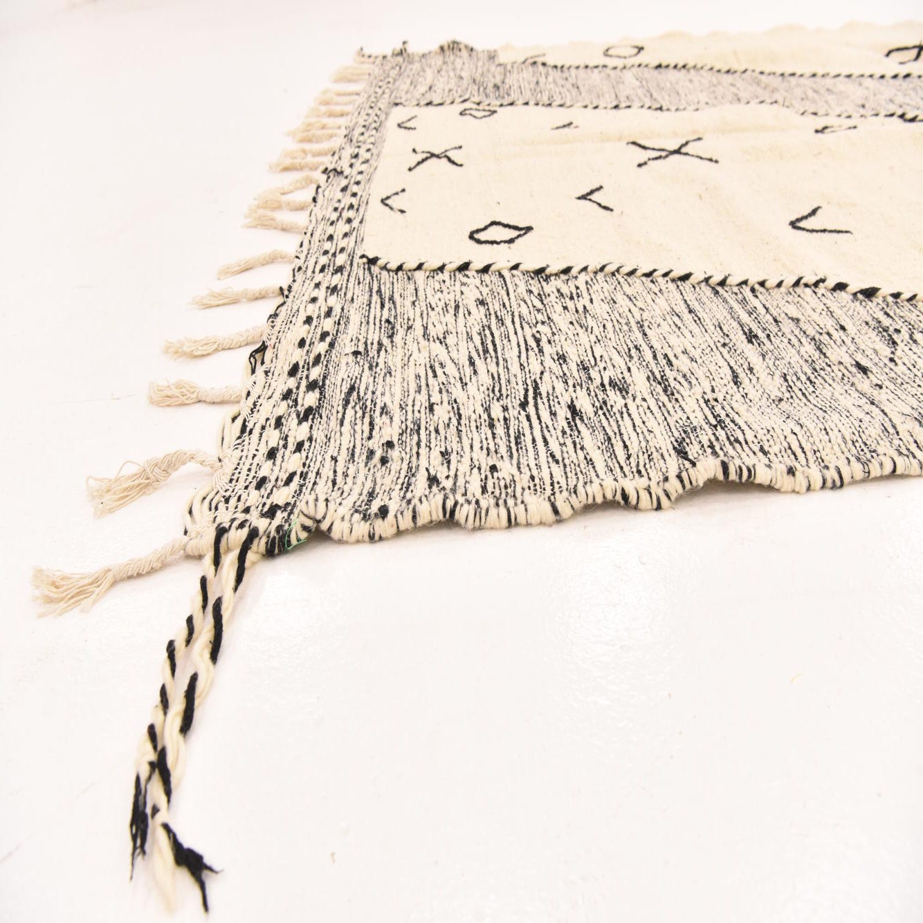 The design features asymmetrical bands of detailed black designs running diagonally across the field, flanked by arrays of primitive symbols that evoke tribal artistry. The rug is completed with black fringes at both ends, enhancing its authentic charm. The wool texture provides a natural softness, contributing to the piece's inviting warmth.
