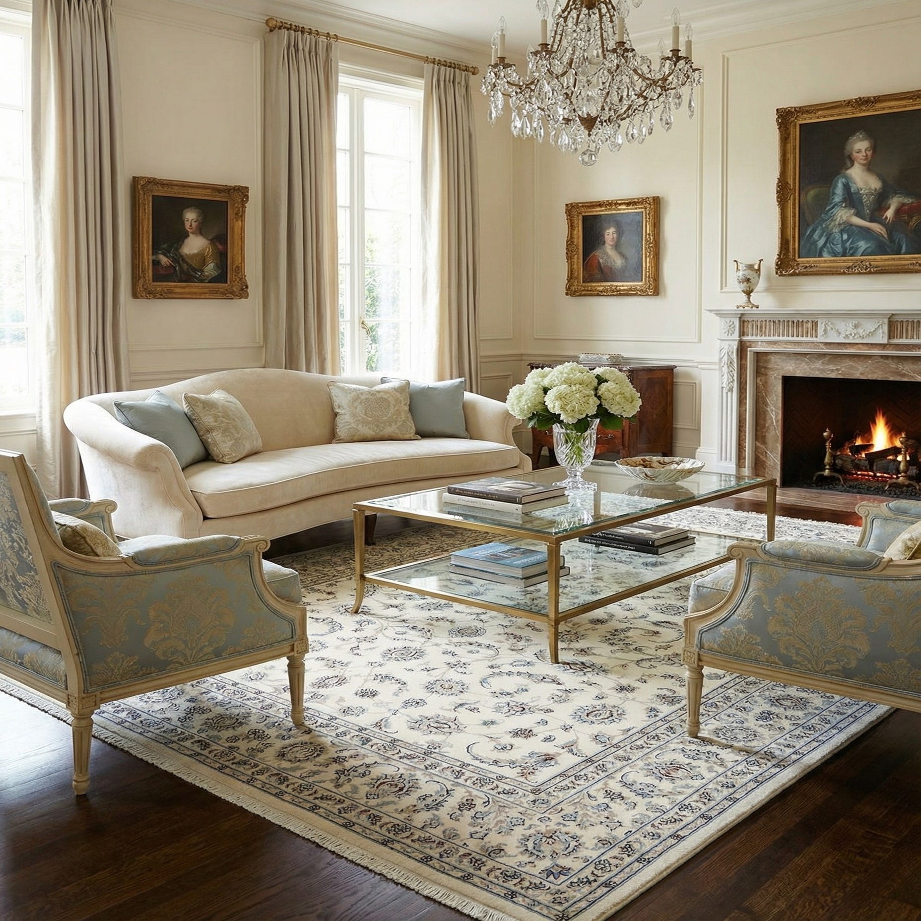 A 6x9 rectangular ivory Persian rug with intricate floral and medallion patterns in blue, brown, and cream, featuring a thin pile and fringe.
