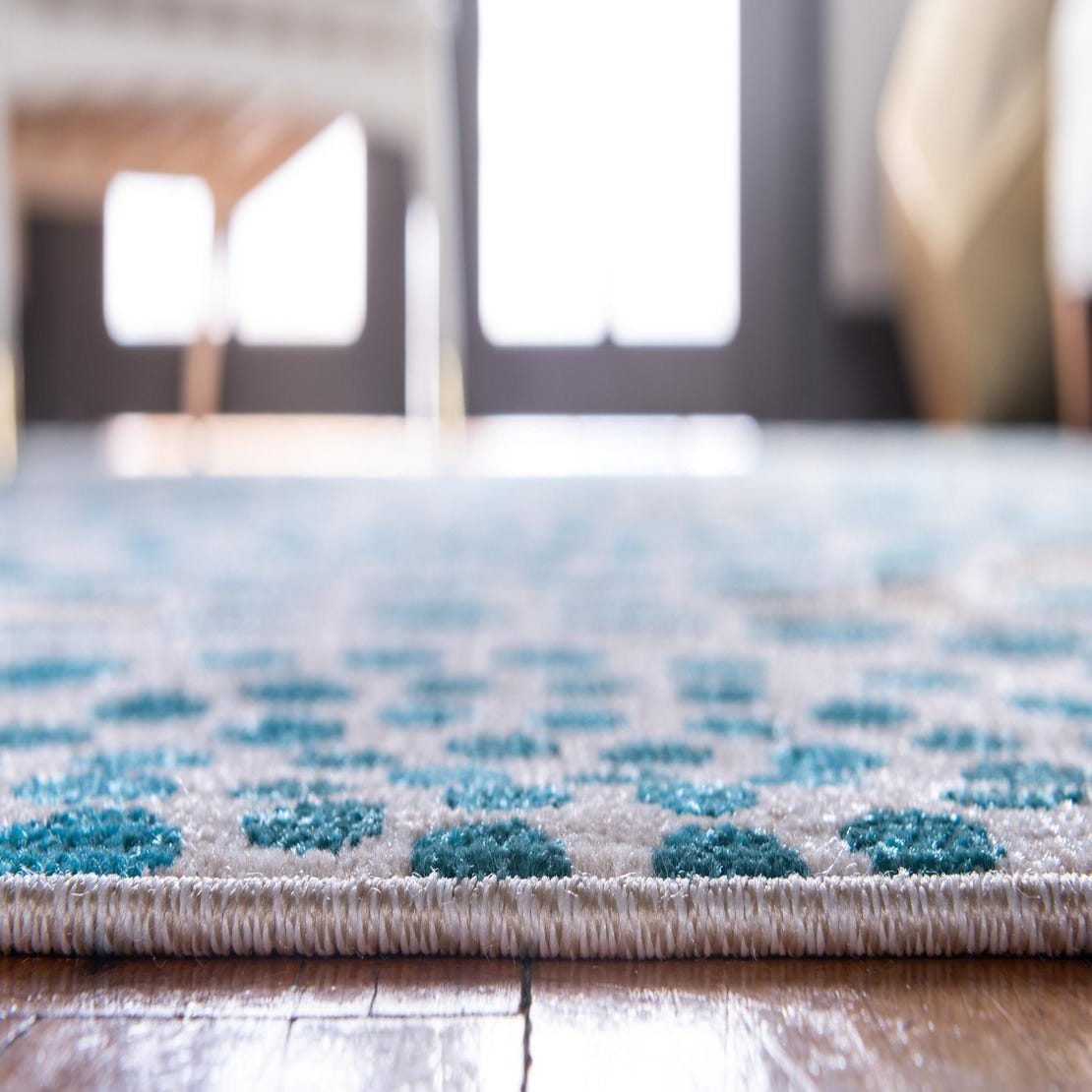 Primary color is Cream. Colors in this rug include: Cream, Teal.