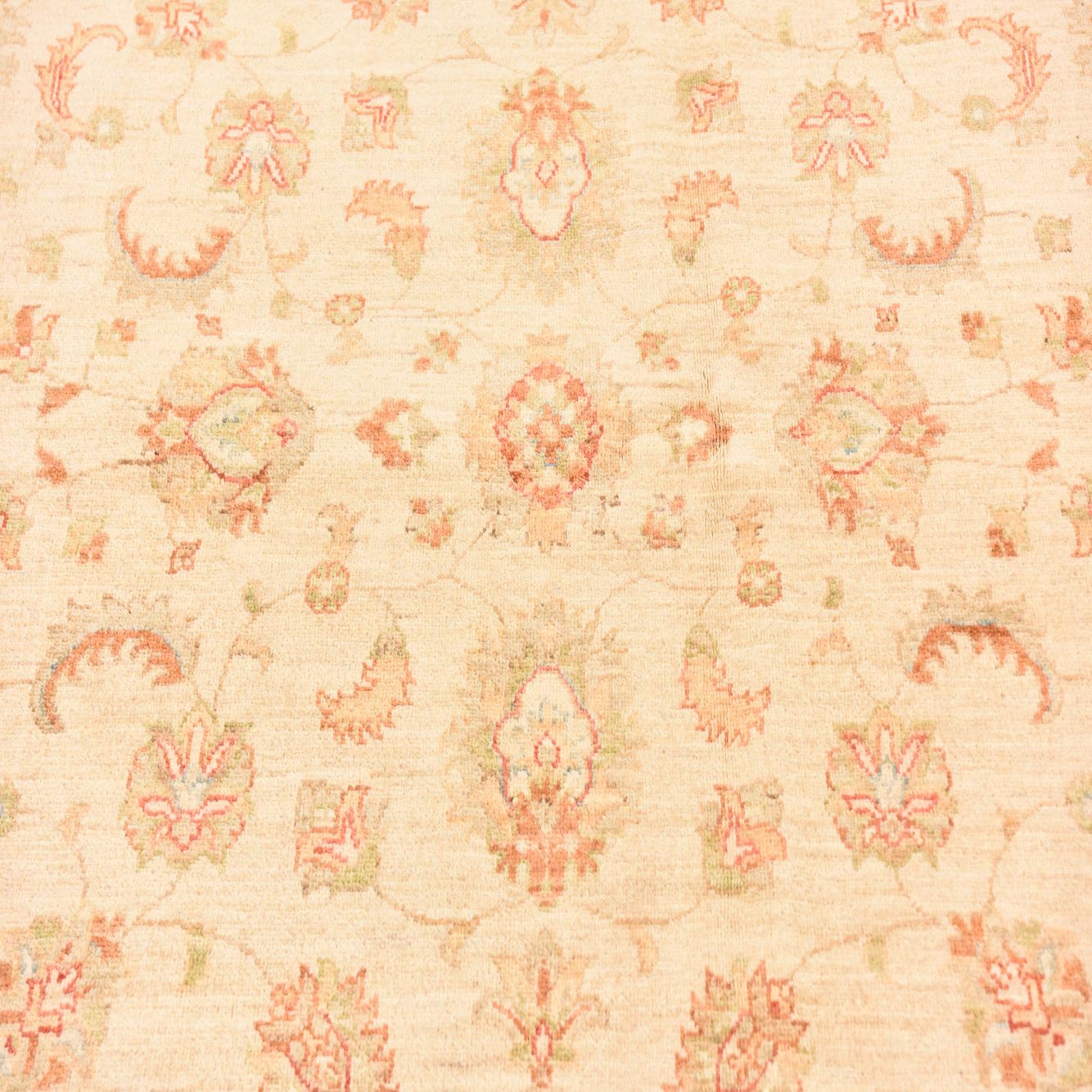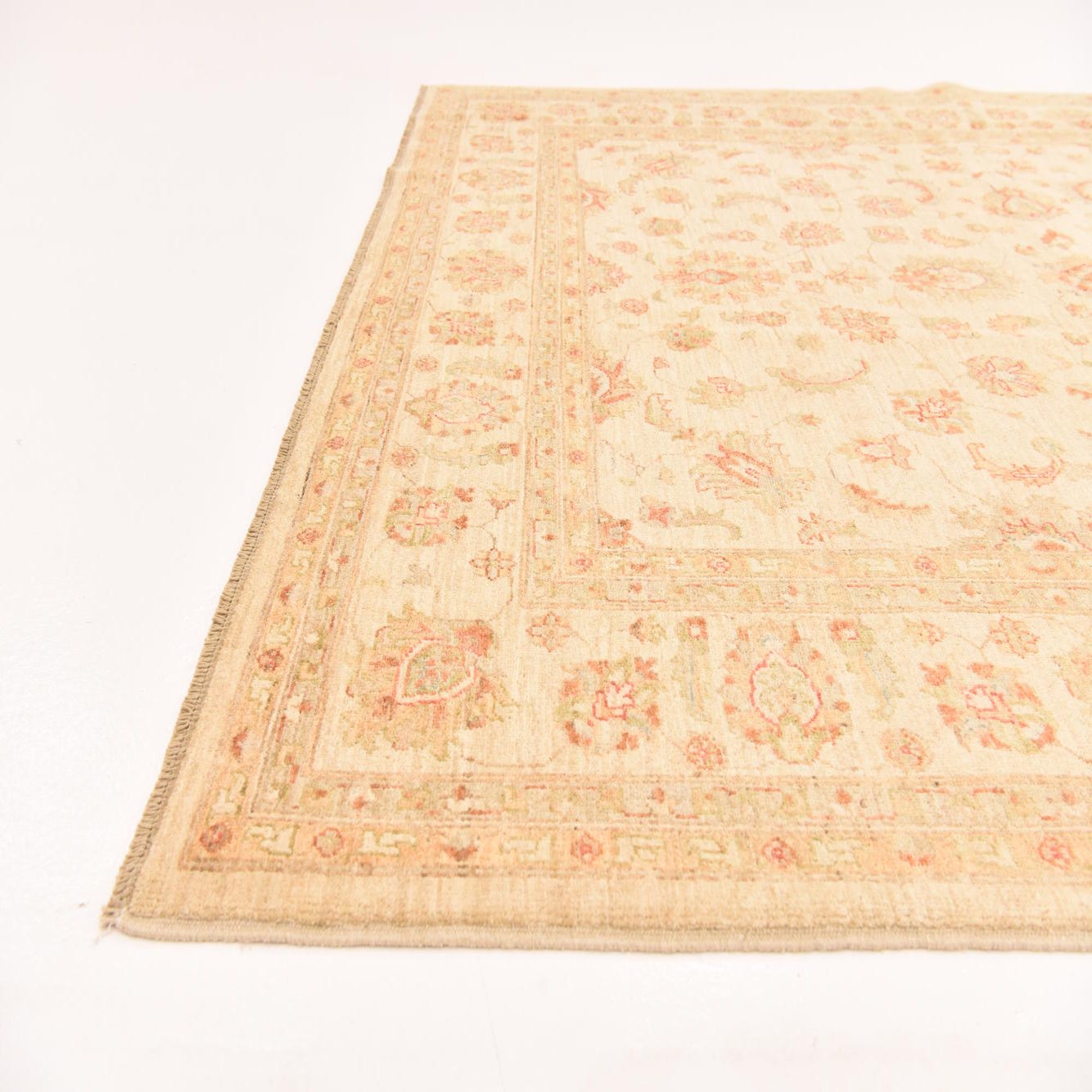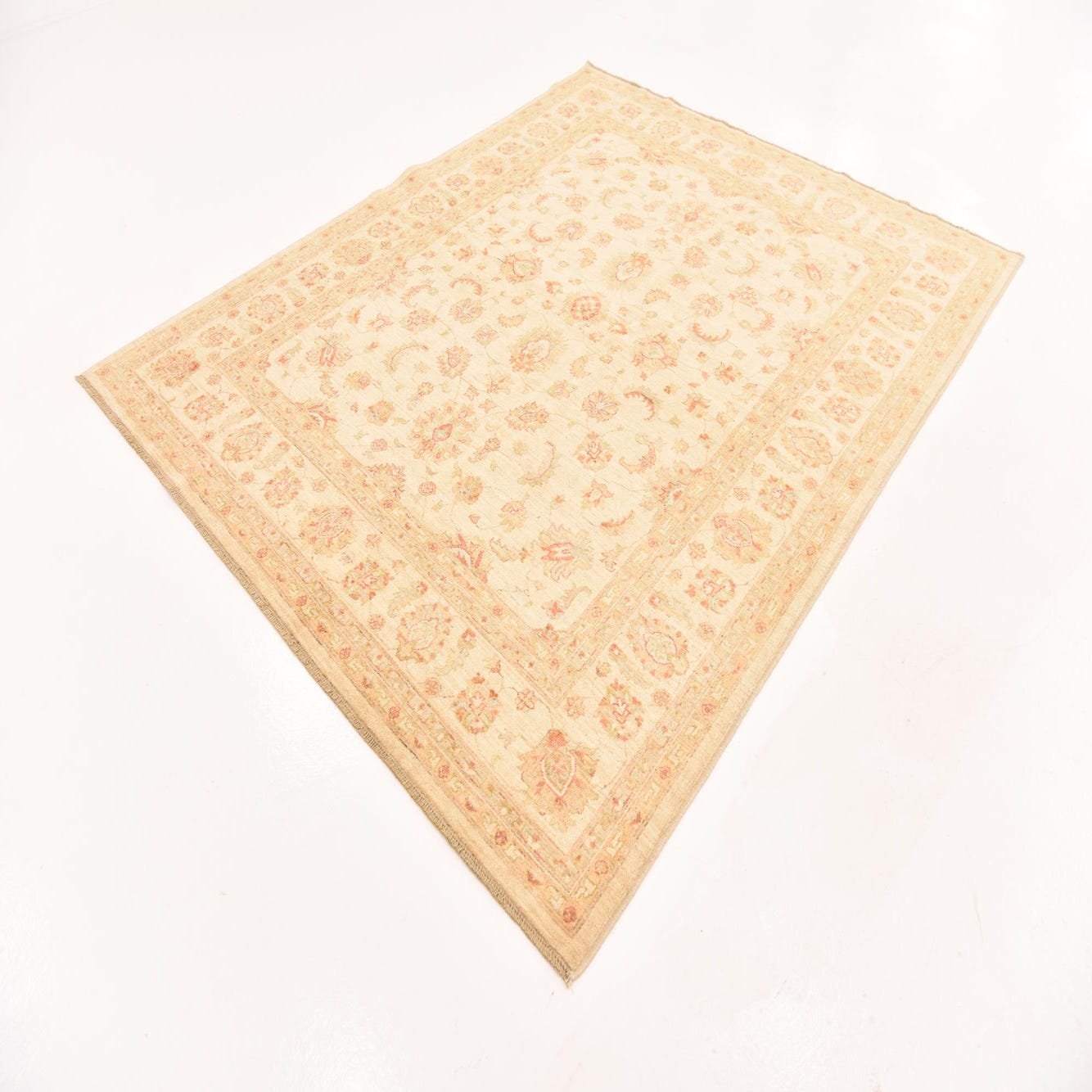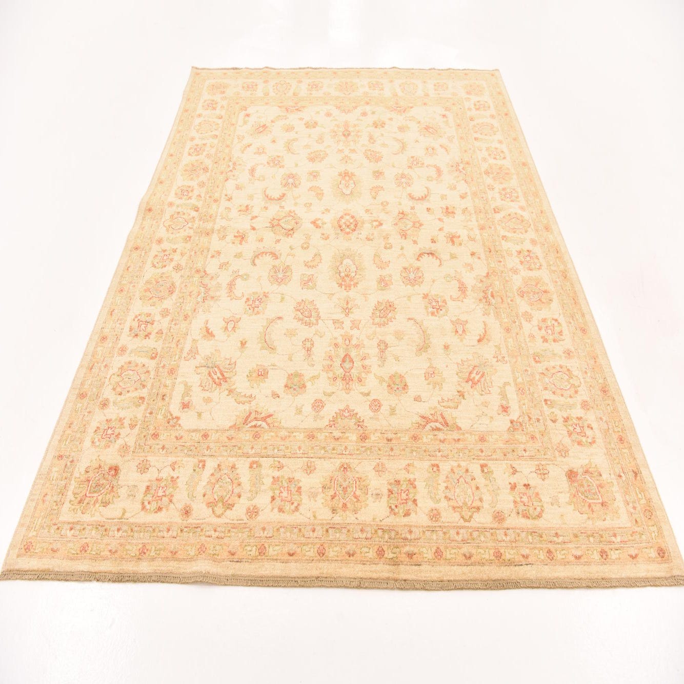 This Peshawar Ziegler rug, measuring 6x9, is hand-knotted with 100% hand-spun wool, offering a tactile surface with a notable texture. Its intricate pattern is hallmarked by traditional motifs, which are harmoniously distributed across the cream background. The gentle presence of beige, light green, olive, tan, and terracotta hues provides a subtle yet effective color palette that complements the rug's overall design. Additionally, the fringe detailing on the ends adds a classic touch to its aesthetic.