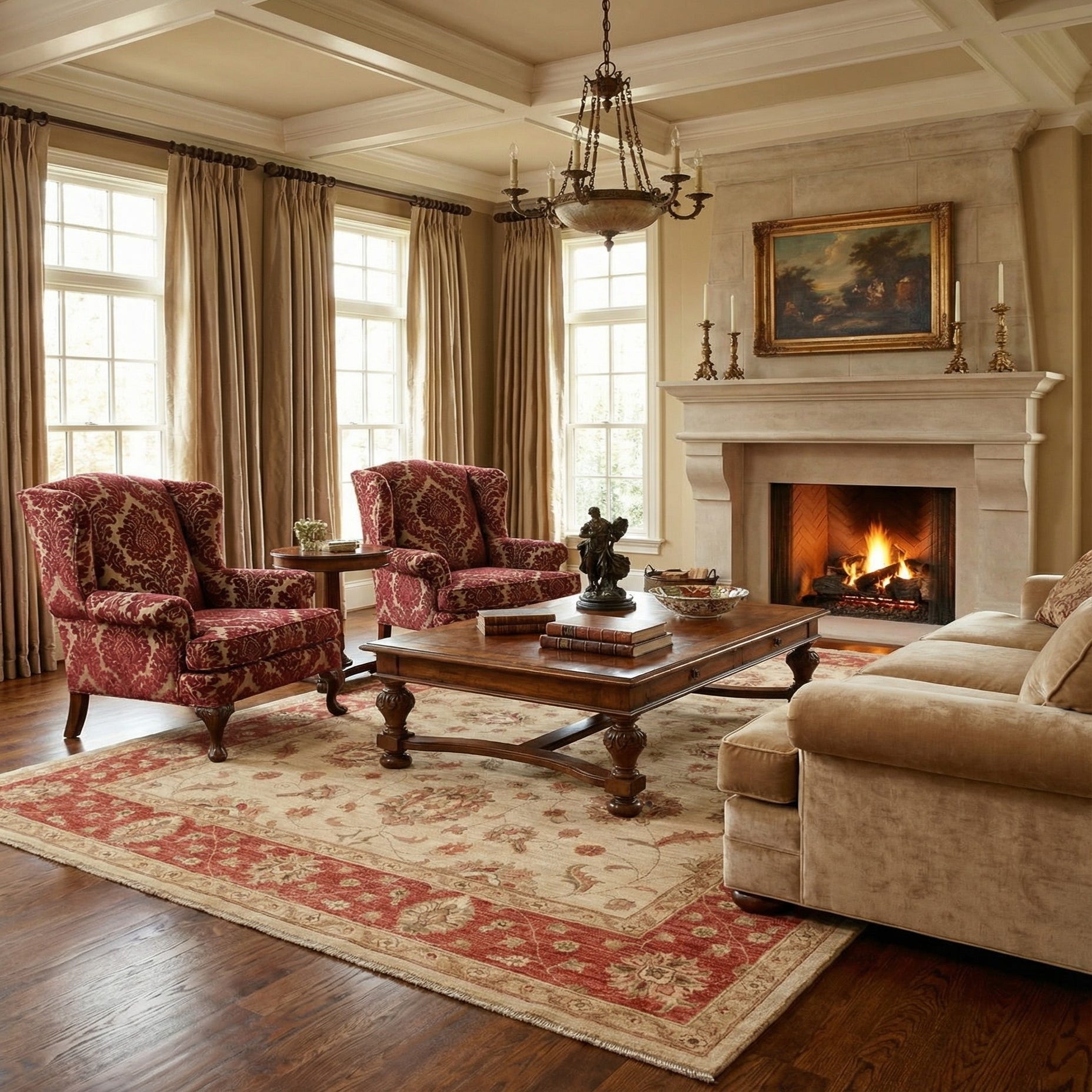 A 6x9 rectangular ivory and red traditional Peshawar Ziegler rug with a botanical floral pattern, ideal for a living room.