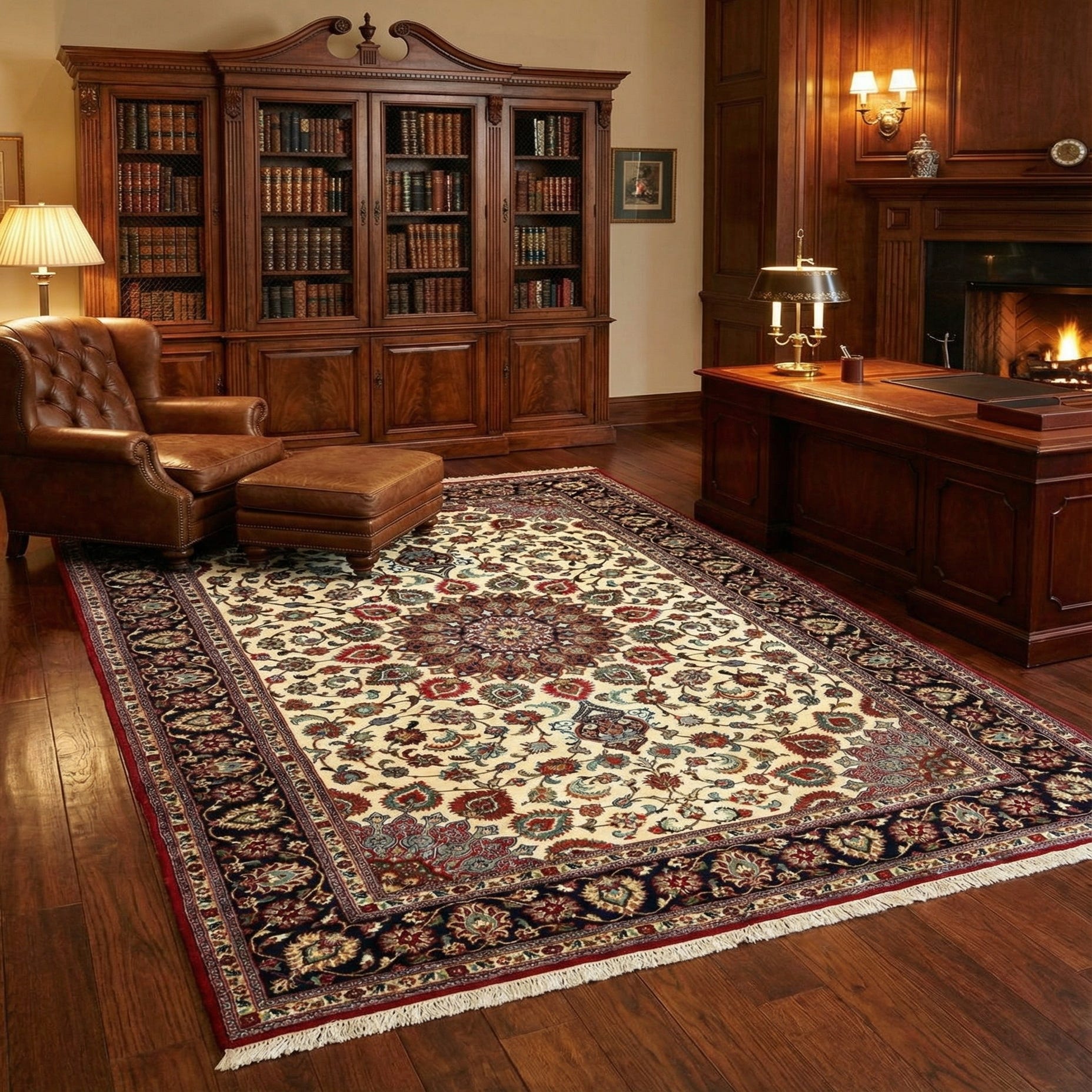 A 6x9 rectangular Qom Persian rug with an ivory field, intricate floral patterns, and a dark border, suitable for a living room.