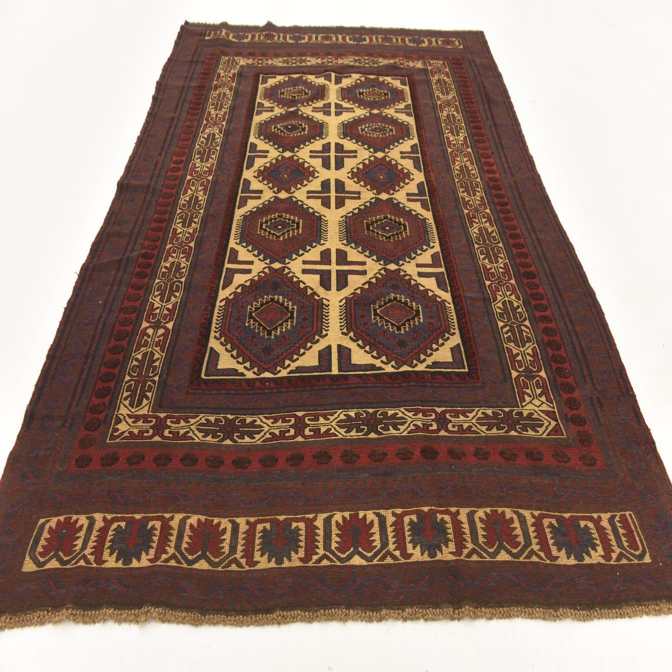 Primary color is Cream. Colors in this rug include: Cream, Beige, Black, Brown, Green, Red, Tan.