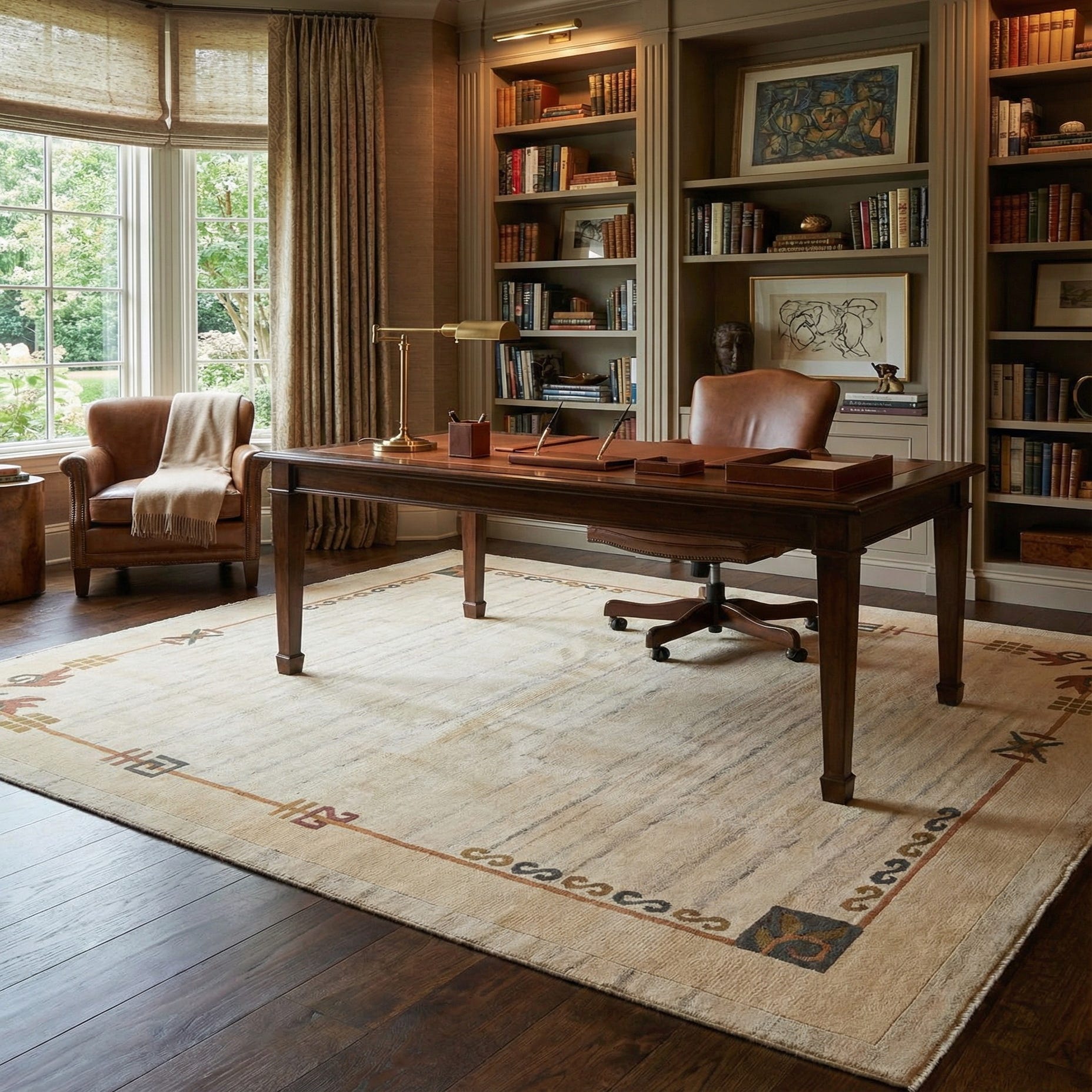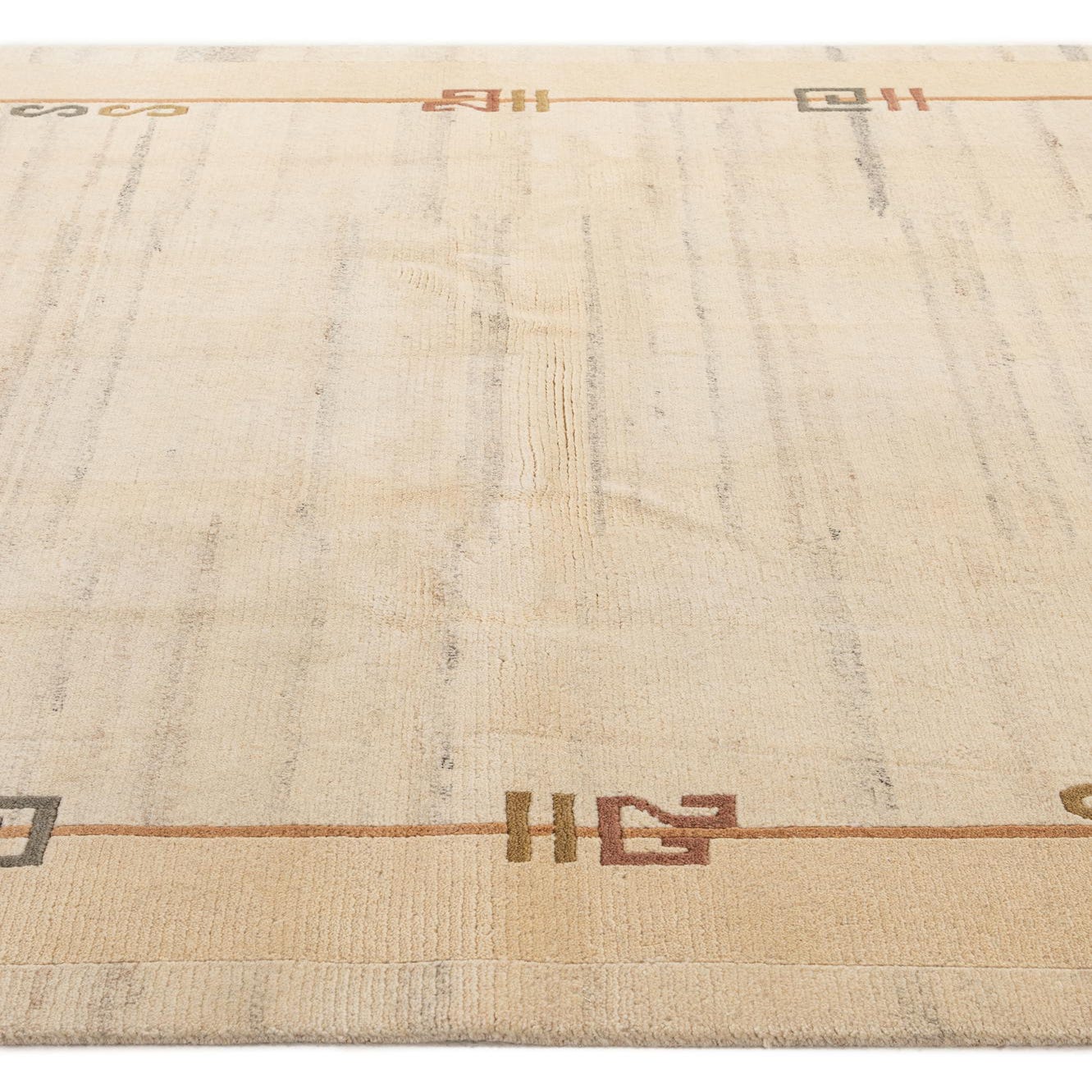 A 6x9 rectangular ivory wool rug with a modern oriental border featuring geometric and stylized floral motifs in brown, rust, and gold.