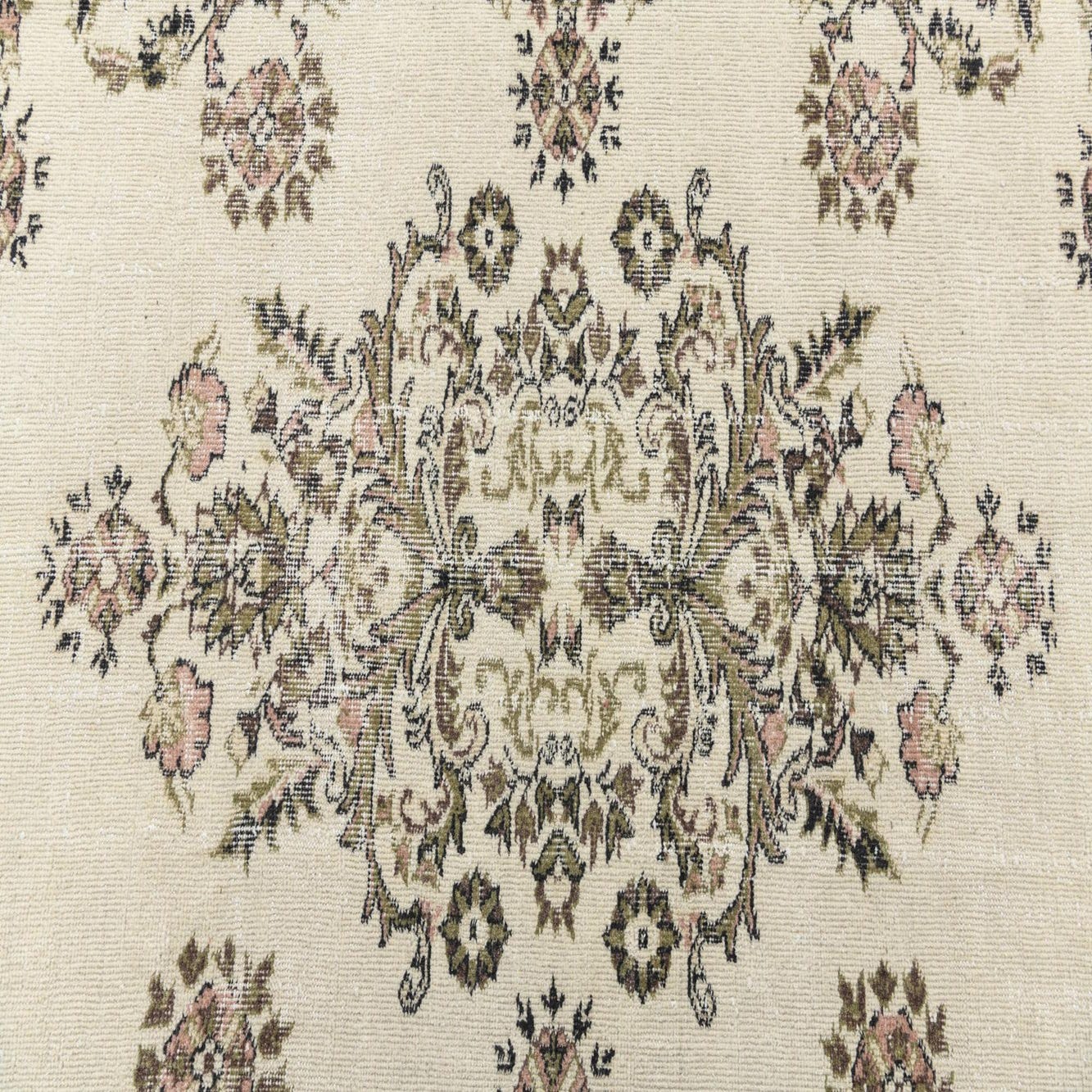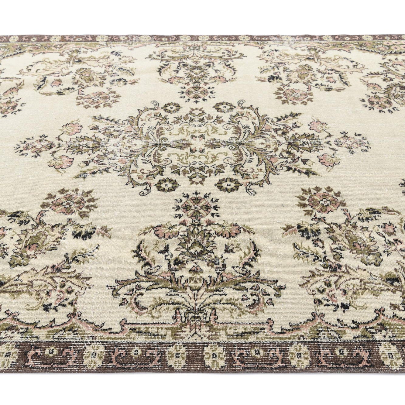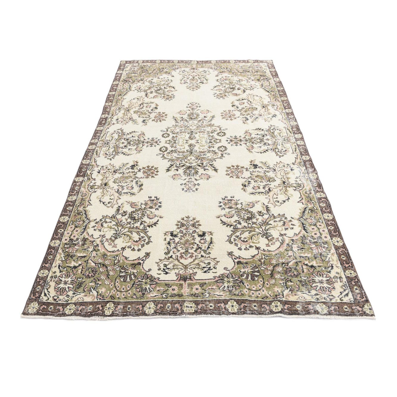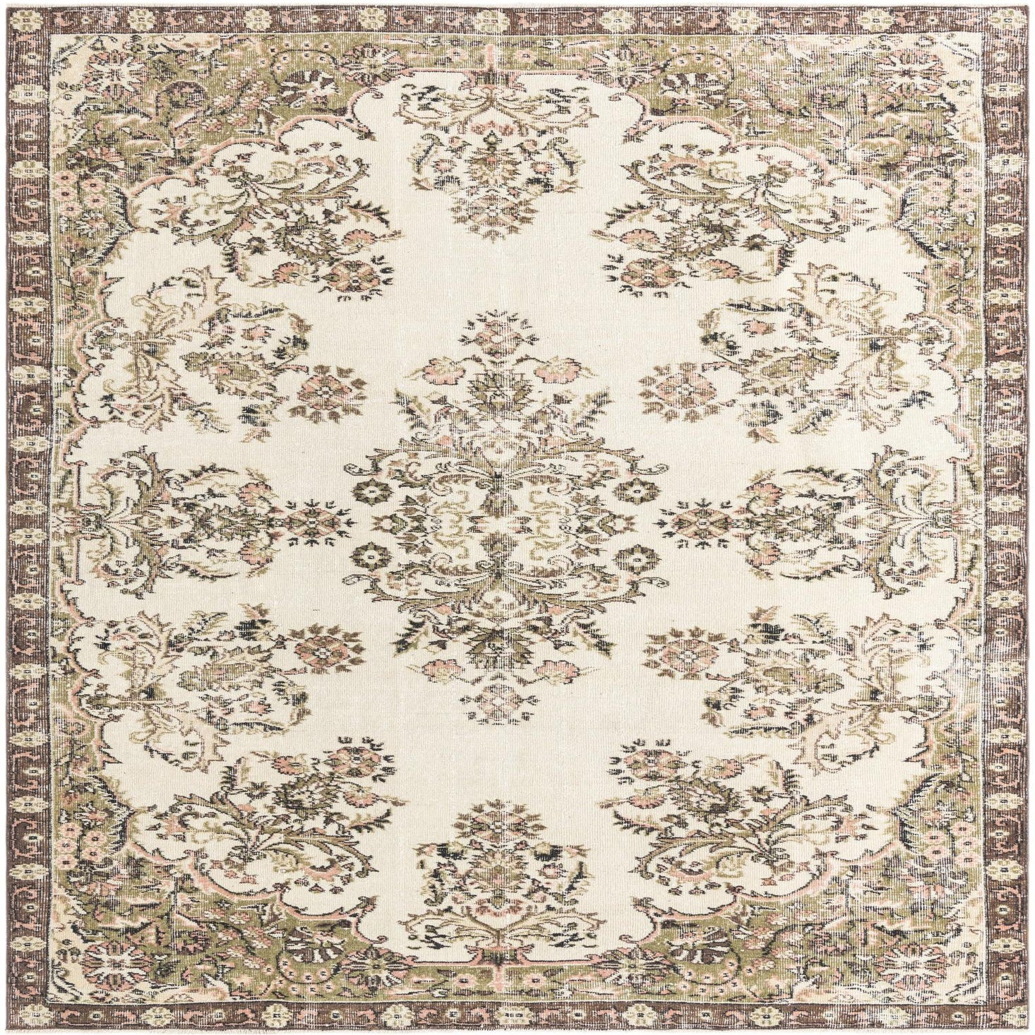 A 6x9 rectangular ivory and cream wool rug with a distressed Persian floral pattern and a dark brown border, suitable for a living room.