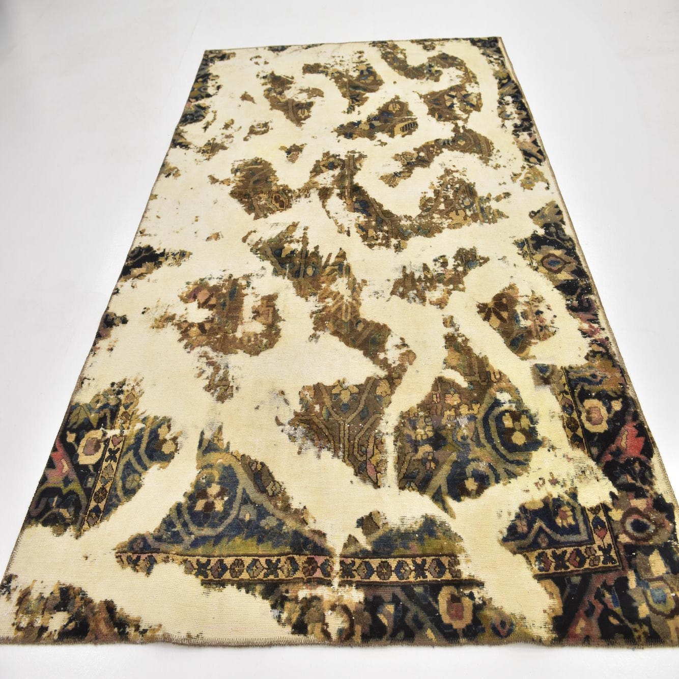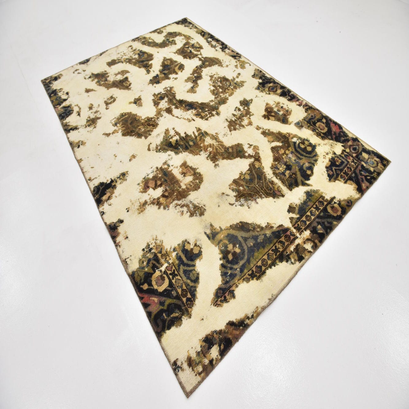 This Persian Ultra Vintage rug is an antique Persian Rug that has been washed, over-dyed, and then shaved down to a low pile. Look at the detail pictures to fully appreciate the uniqueness of this piece.