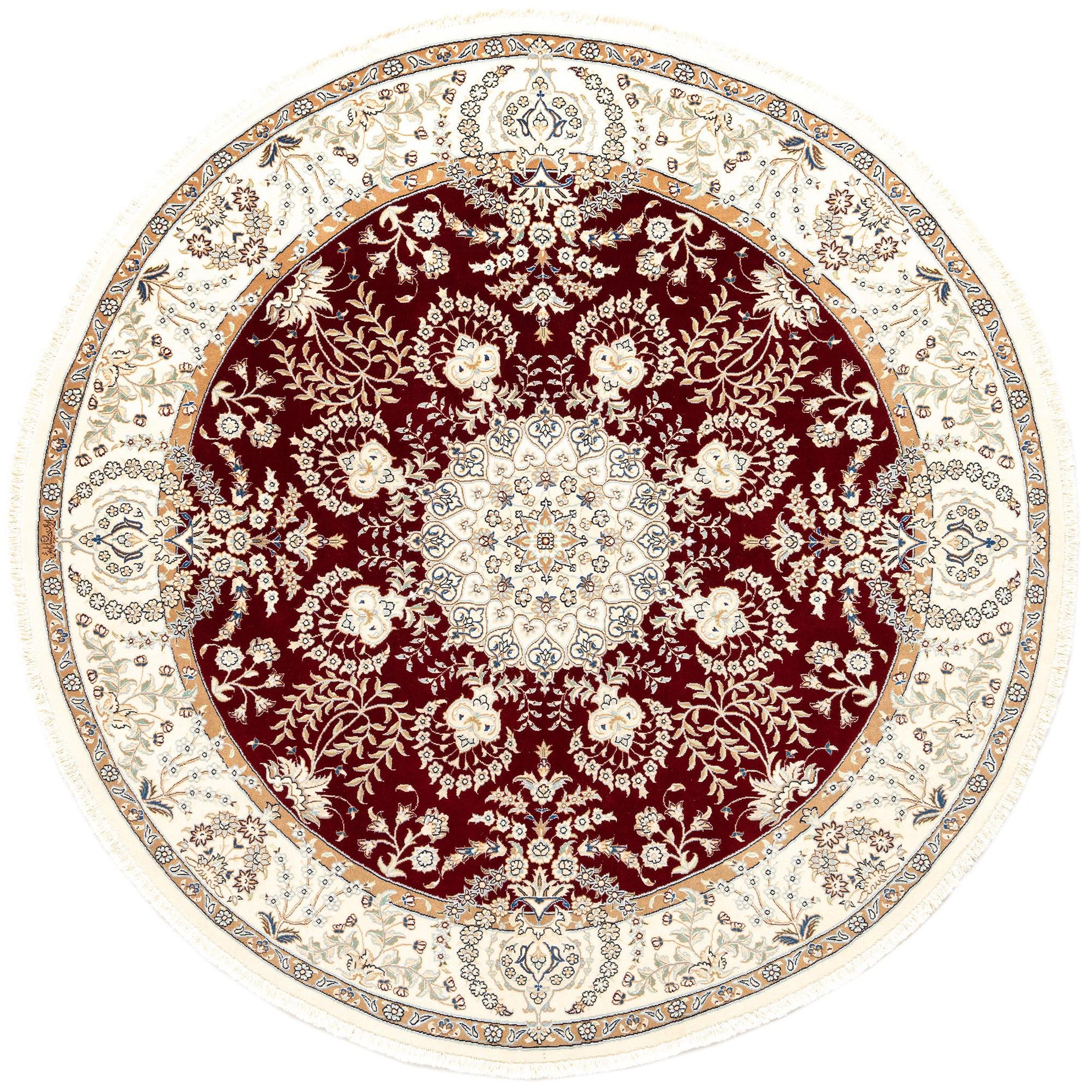 A round Persian rug, 6' 7 x 6' 7, featuring a rich ivory and cream medallion pattern on a deep red field, with fringed edges.