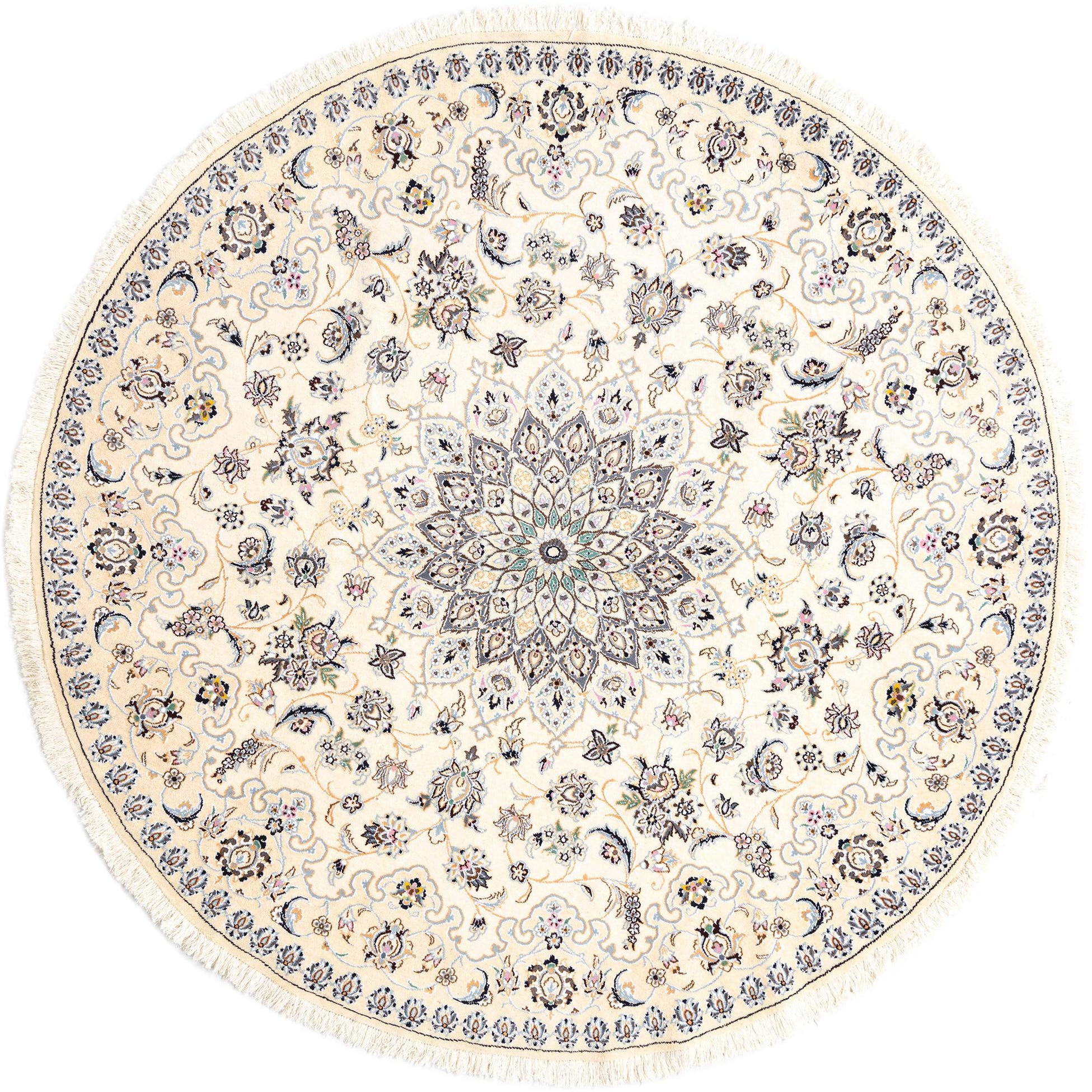 The Nain Collection rug is a handcrafted piece made of 100% fine wool that delivers both quality and detailed design. This 7 Ft Round rug features an intricate central medallion surrounded by a harmonious blend of floral and curvilinear motifs. The rug's pattern is sophisticated, boasting a rich palette of cream, beige, dark blue, grey, yellow, and brown, all set against a cream background that enhances the clarity of the design. The texture is plush, providing a soft underfoot experience, while the detailed patterns add visual interest and a sense of enduring elegance.