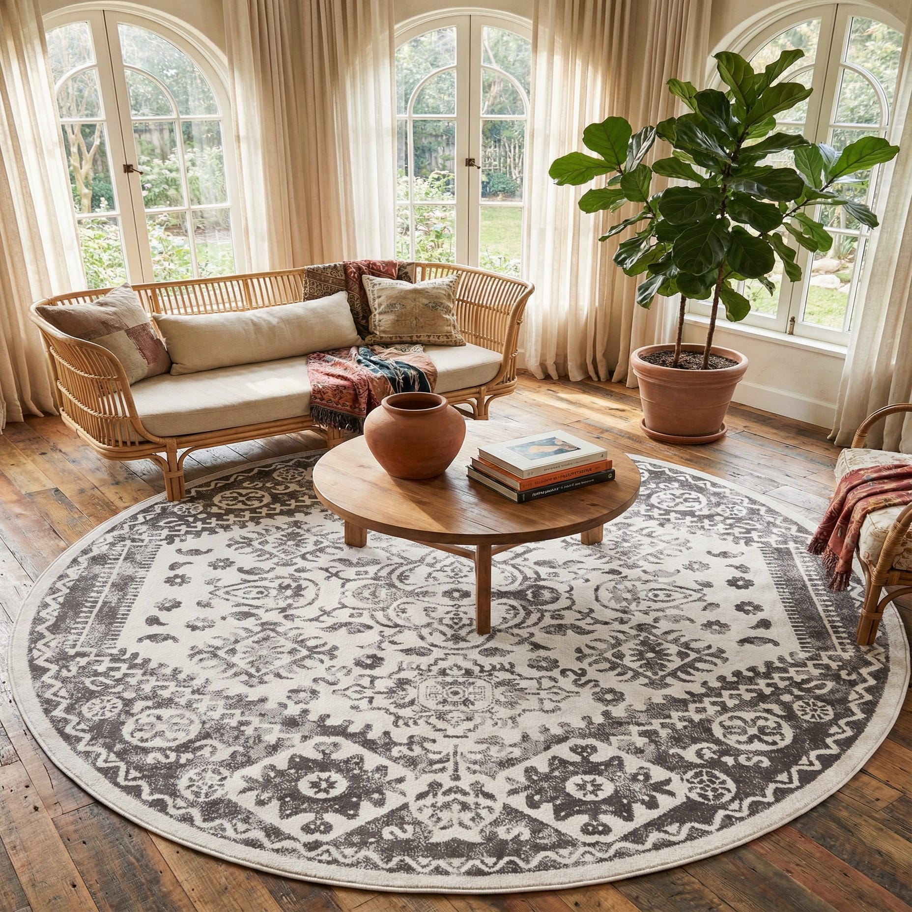 A 7' round ivory and gray Bohemian rug with a distressed medallion pattern and ornate border.