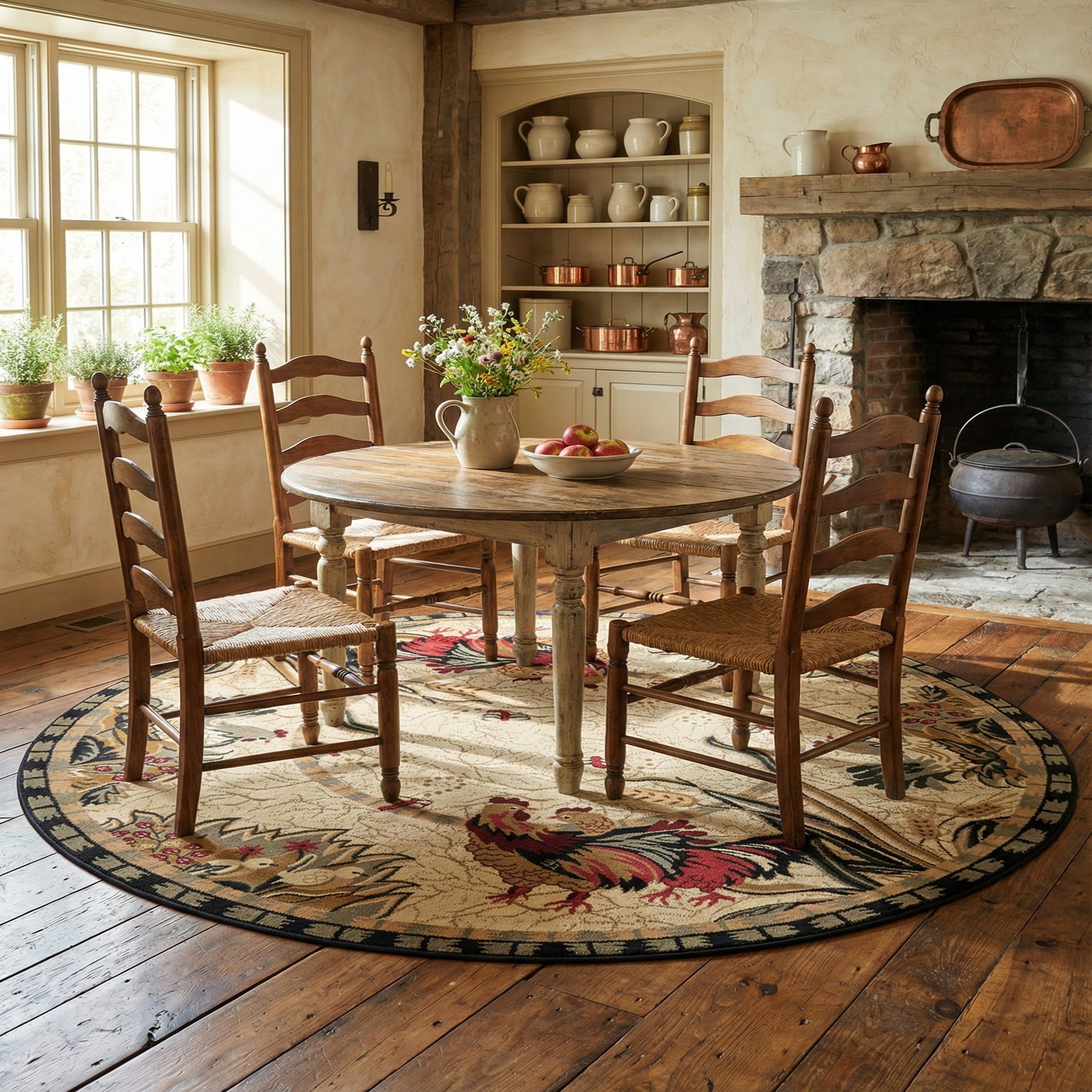 The Pastoral collection rug offers a charming blend of bucolic charm and robust functionality. This 7-foot round area rug features a cream background, artfully complemented by a palette that includes black, green, light brown, red, rust red, and tan. The pattern presents a rustic tableau of flora and fauna, with prominent rooster motifs that evoke a country estate's elegance.