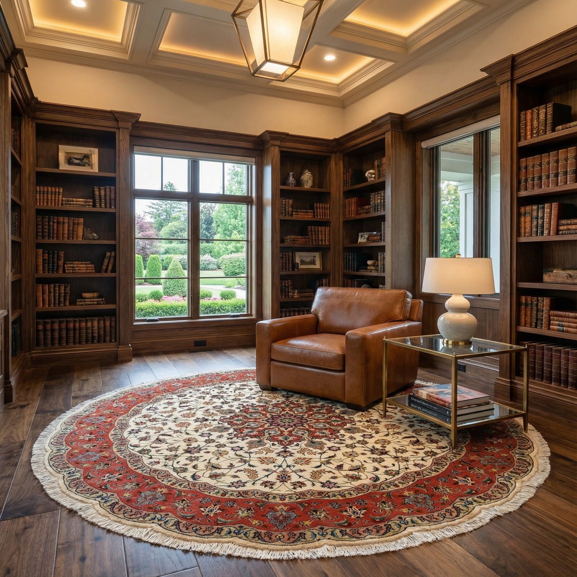A round 6' 7" ivory Persian rug with a detailed red floral border and central medallion.