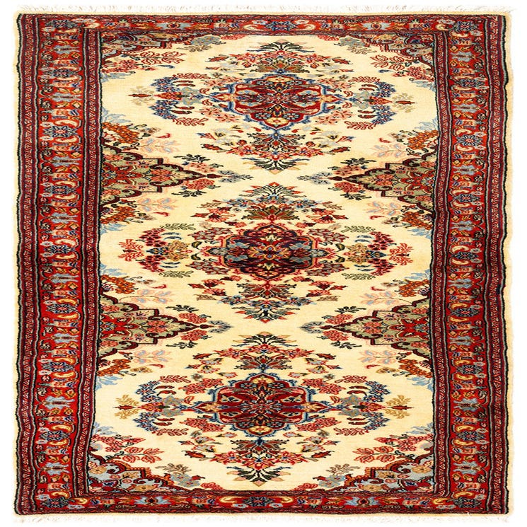 A 7 ft ivory runner rug with a traditional Persian floral pattern in red, blue, and gold, perfect for a hallway.