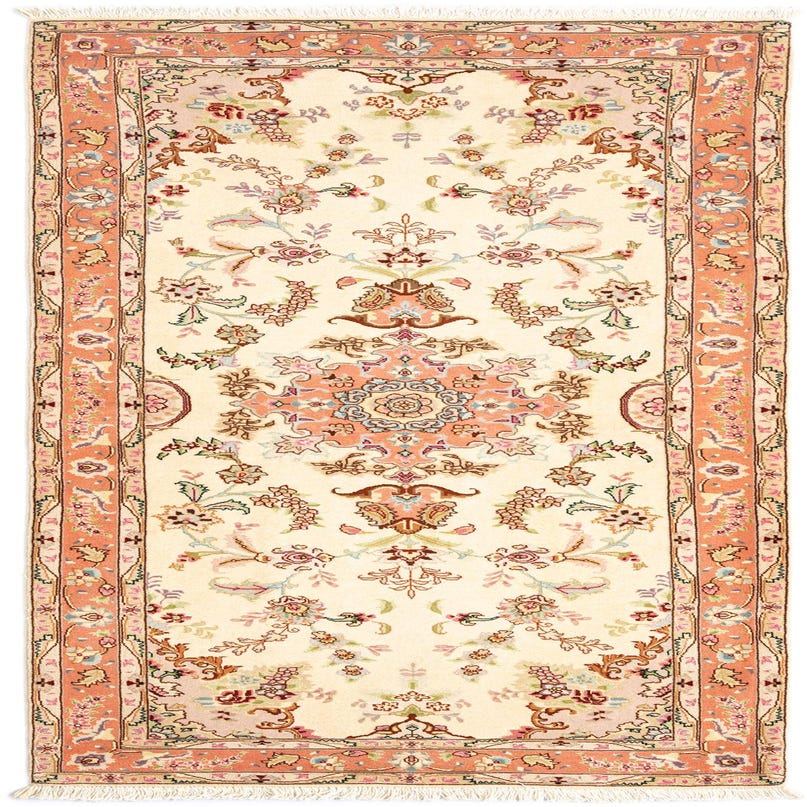 The Tabriz collection showcases a hand-made runner crafted with a blend of wool and silk, measuring 7 feet in length. This piece features a traditional design with a central medallion and intricate floral and vine patterns throughout. The soft cream background is elegantly complemented by a palette that includes shades of pink, purple, olive, and grey, providing a subtle yet vibrant color scheme.
