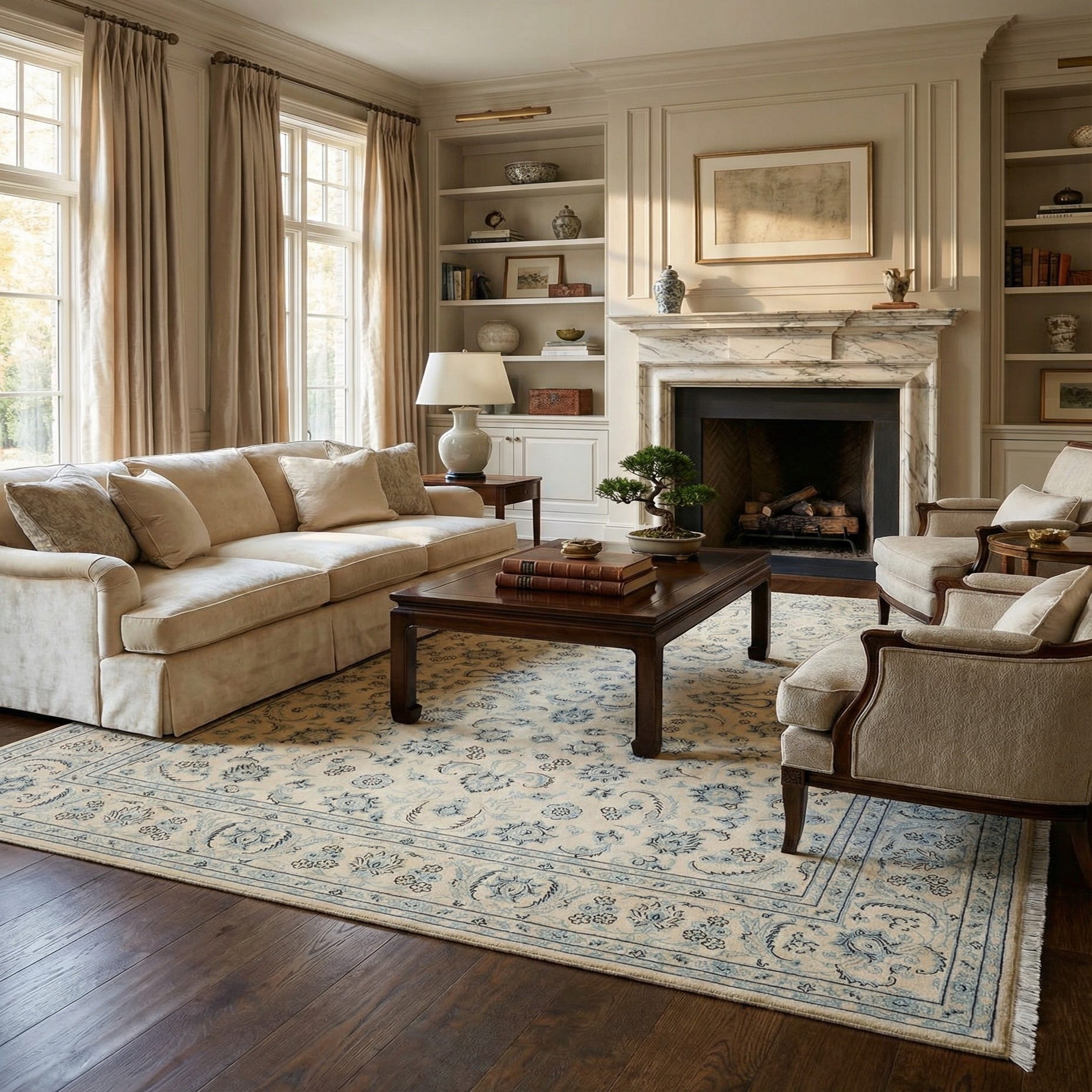 Suitable for a broad range of interiors, this rug would perform well in a formal living room, dining area, or a sophisticated office setting. It pairs effectively with both traditional and transitional decor, adding a touch of elegance without overwhelming a space. The color scheme is versatile, enabling the rug to integrate smoothly with natural wood finishes, gentle pastels, or bolder color choices for a striking contrast. This piece can serve as a subtle focal point or as a complement to an existing design narrative.