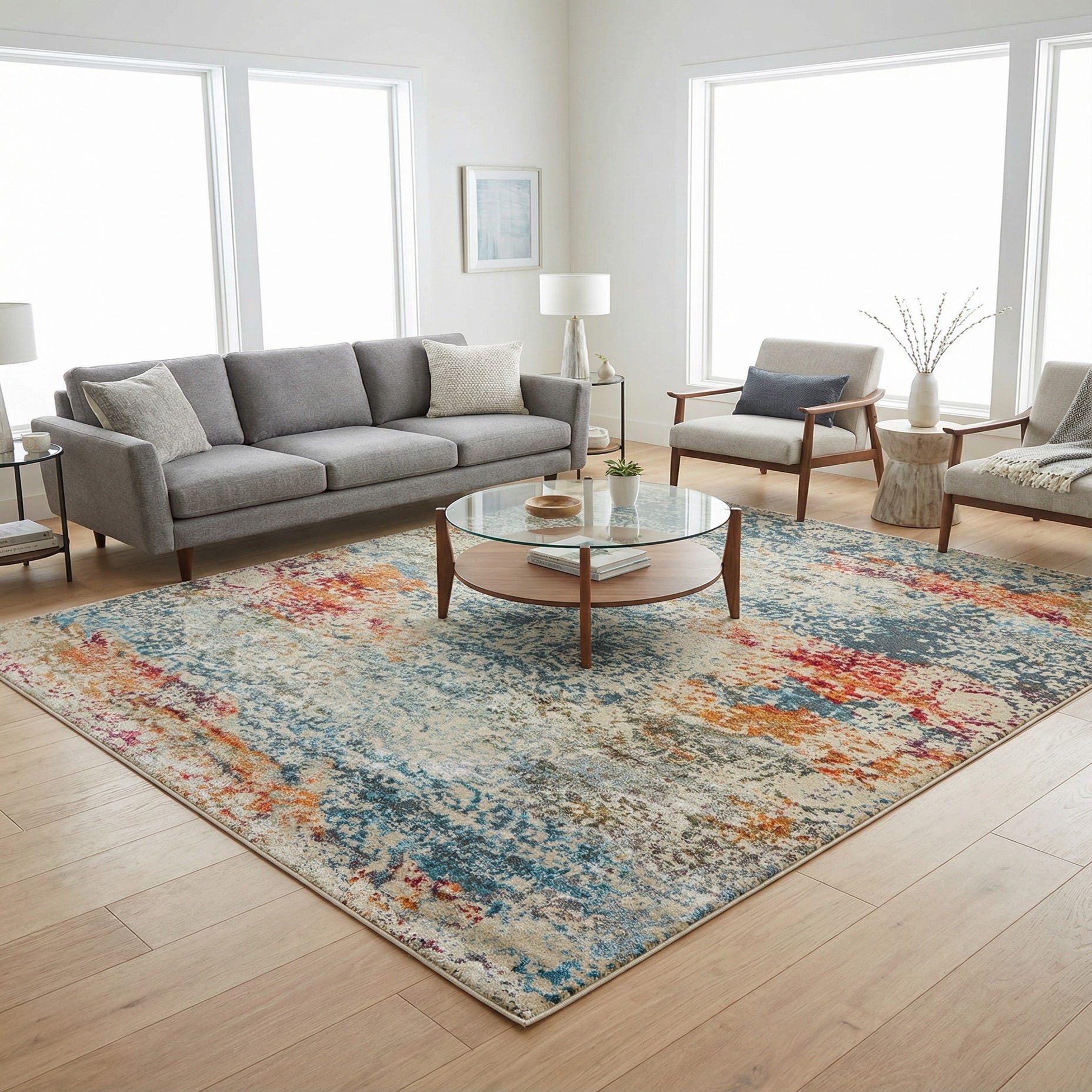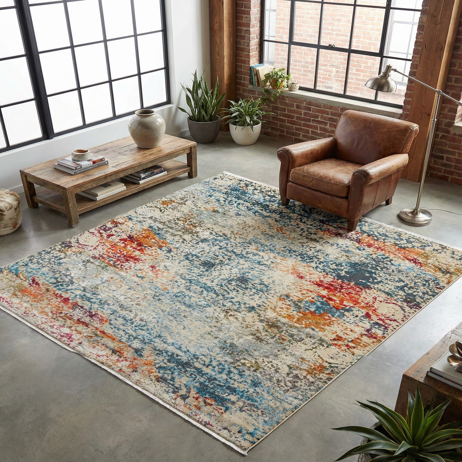 The versatile palette and understated distressing work well in a variety of interiors: anchor a neutral living room beneath a sofa and coffee table to introduce color without dominating the scheme, place it under a casual dining set for a relaxed, lived-in look, or slide it into a bedroom to add warmth and pattern beneath the bed. It also complements midcentury and bohemian furnishings, and its low-profile construction makes it easy to position under furniture and in areas where smooth chair movement is needed.