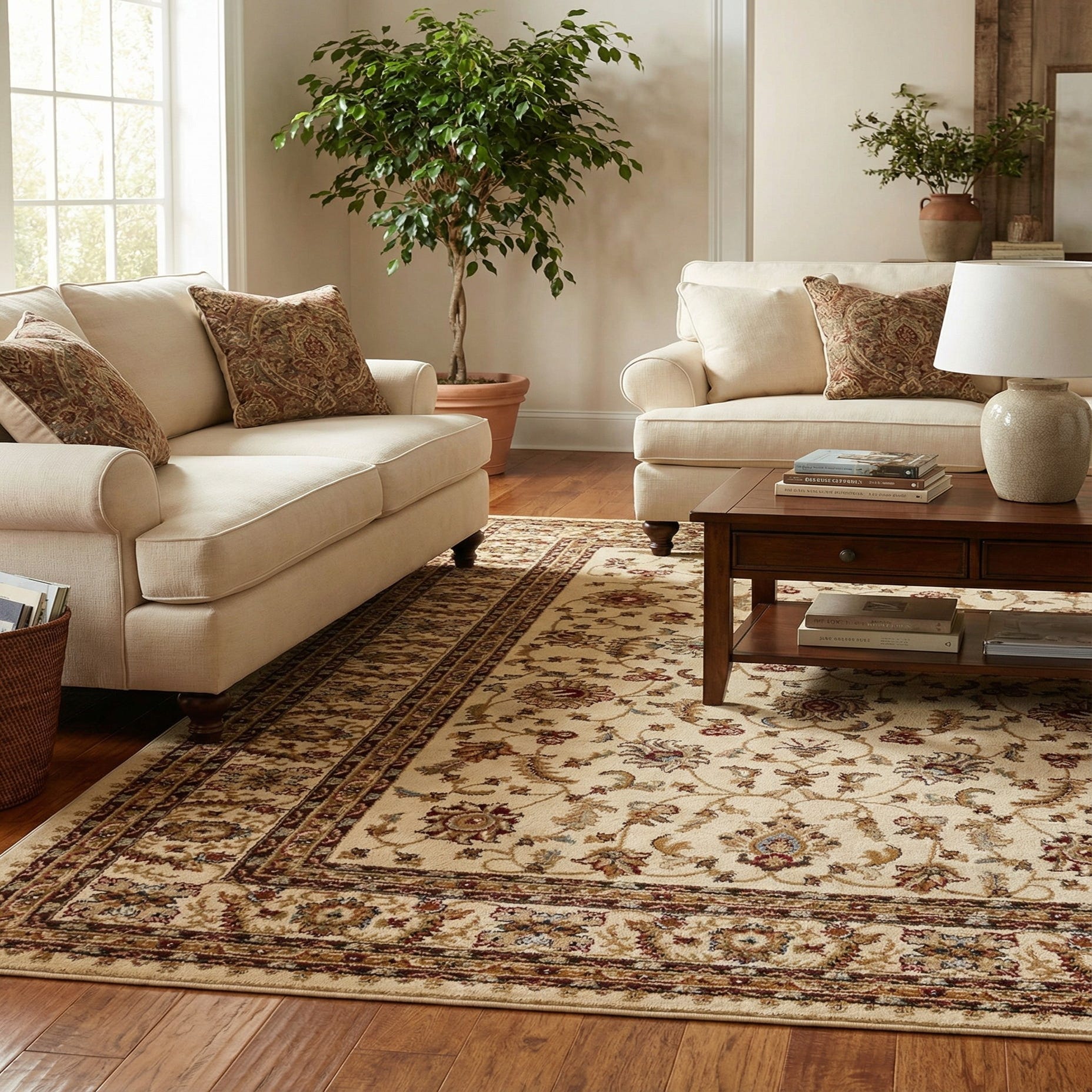 Primary color is Cream. Colors in this rug include: Cream, Brown, Green, Light Blue, Red, Rust Red, Tan.