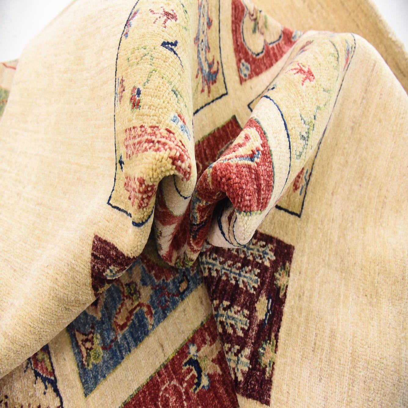 The Ariana Ziegler 7x10 rug is a hand-knotted piece constructed from 100% hand spun wool, offering both durability and a soft texture underfoot. This rug displays a compilation of traditional motifs, arranged in a patchwork pattern that creates a mosaic of intricate designs. The colors represented in the rug include a harmonious blend of cream, blue, green, navy blue, purple, tan, and red, set against a predominantly cream background that highlights the vibrancy of the other hues.