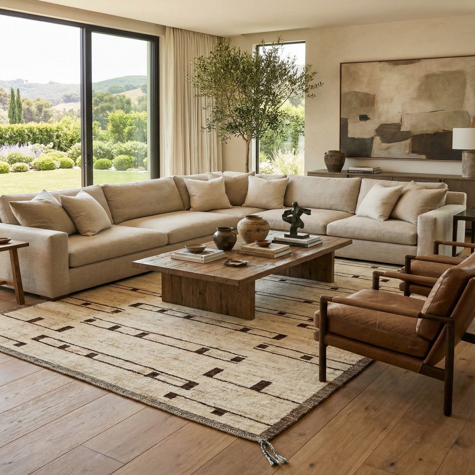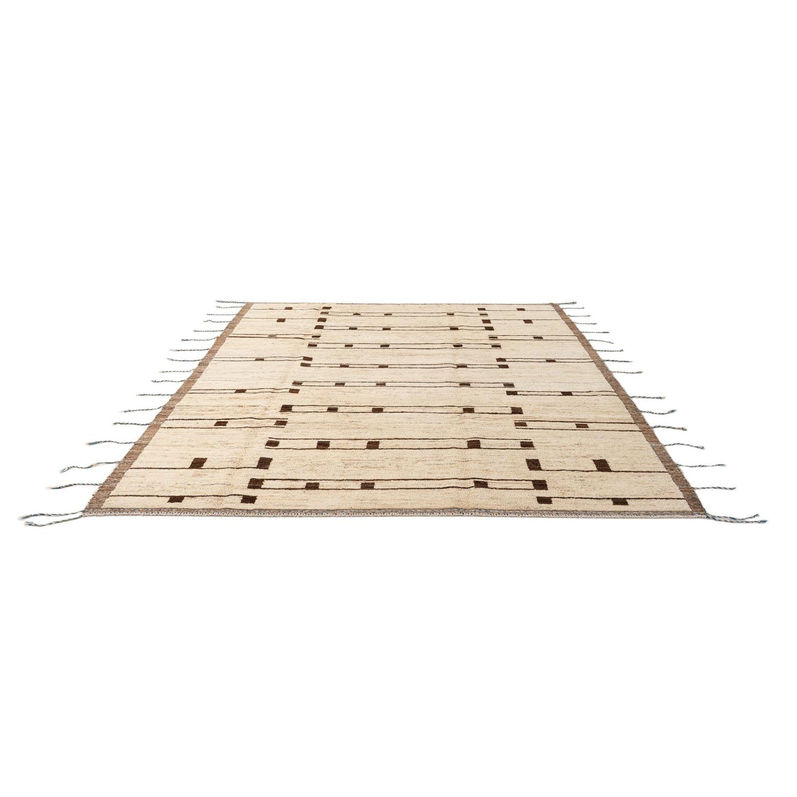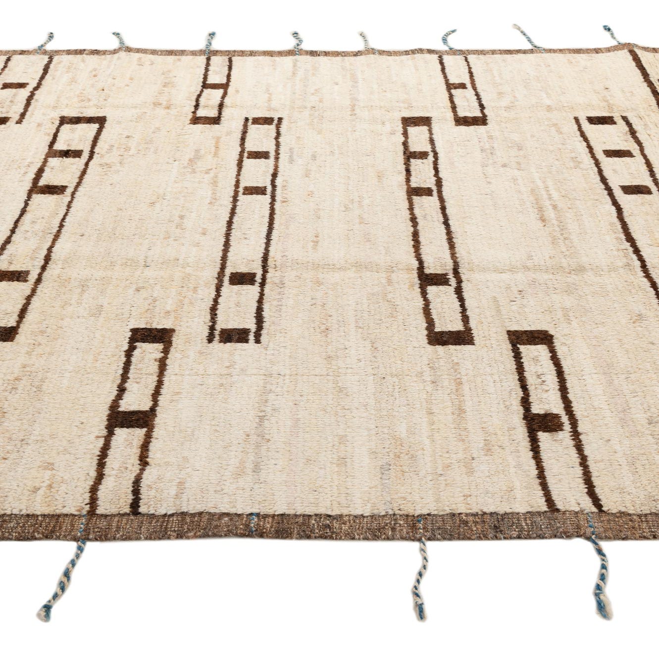 A 7x10 rectangular ivory wool rug with a modern abstract pattern of dark brown lines and squares, perfect for a living room.