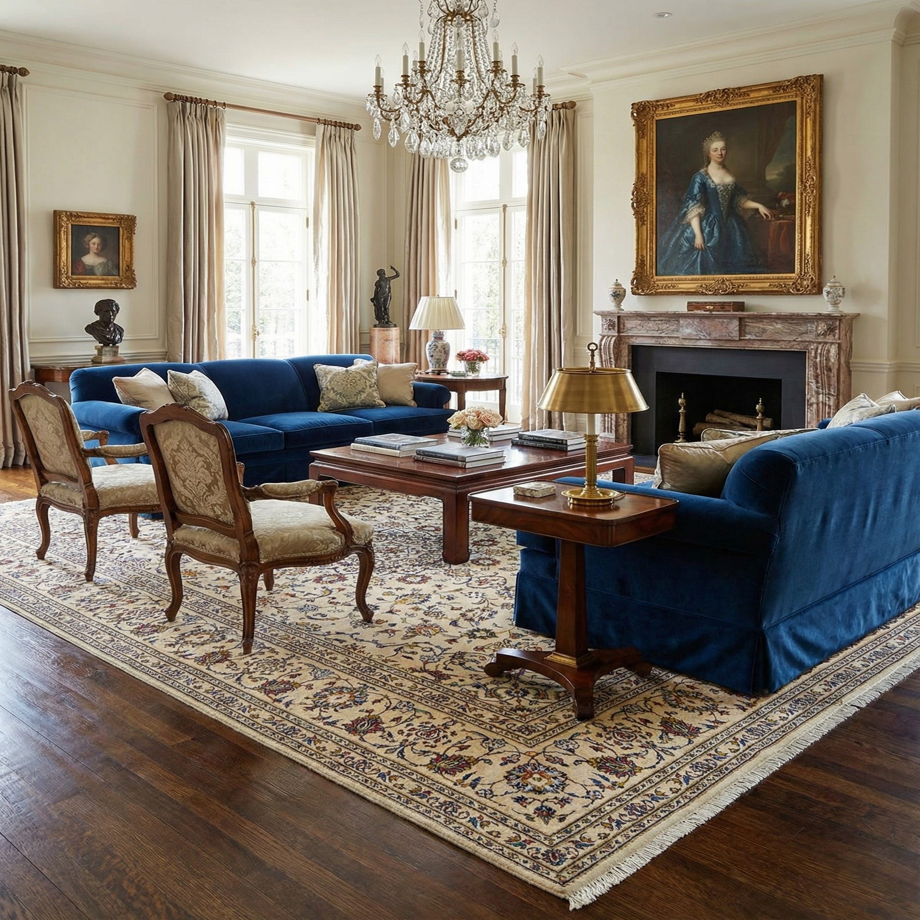 This Kashan collection rug boasts a refined pattern characterized by its traditional floral motifs and intricate borders, all set against a cream background which serves as a versatile base for any room. The rug is hand-made of wool, providing a luxuriously soft texture that is well-suited for high-traffic areas given its durability. Its pattern features an elegant array of colors including navy, red, and hints of green, gold, and blue interspersed throughout the design.