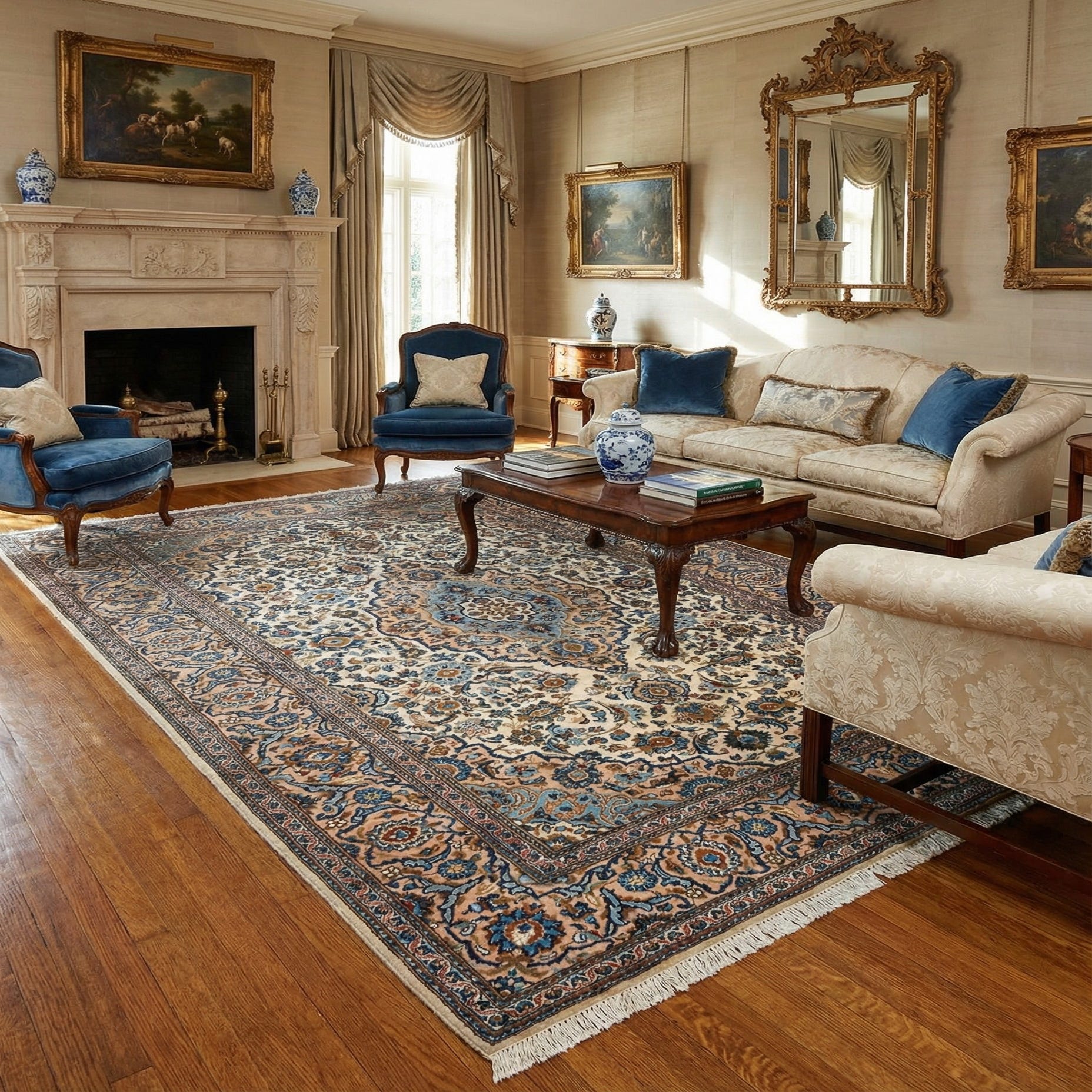 A 7x10 rectangular Persian rug with an ivory field, intricate floral patterns in blue and brown, and a detailed peach border.