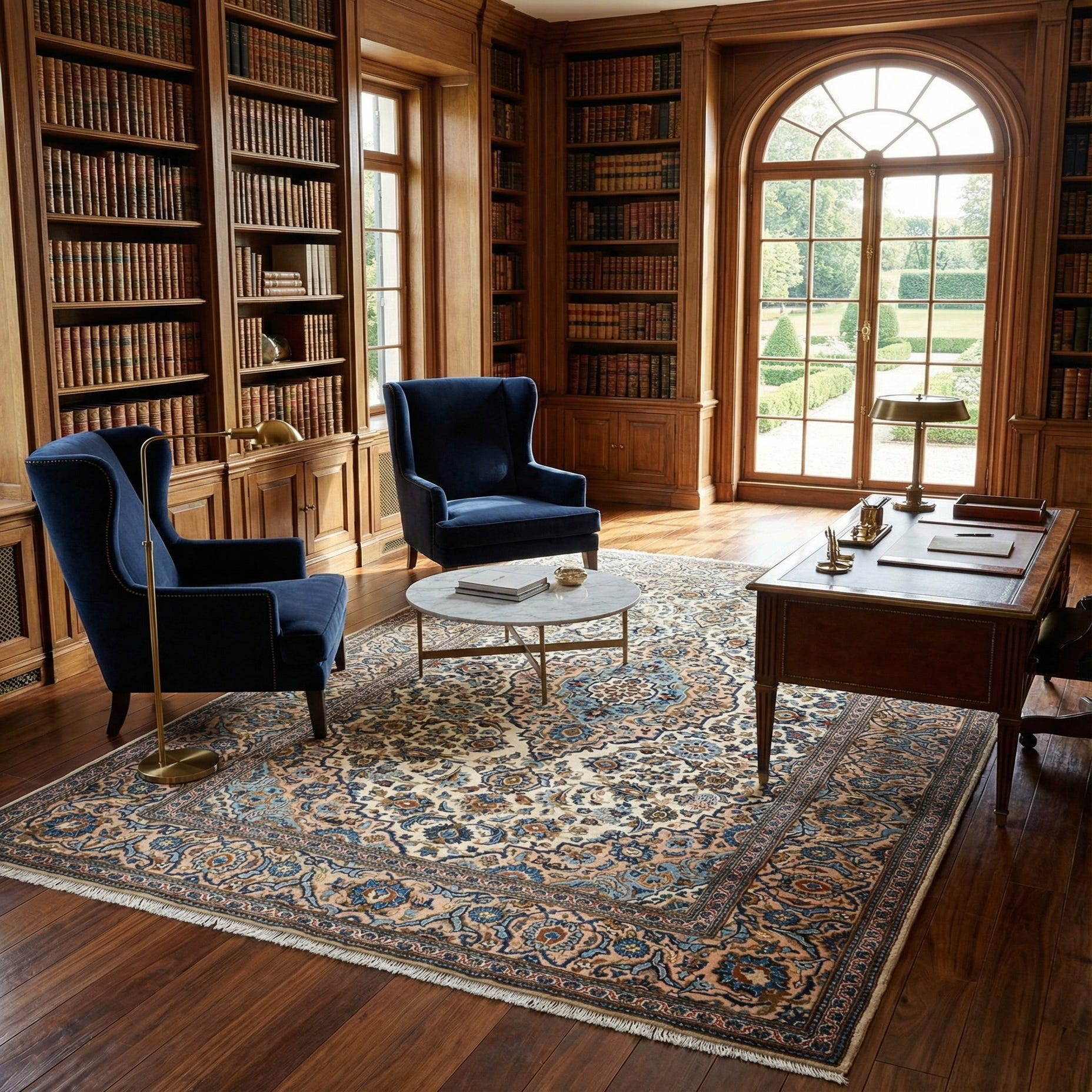 This rug would serve as a remarkable centerpiece in both traditional and transitional interiors, where it can act as an anchor for furniture arrangements in living rooms, dining areas, or grand entryways. Its classic design effortlessly pairs with wood furnishings and can complement both subdued color schemes and more vibrant decor elements. Additionally, the rug's versatile color palette can harmonize with a variety of textures such as leather, velvet, and natural wood, allowing for flexibility in design approaches.