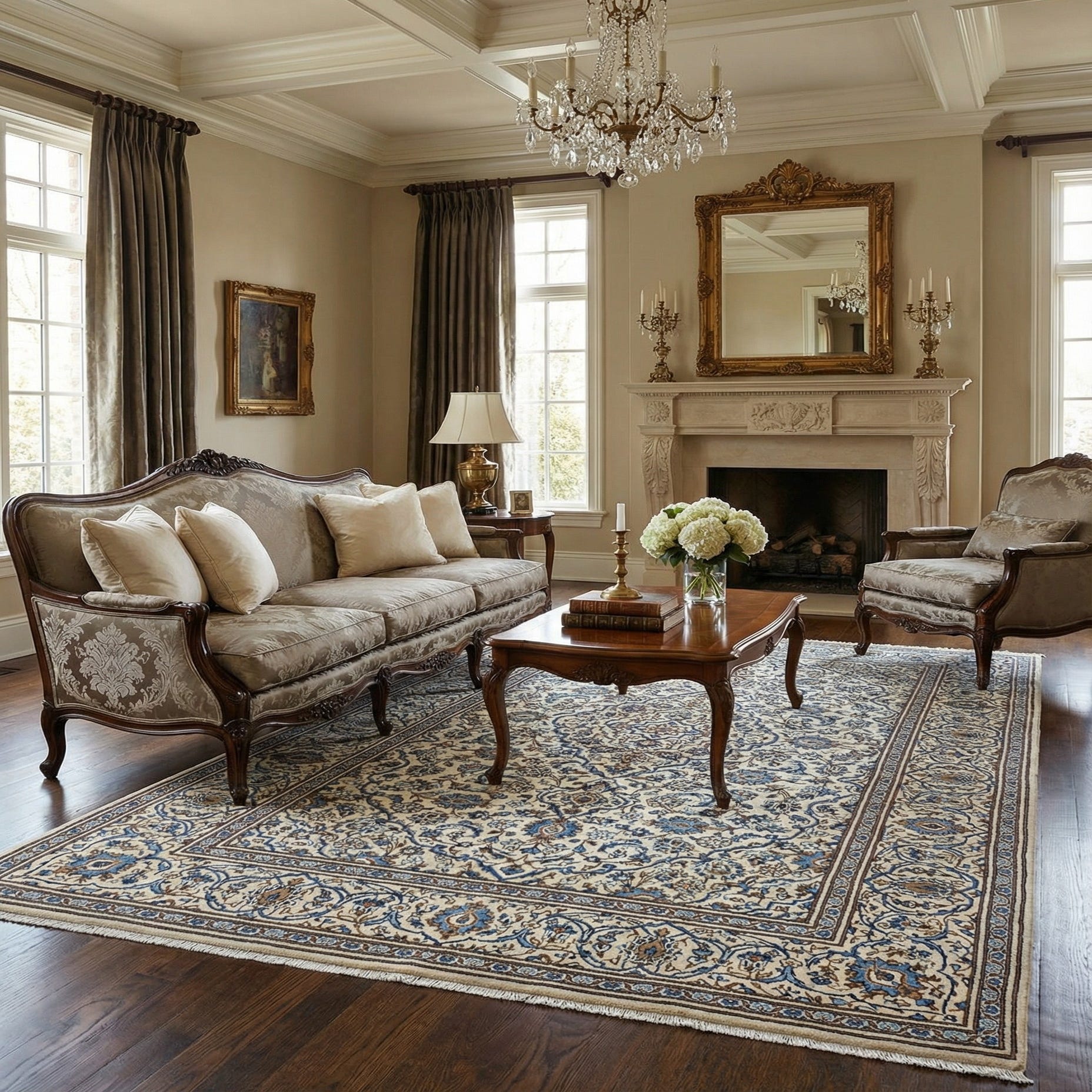 A 7x10 rectangular ivory Persian wool rug with intricate blue and gold floral patterns and a detailed border.