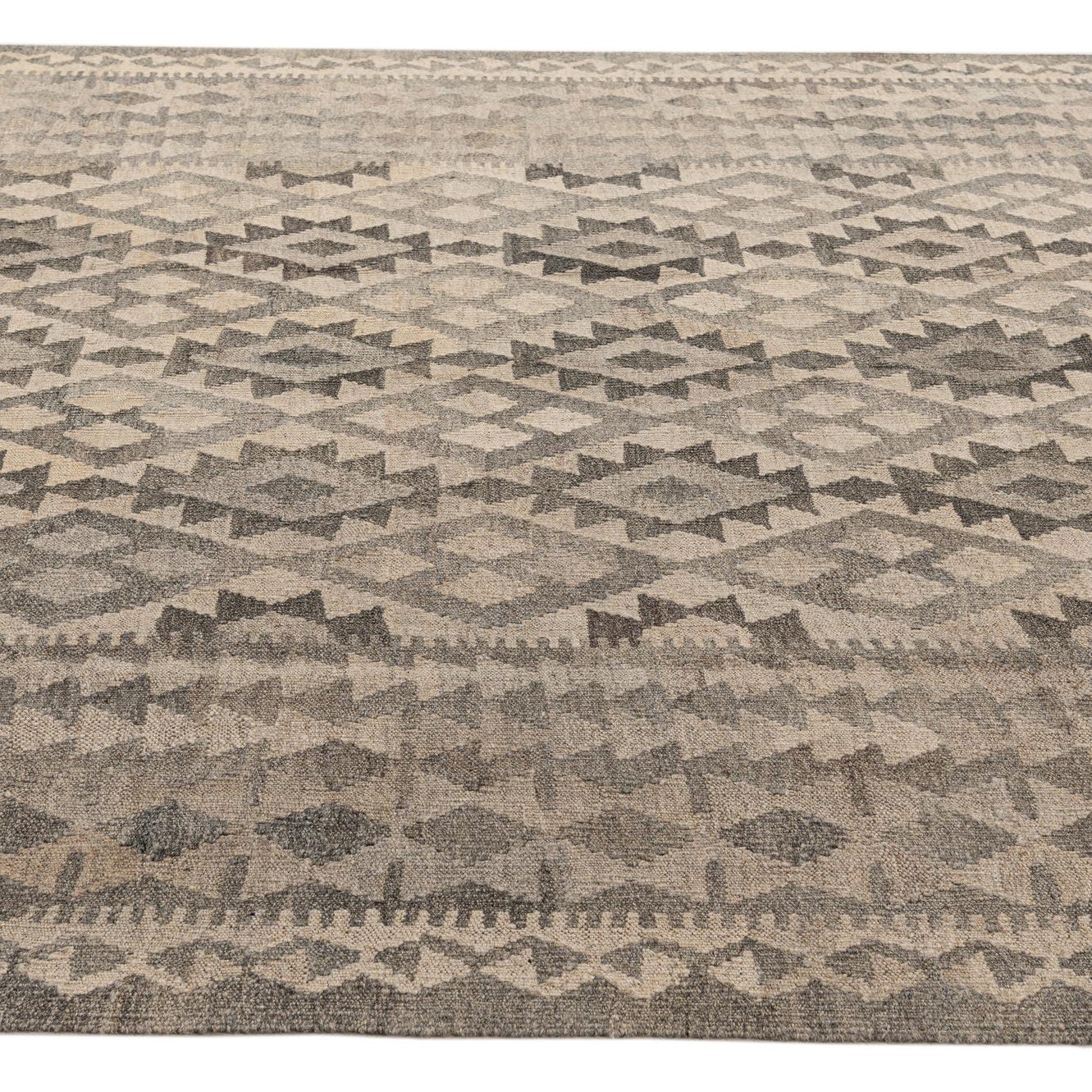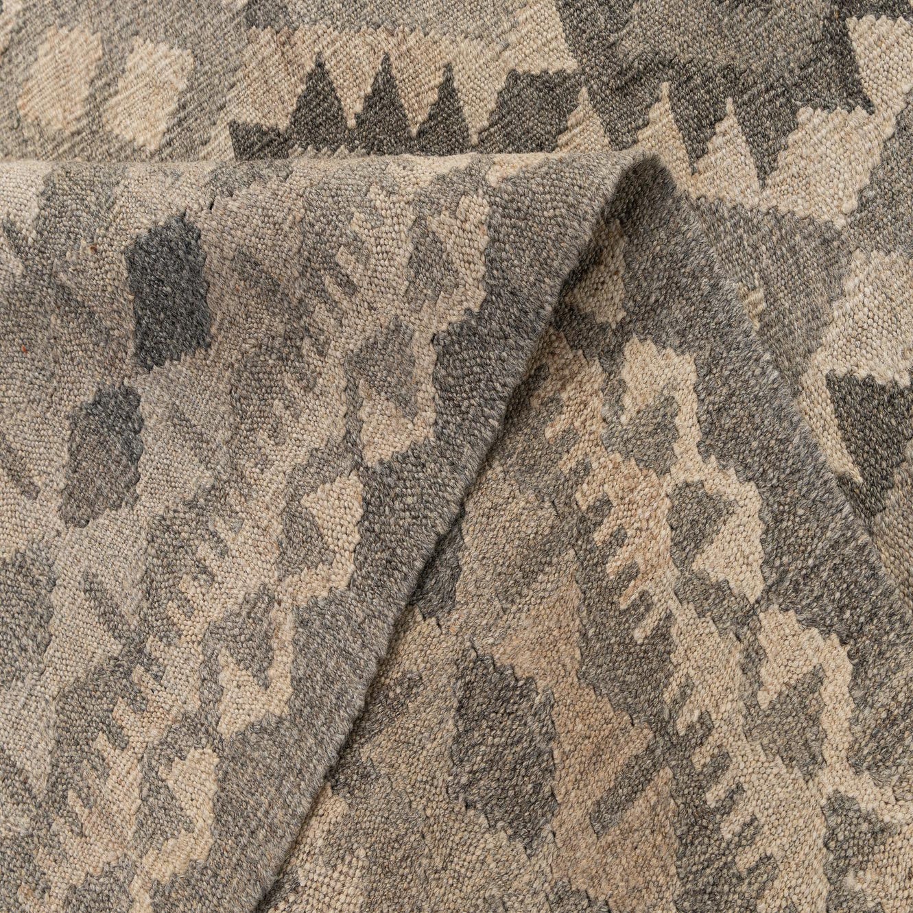 A 7x10 rectangular Kilim Maymana rug featuring a tribal geometric pattern in shades of ivory, cream, and gray, suitable for a living room.