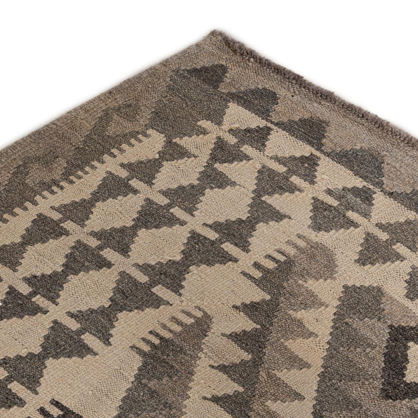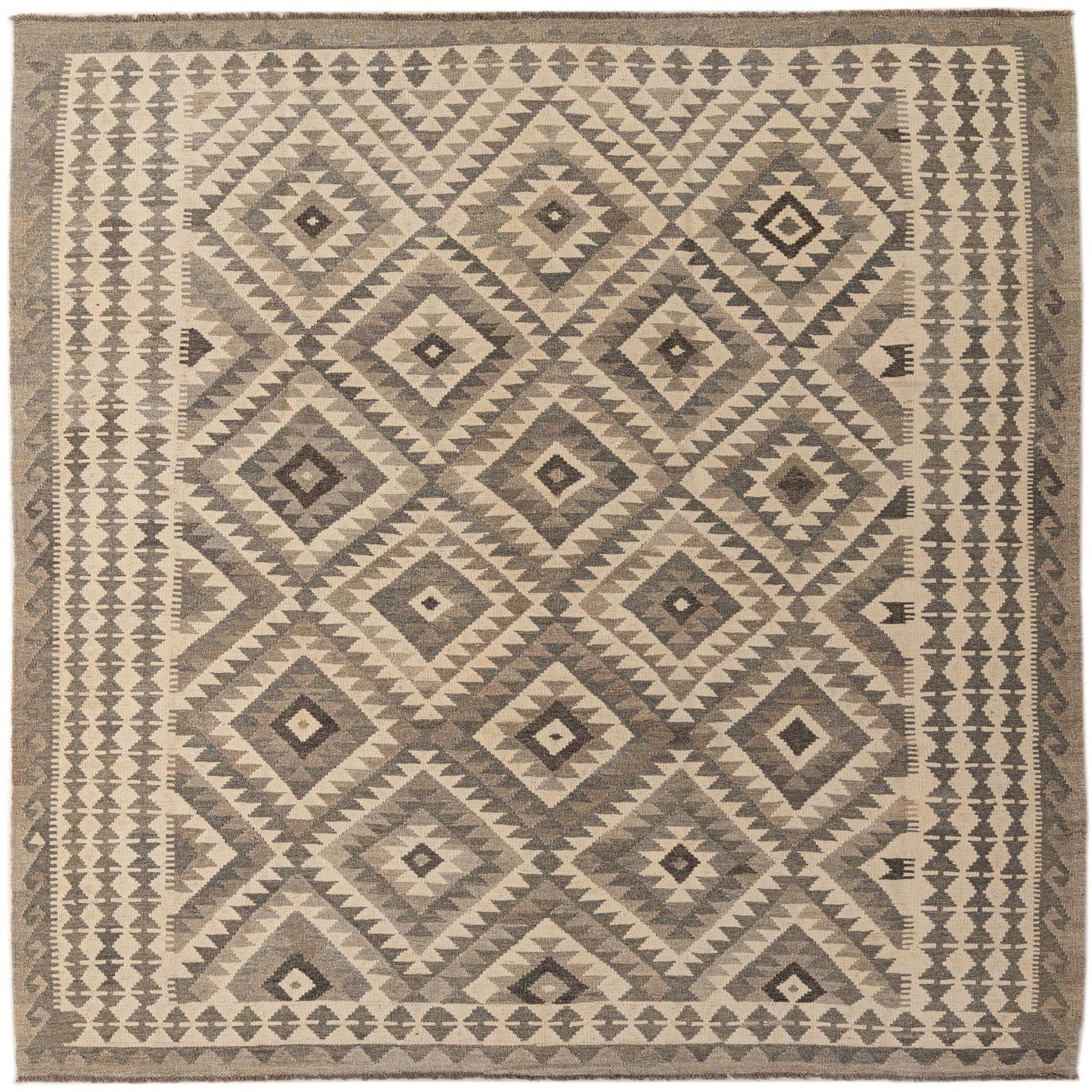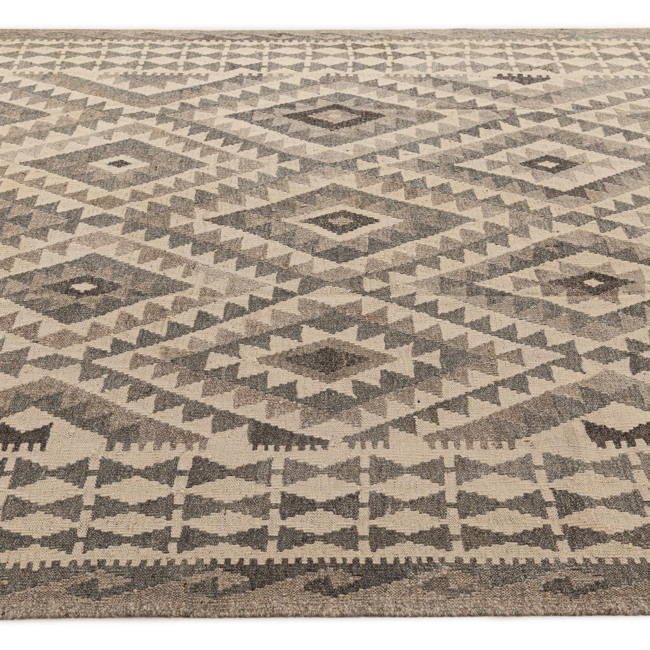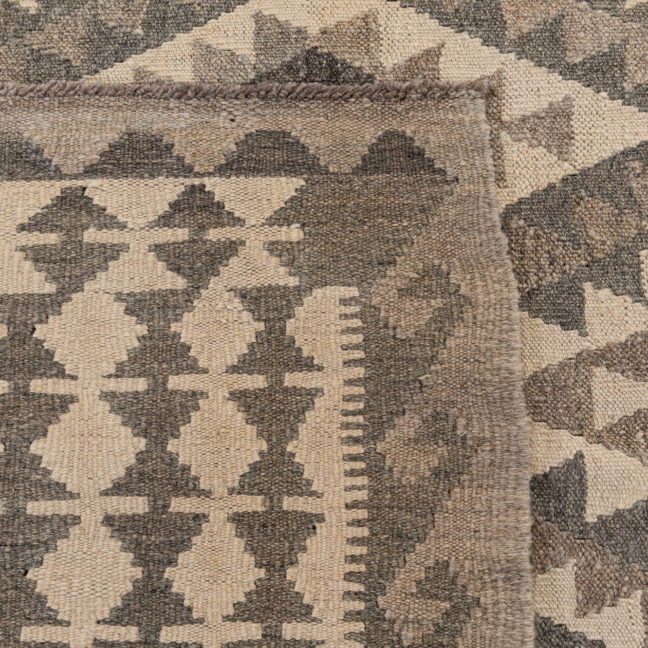A 7x10 rectangular Kilim Maymana rug featuring a tribal geometric pattern in shades of ivory, cream, and gray.