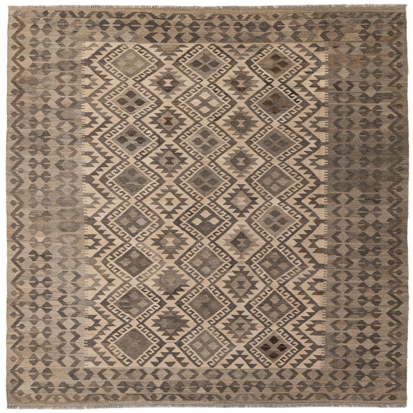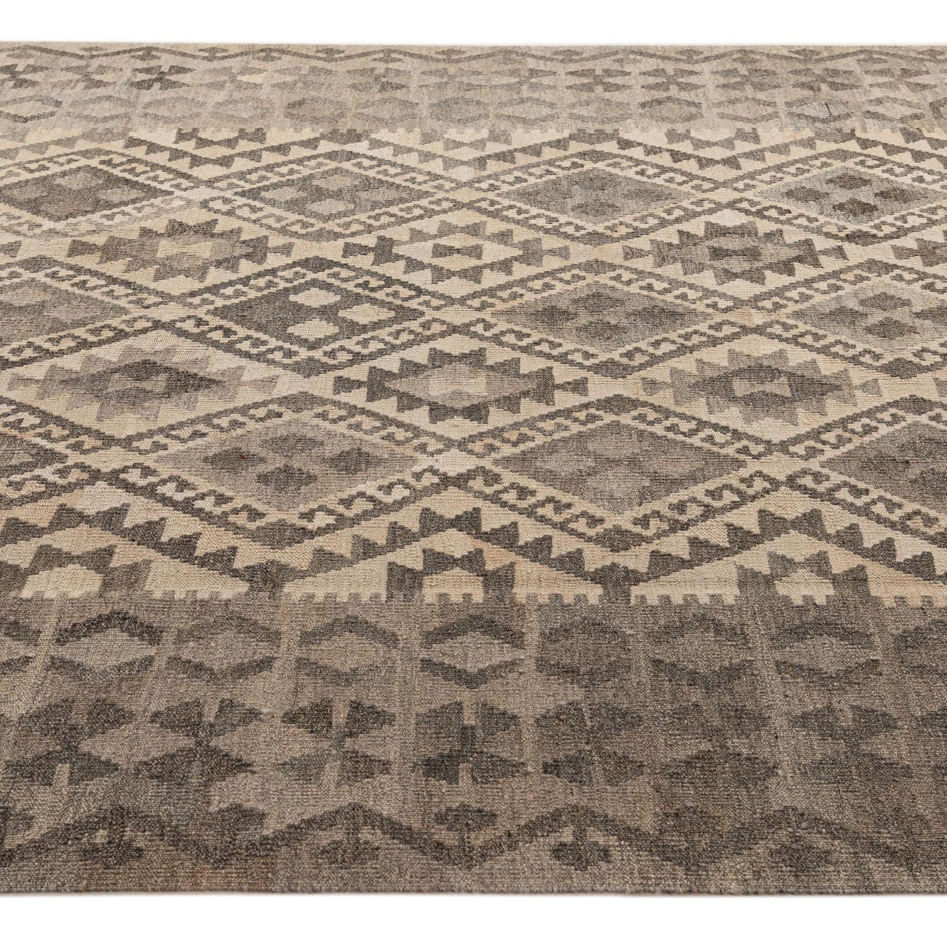 A 7x10 rectangular Kilim Maymana rug featuring a tribal geometric pattern in shades of ivory, cream, and brown.