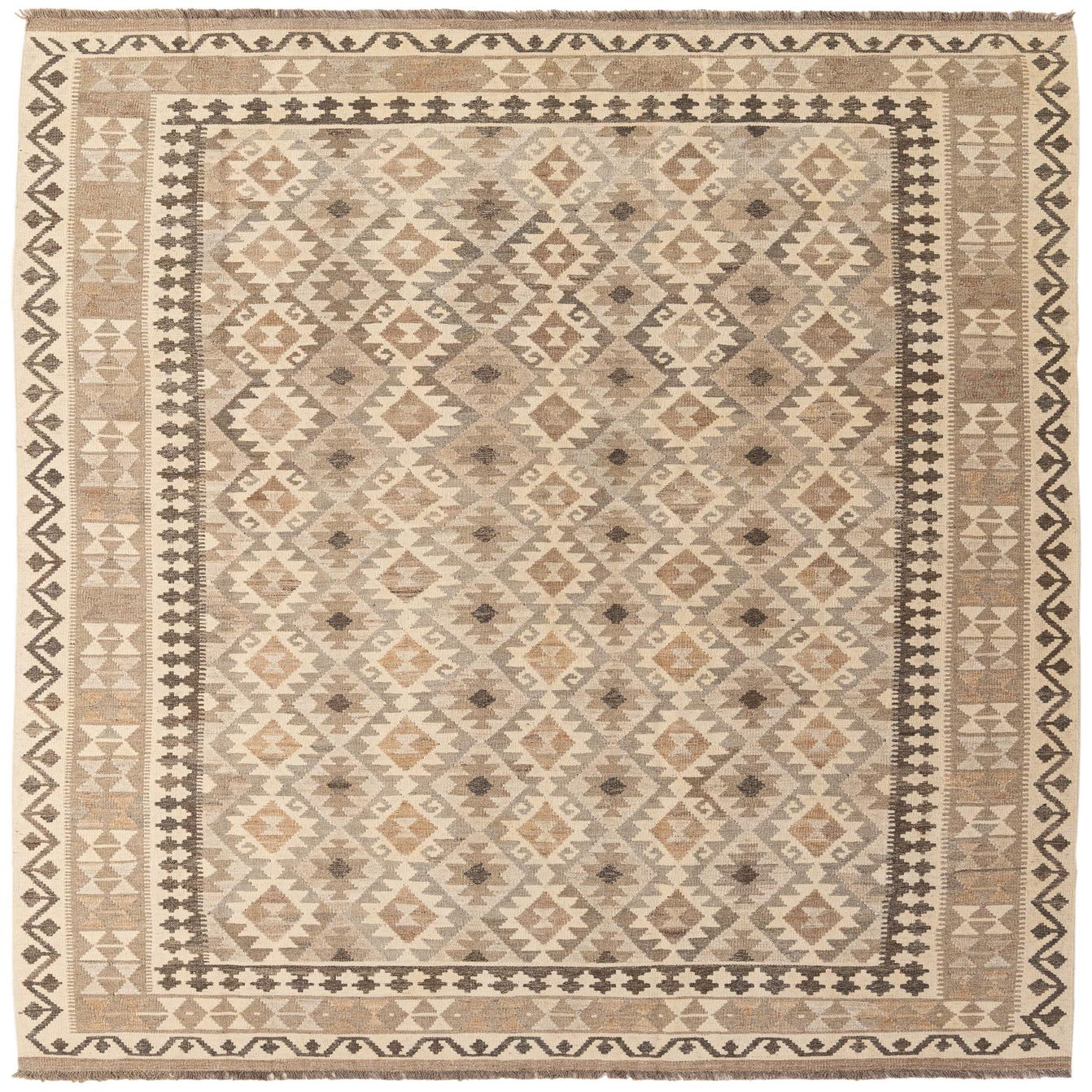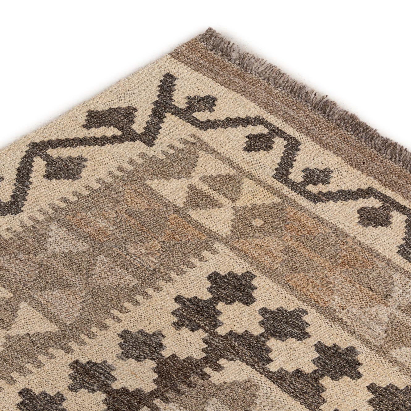 A 7x10 rectangular Kilim Maymana rug featuring a tribal geometric pattern in ivories, creams, and various shades of brown.