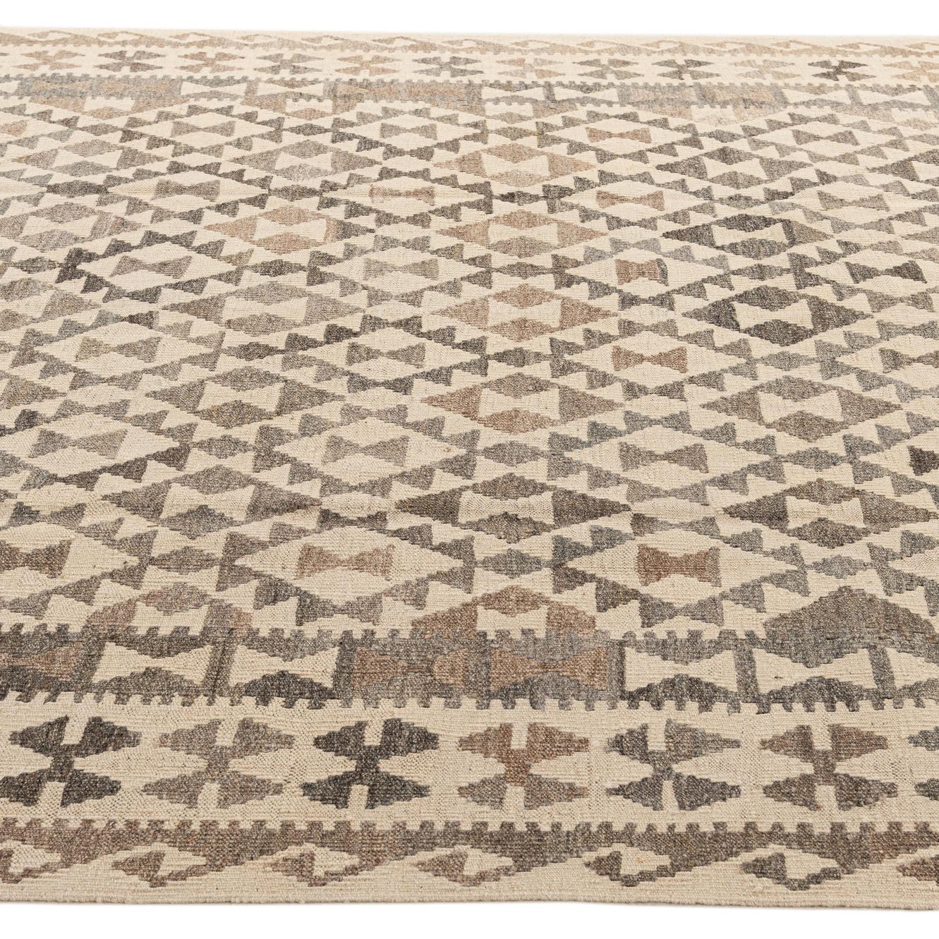 A 7x10 rectangular Kilim Maymana wool rug featuring a tribal geometric pattern in ivories, creams, and various shades of brown and gray.