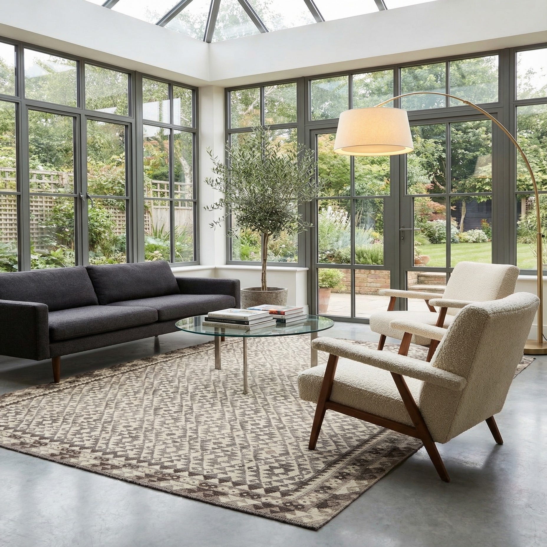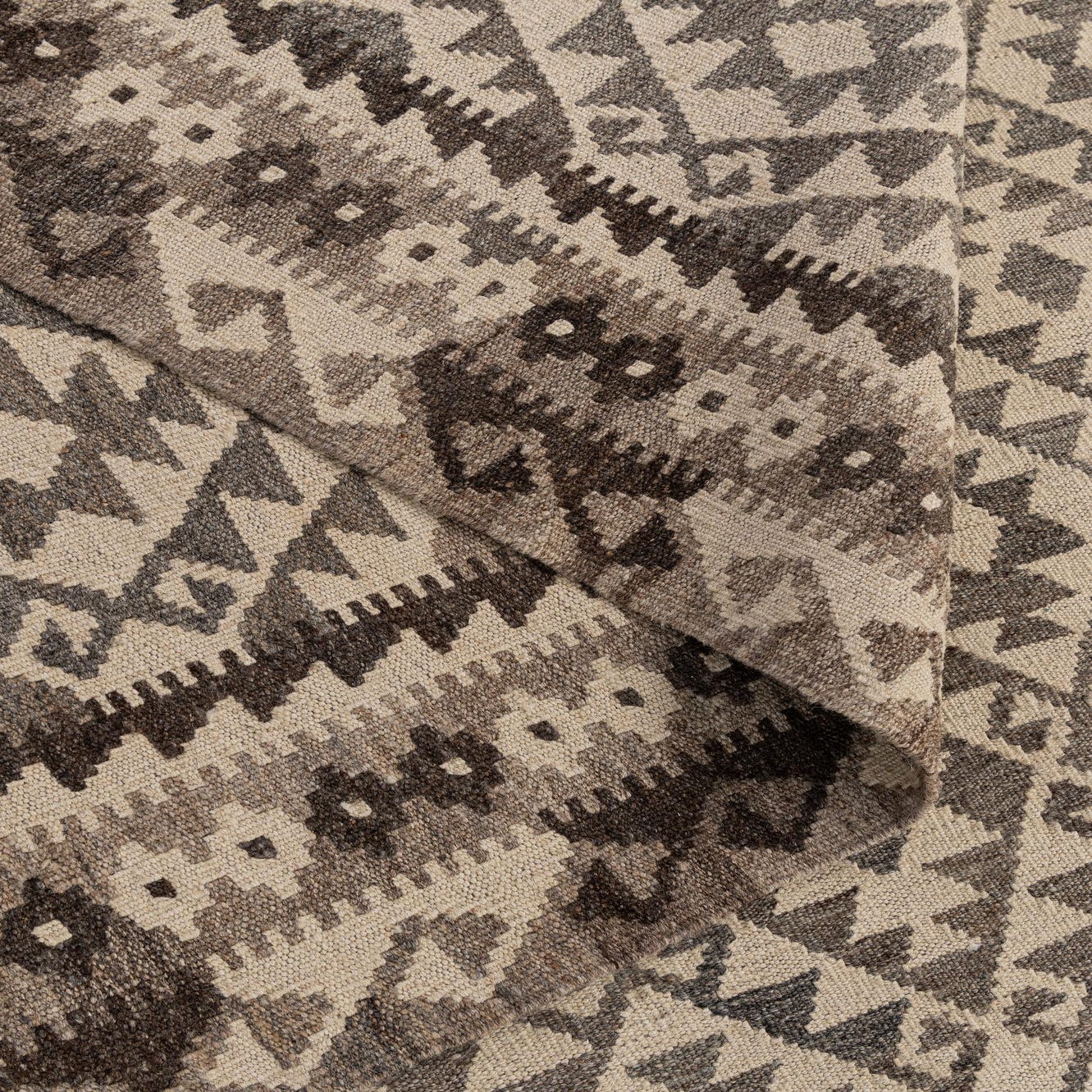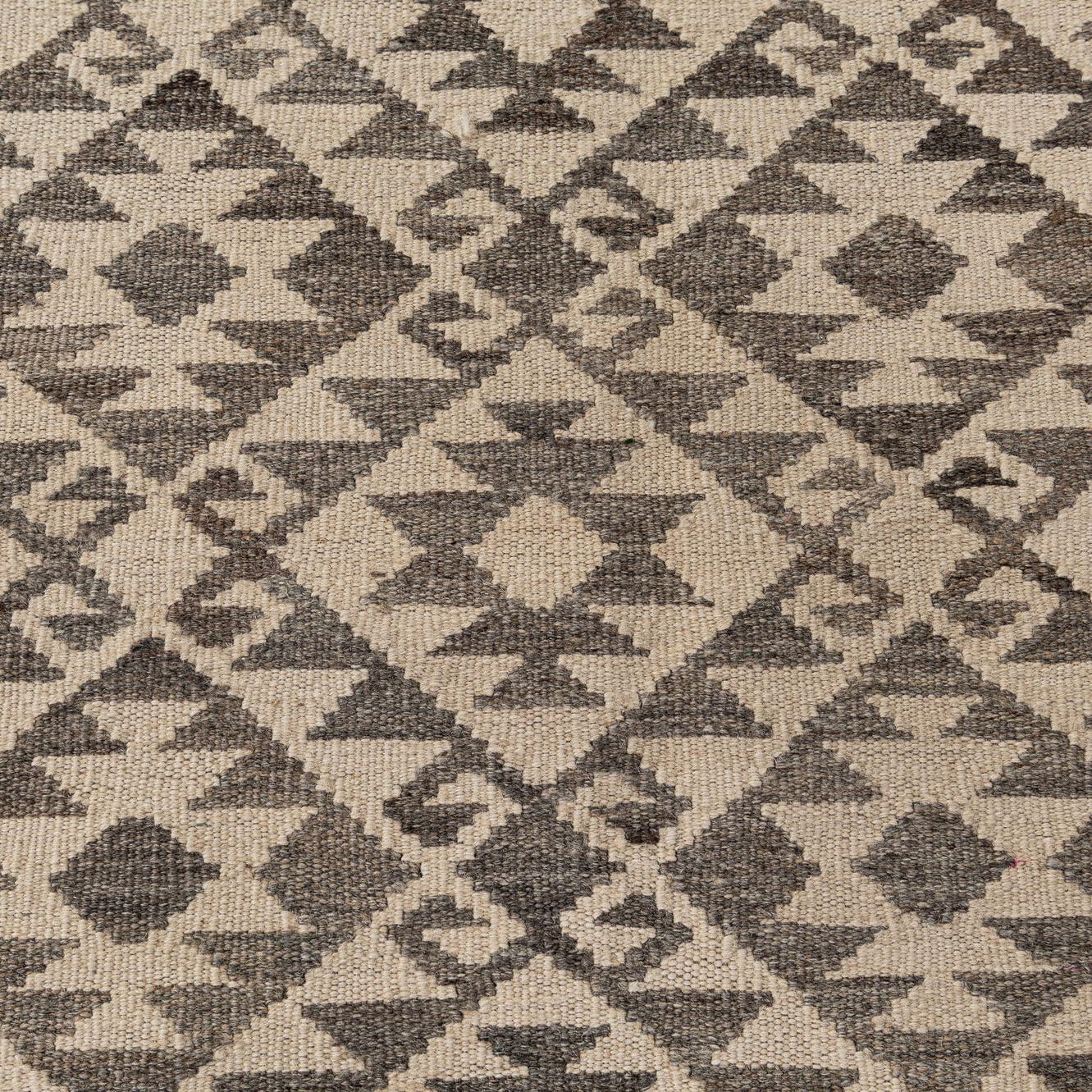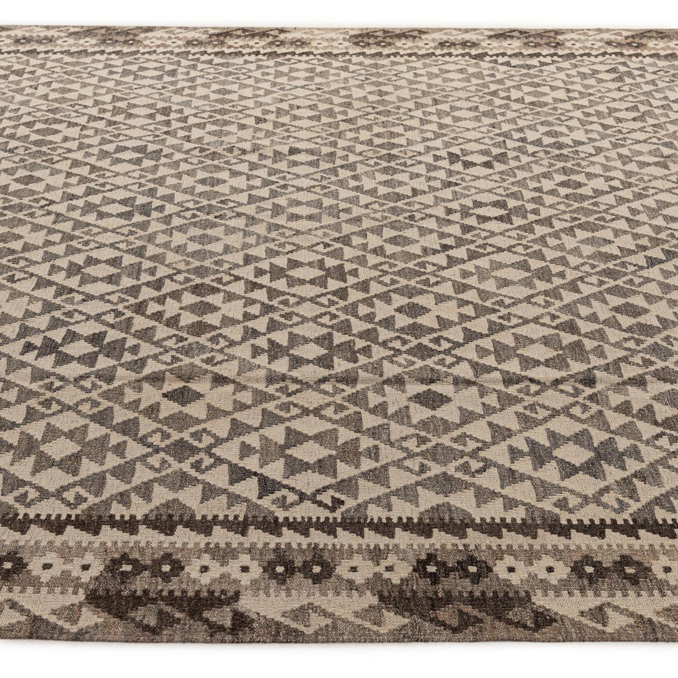 A 7x10 rectangular Kilim Maymana rug featuring a tribal geometric pattern in shades of ivory and cream, handmade from wool.
