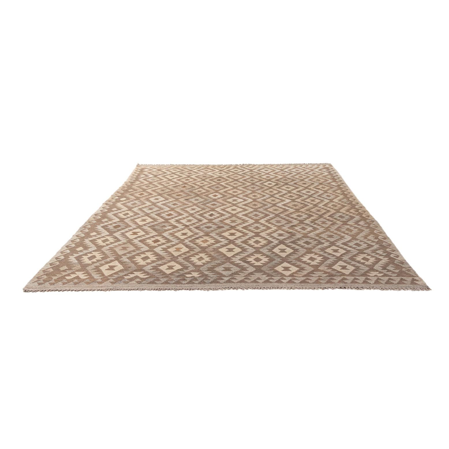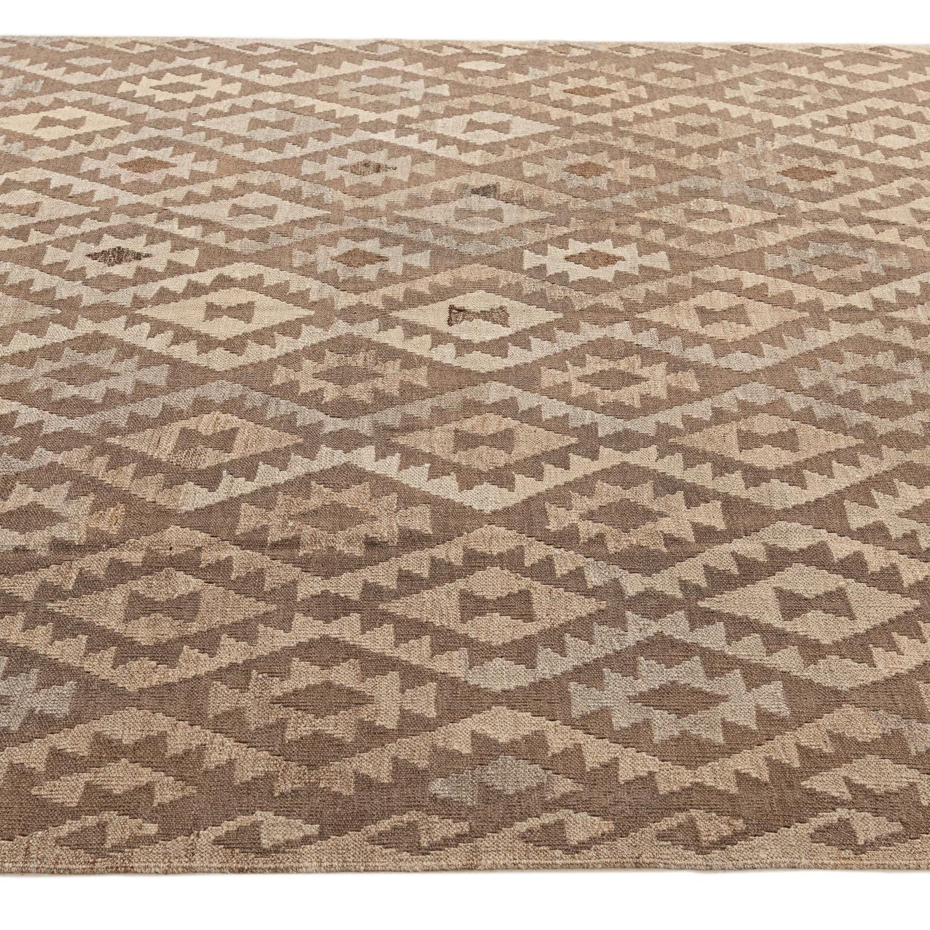 A 7x10 rectangular flatweave Kilim Maymana rug featuring a tribal diamond pattern in shades of ivory and cream.