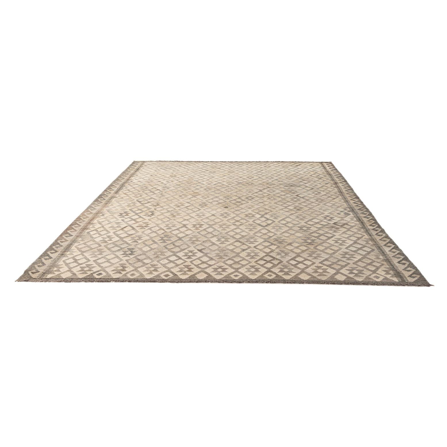 A 7x10 rectangular Kilim Maymana rug featuring a tribal geometric pattern in ivory and cream tones with a flatweave texture.