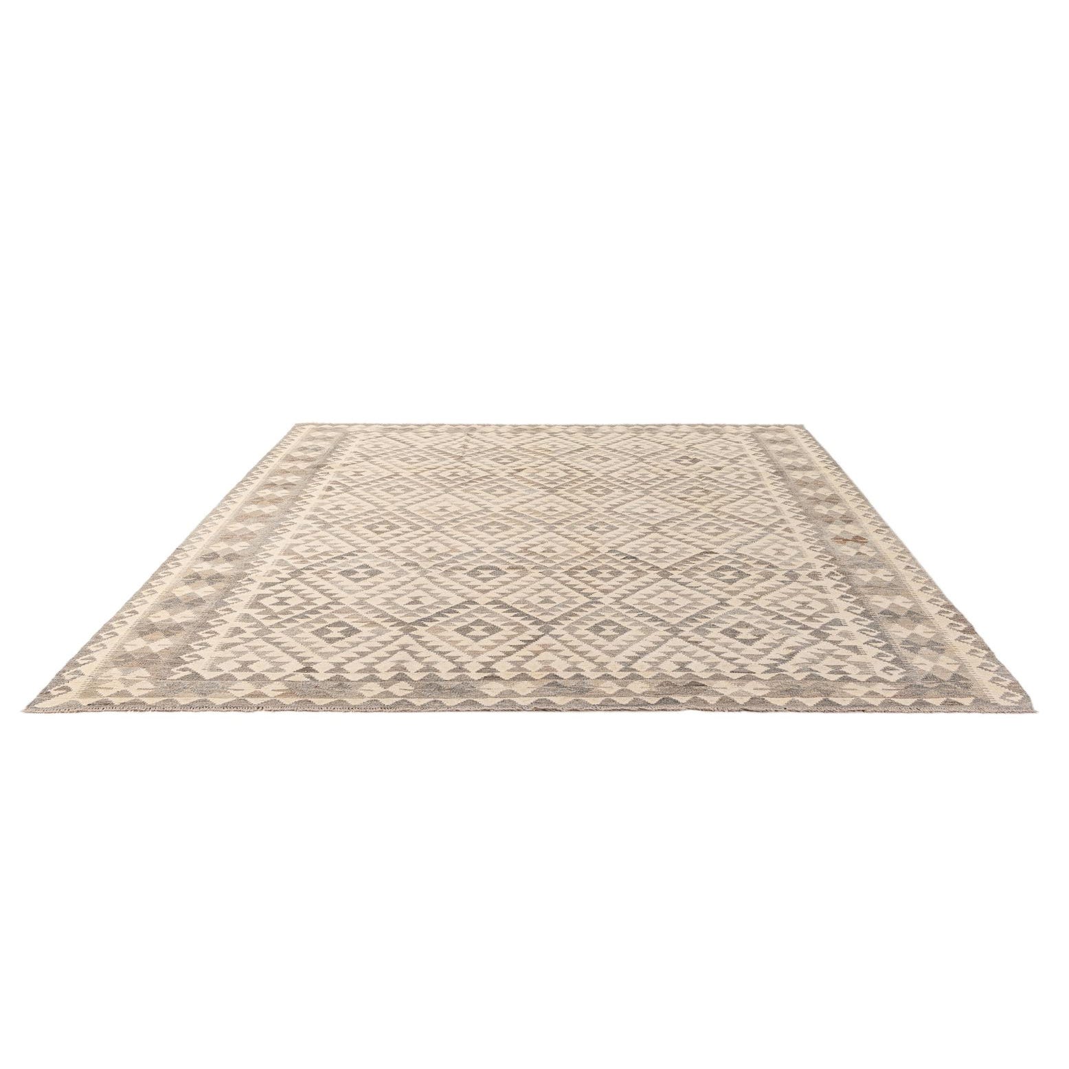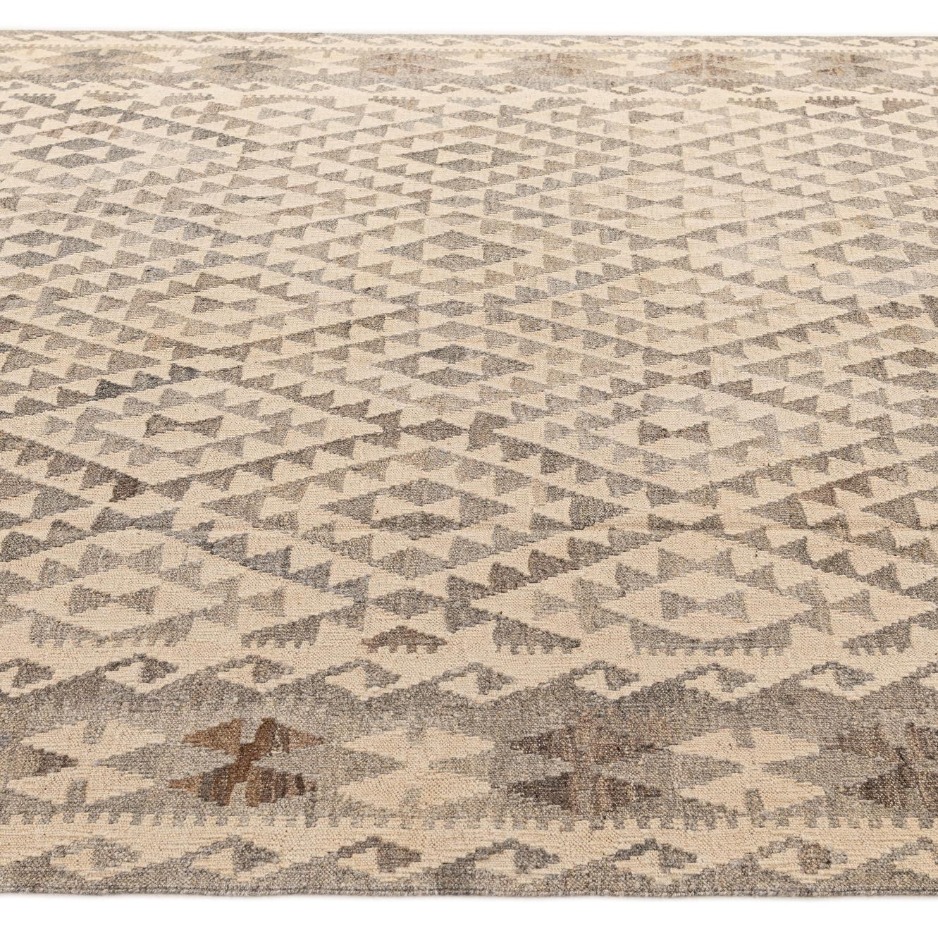 A 7x10 rectangular Kilim Maymana wool rug featuring an ivory background with a tribal geometric pattern in shades of gray and cream.