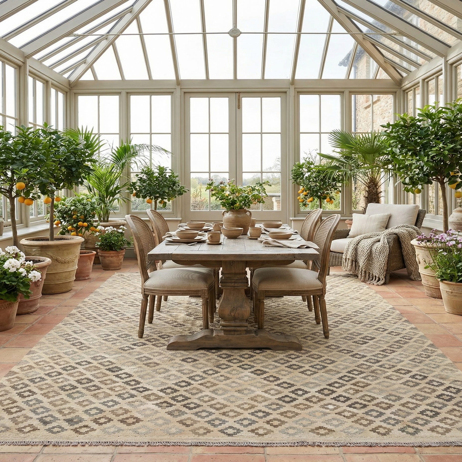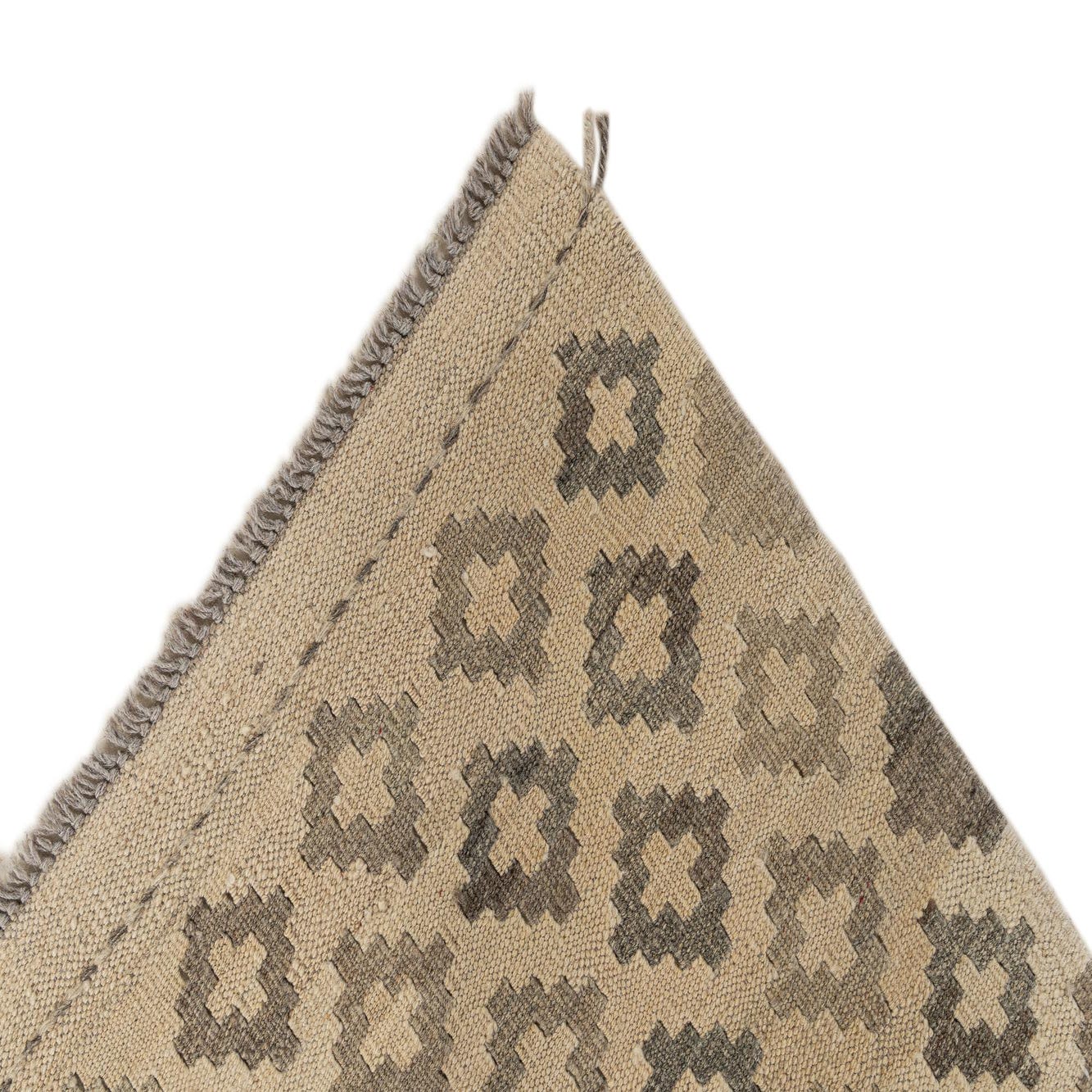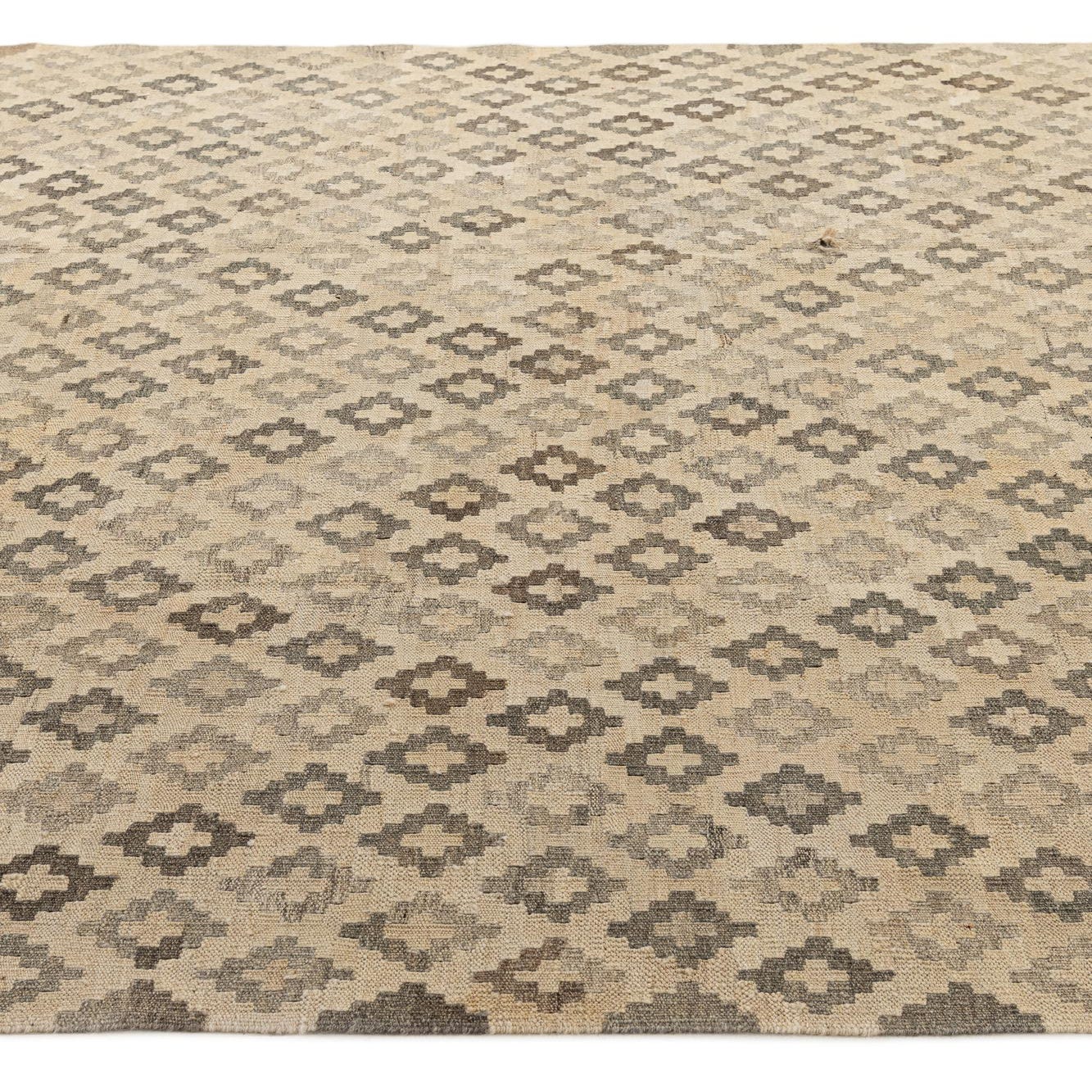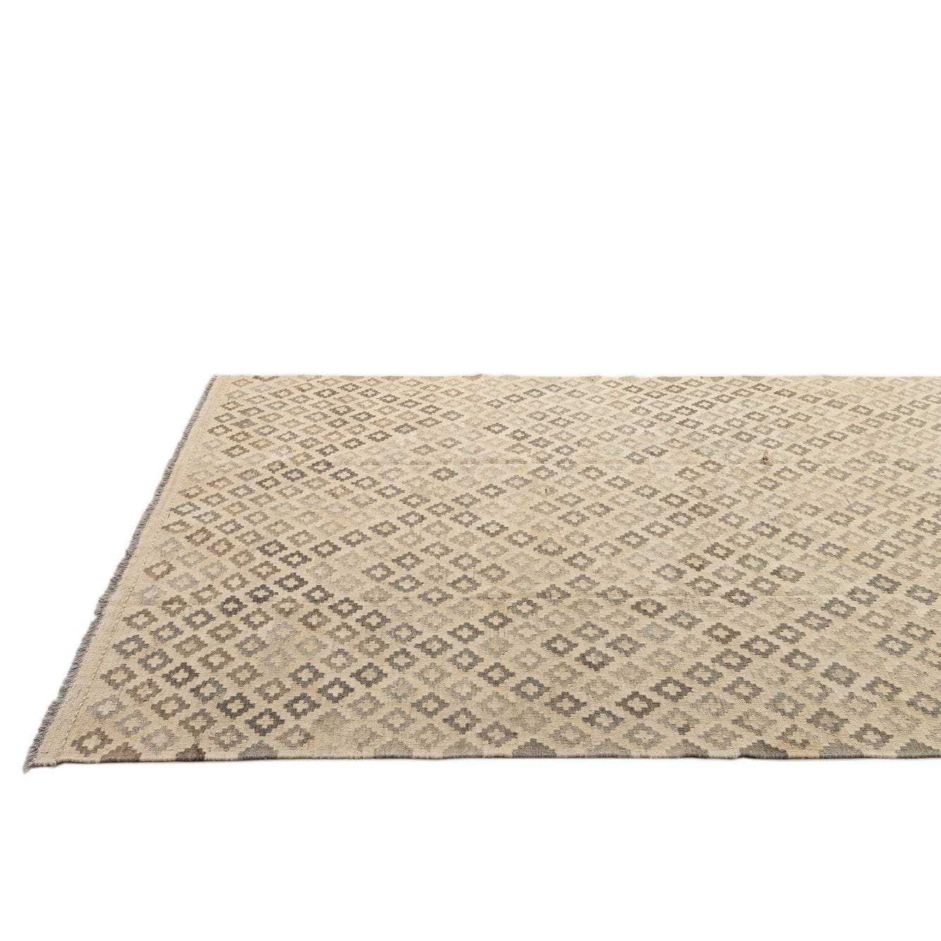 A 7x10 rectangular flatweave Kilim Maymana rug with a tribal geometric diamond pattern in varying shades of ivory and cream.
