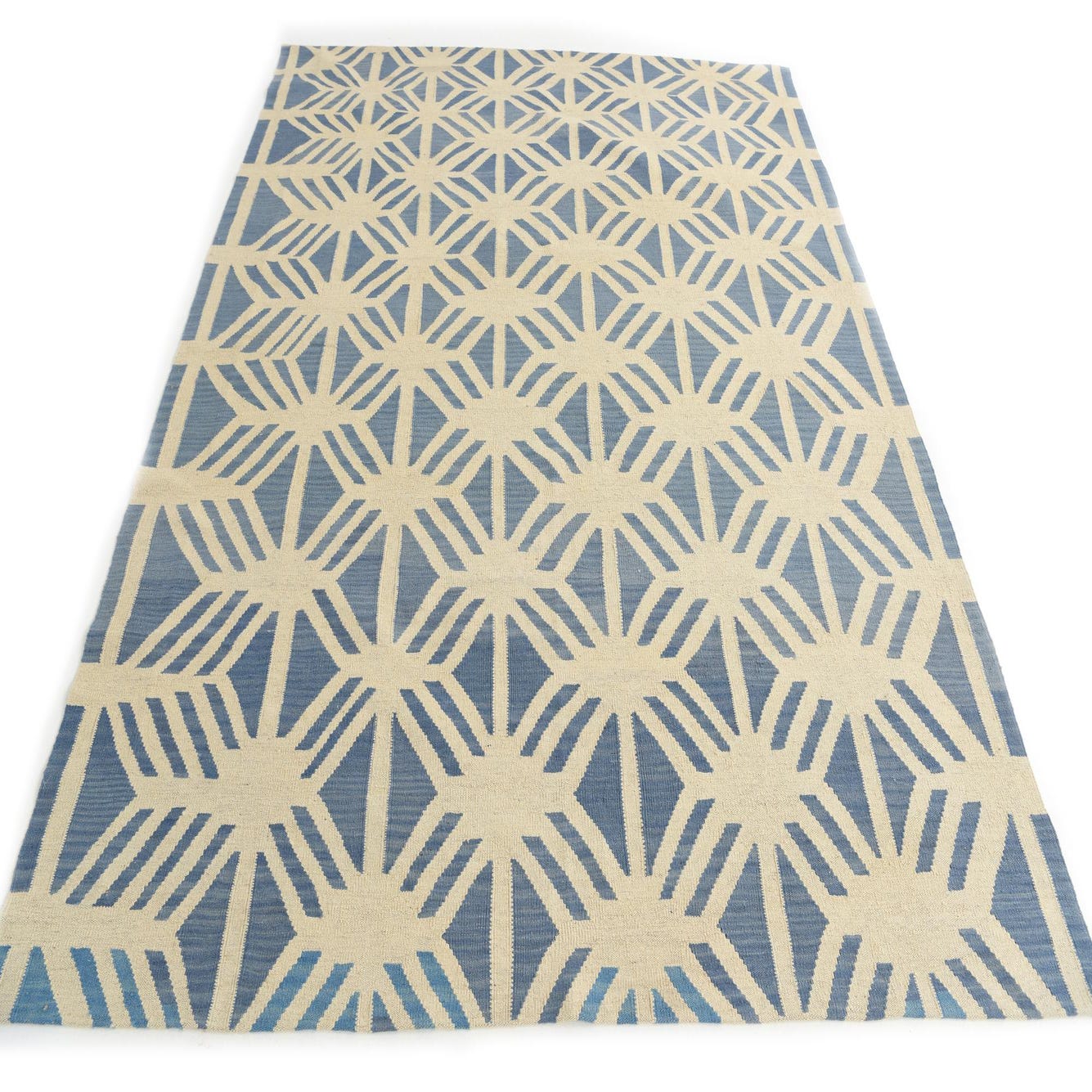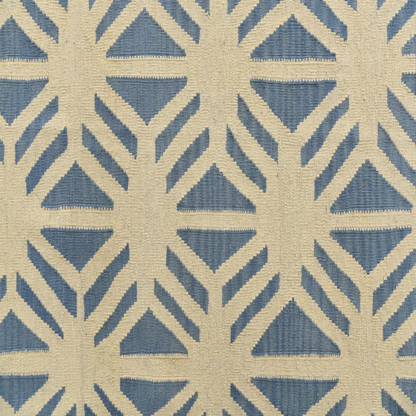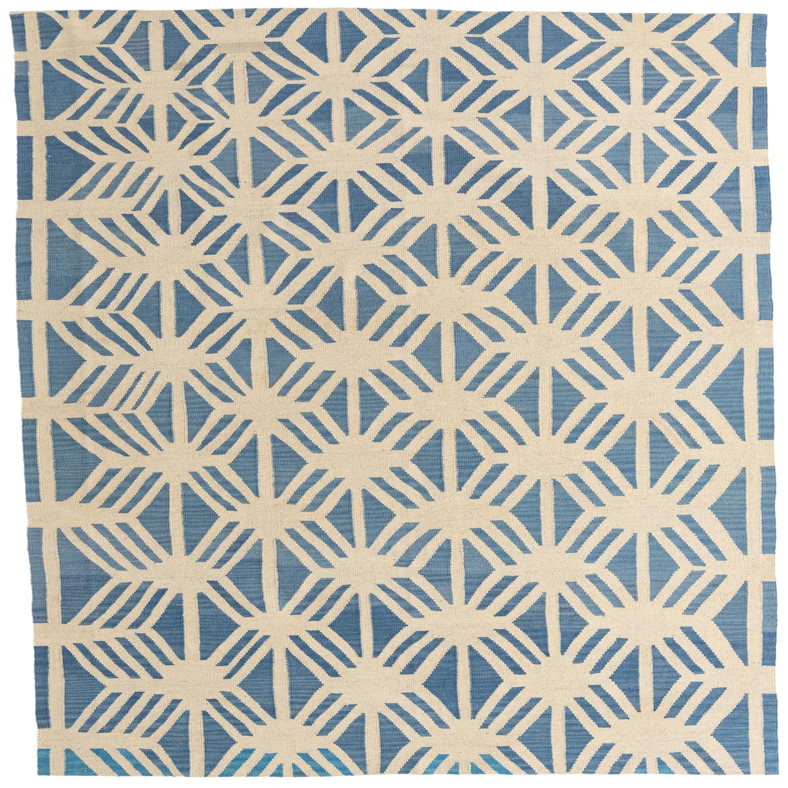 A 7x10 rectangular flatweave rug with a modern tribal pattern in ivory and blue, suitable for a living room.
