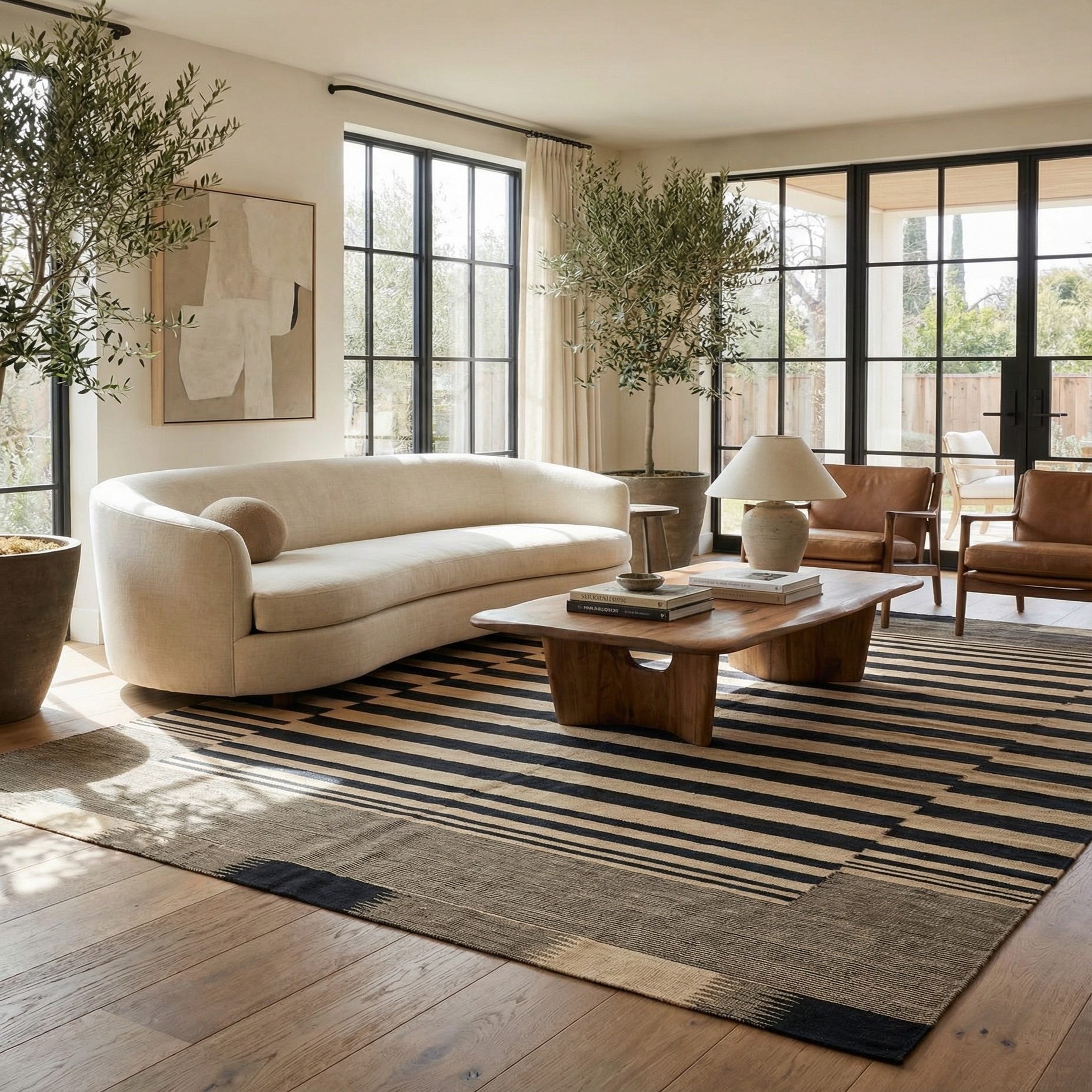 A 7x10 rectangular flatweave rug with a modern tribal pattern of thick black and ivory stripes.