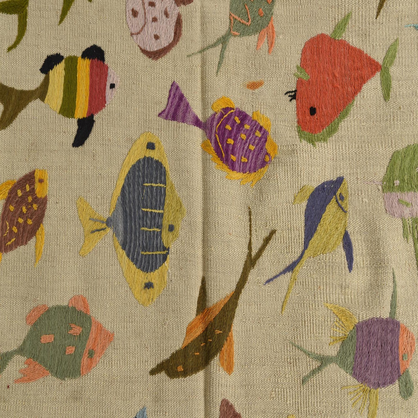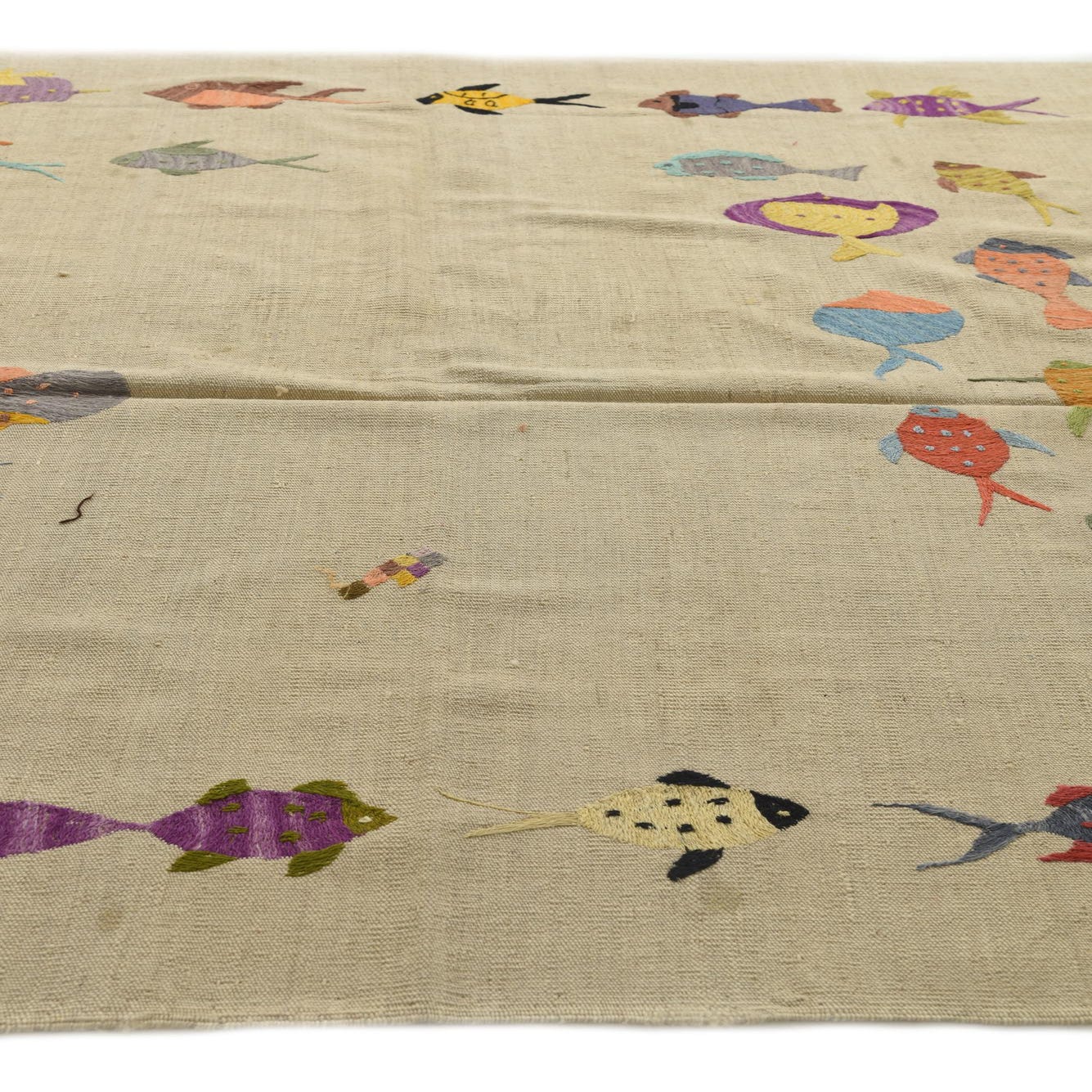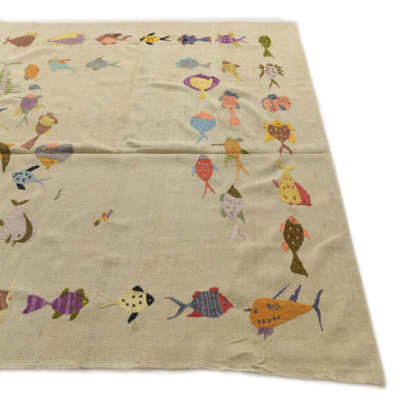 7x10 rectangular Kilim Suzani rug with a cream background and colorful embroidered fish patterns in various sizes and hues.