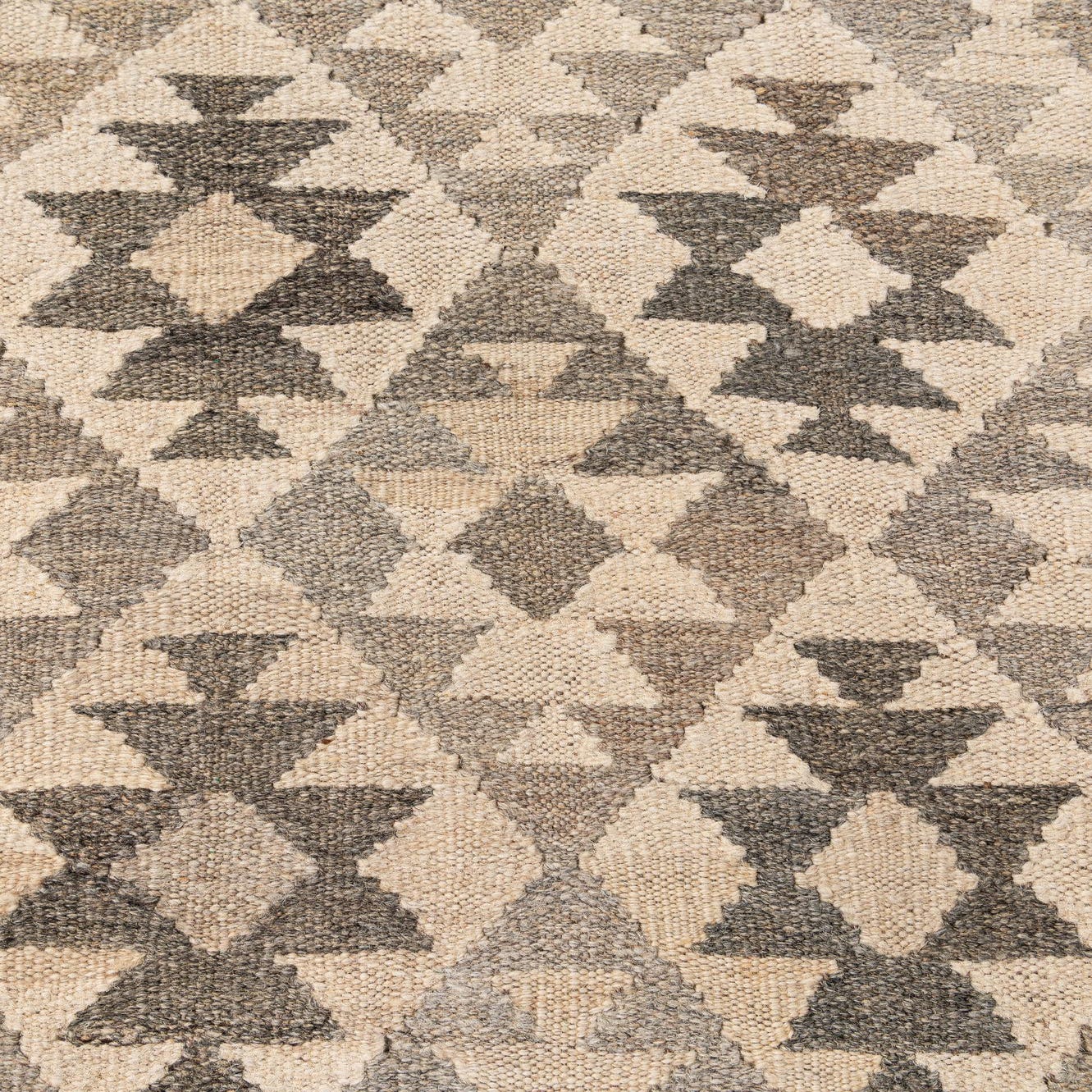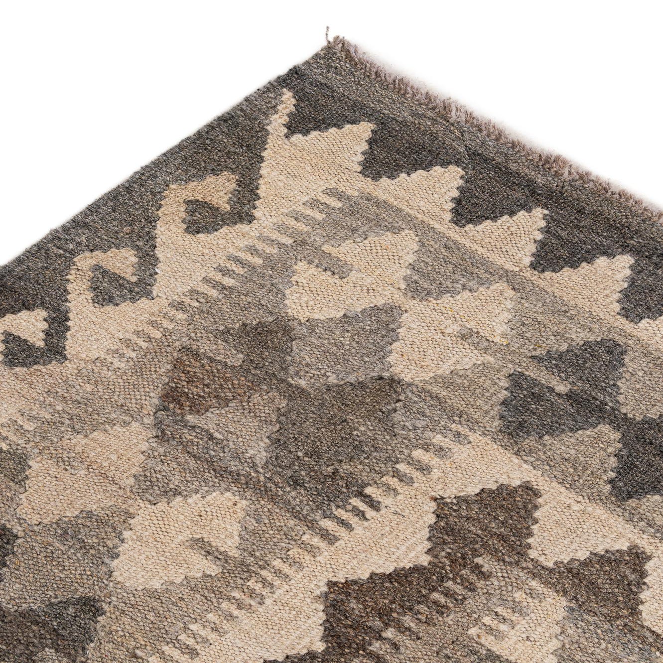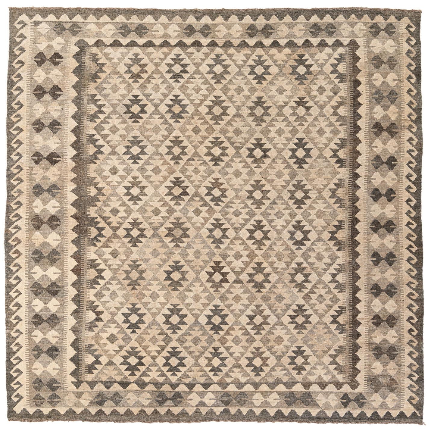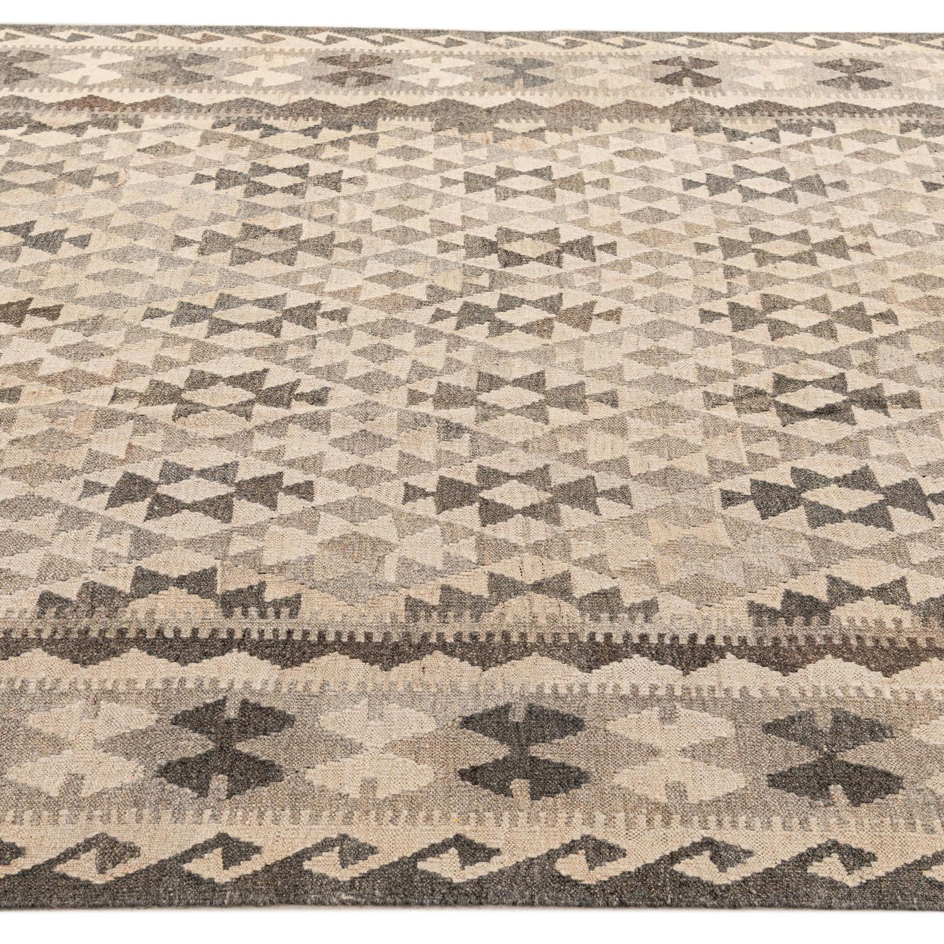 A 7x10 rectangular Kundan Kilim rug featuring a tribal geometric pattern in shades of ivory, cream, and gray.