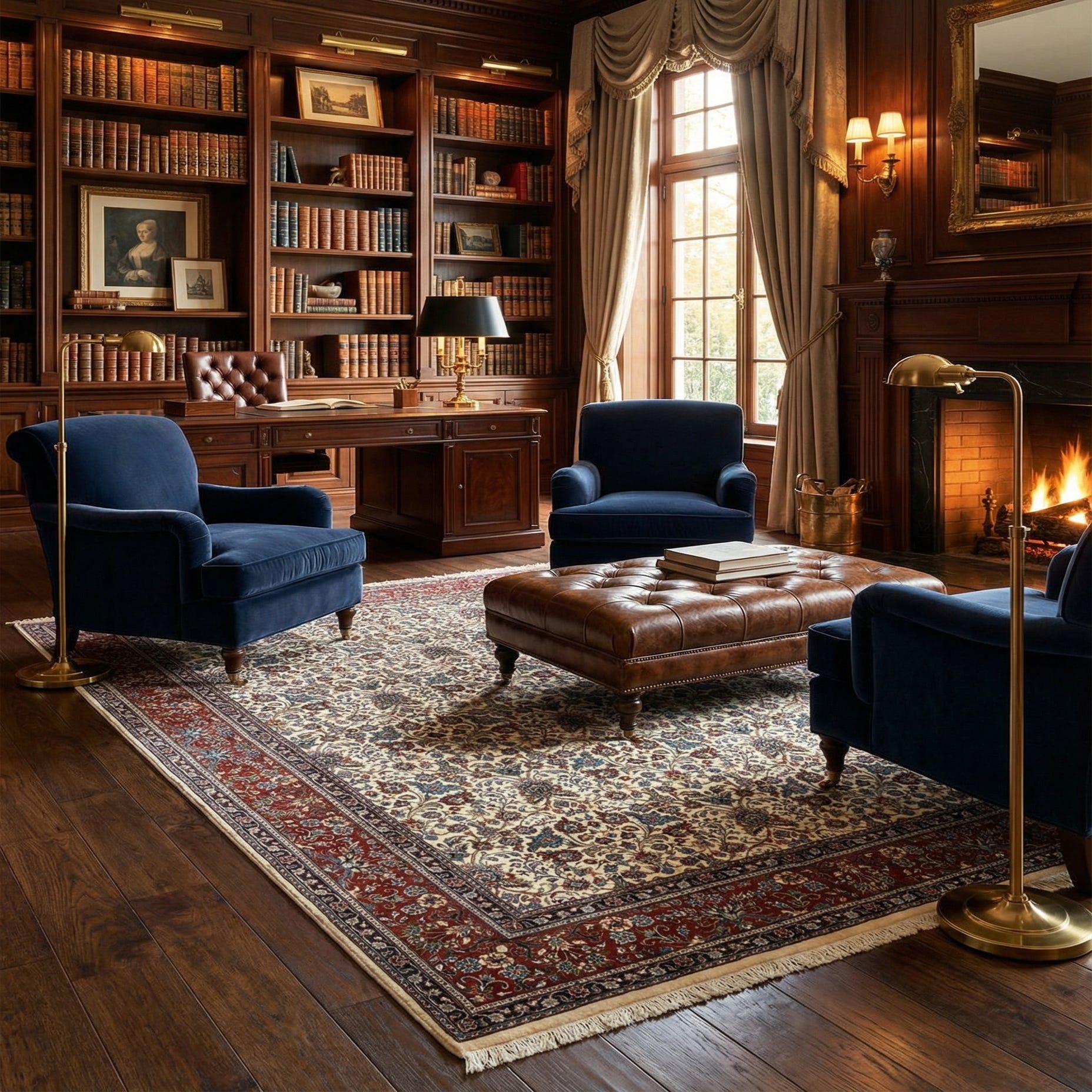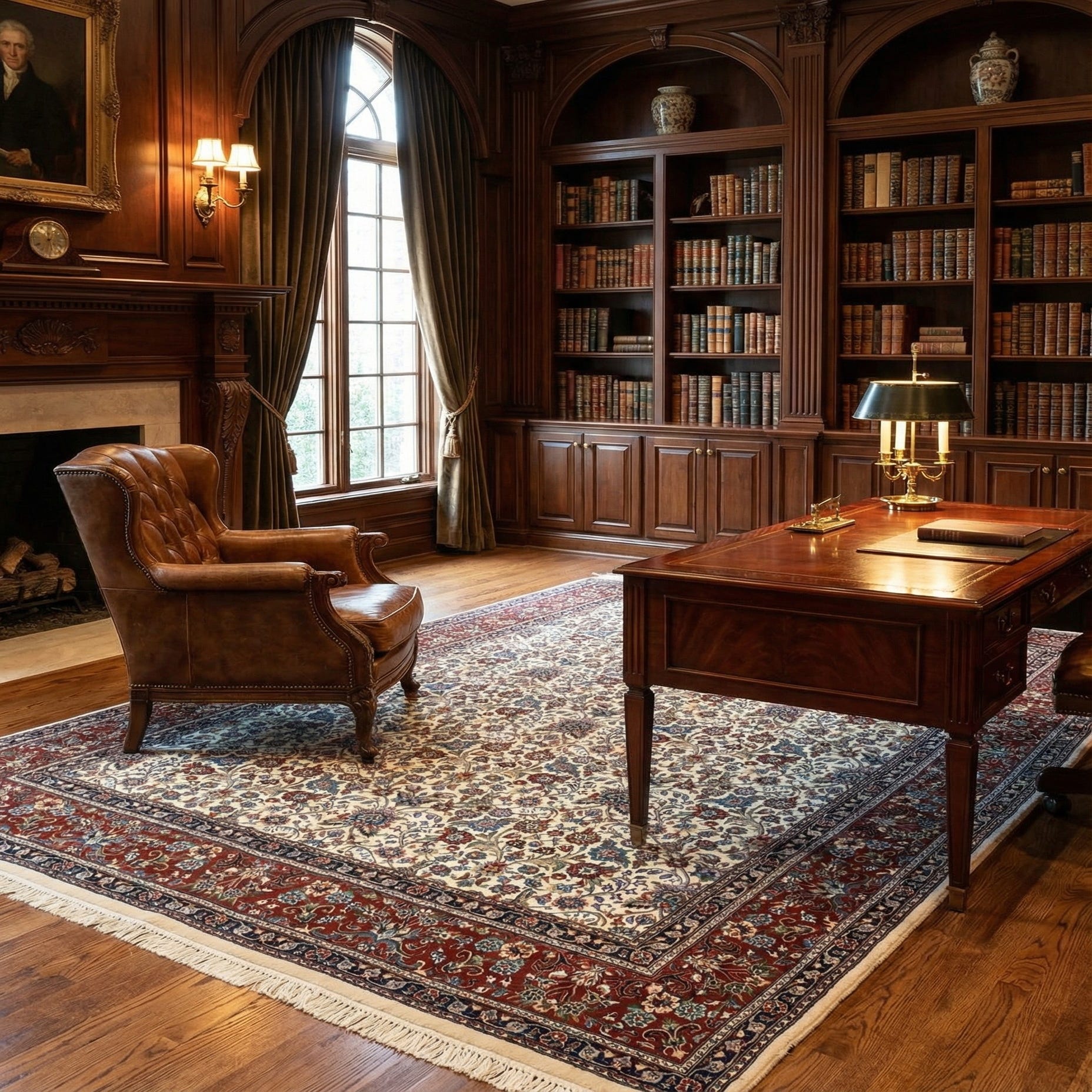 This rug's classic design and timeless color palette make it an ideal choice for living rooms, dining rooms, or any area where a touch of elegance is desired. It can seamlessly integrate with traditional decors yet possesses enough versatility to act as a statement piece in more transitional or eclectic spaces. The refined pattern and balance of warm and cool tones enable it to coordinate with a variety of wood finishes and fabric hues, assuring its place as a cherished centerpiece in the chosen interior setting.