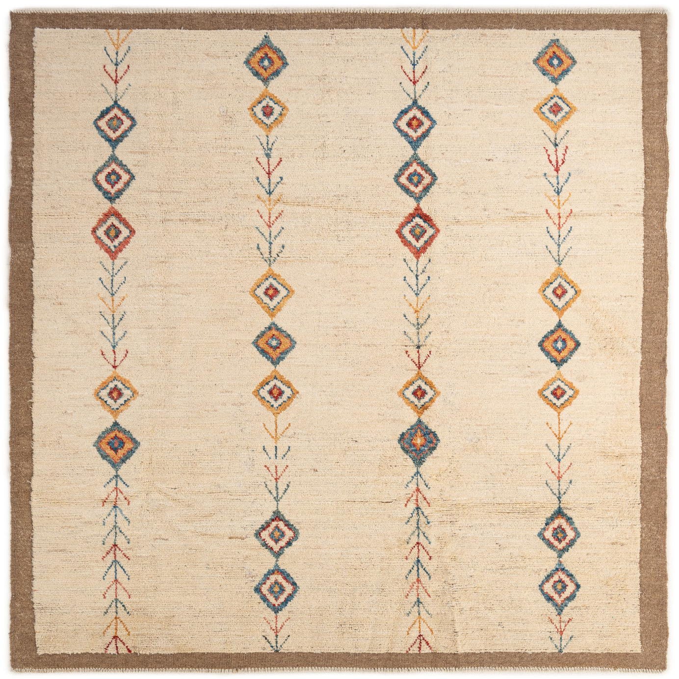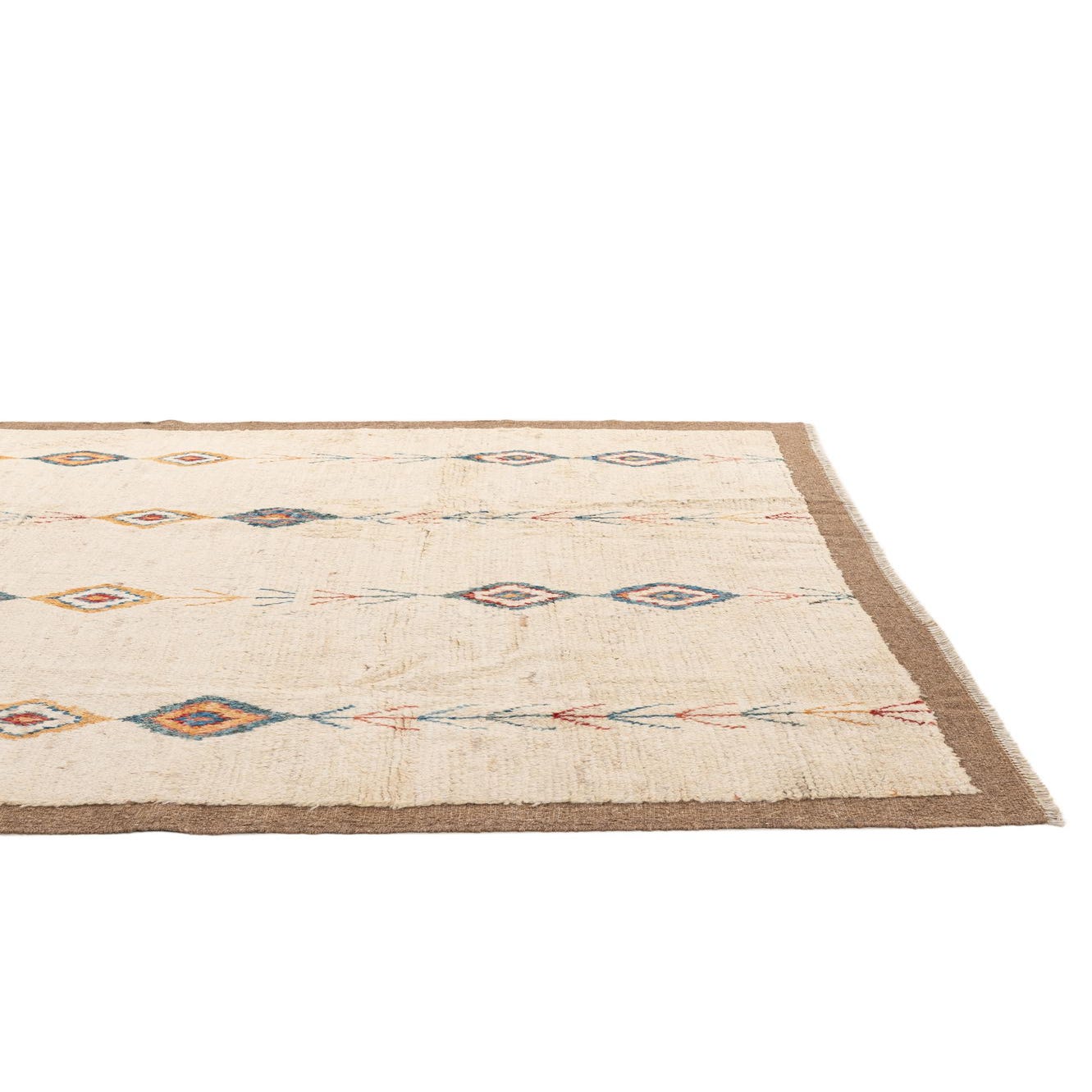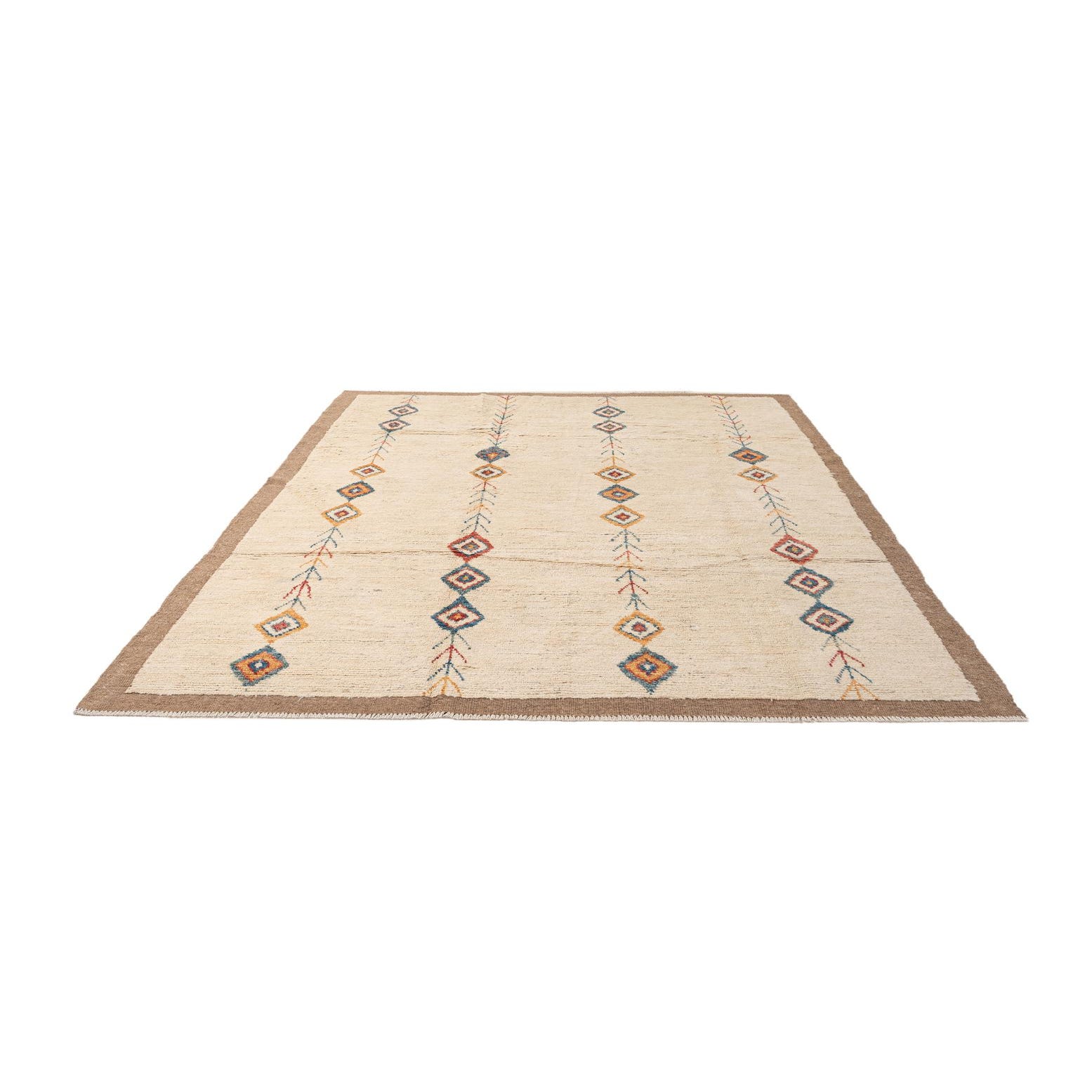 A 7x10 rectangular ivory wool rug with a brown border and vertical rows of colorful tribal diamond and arrow patterns.