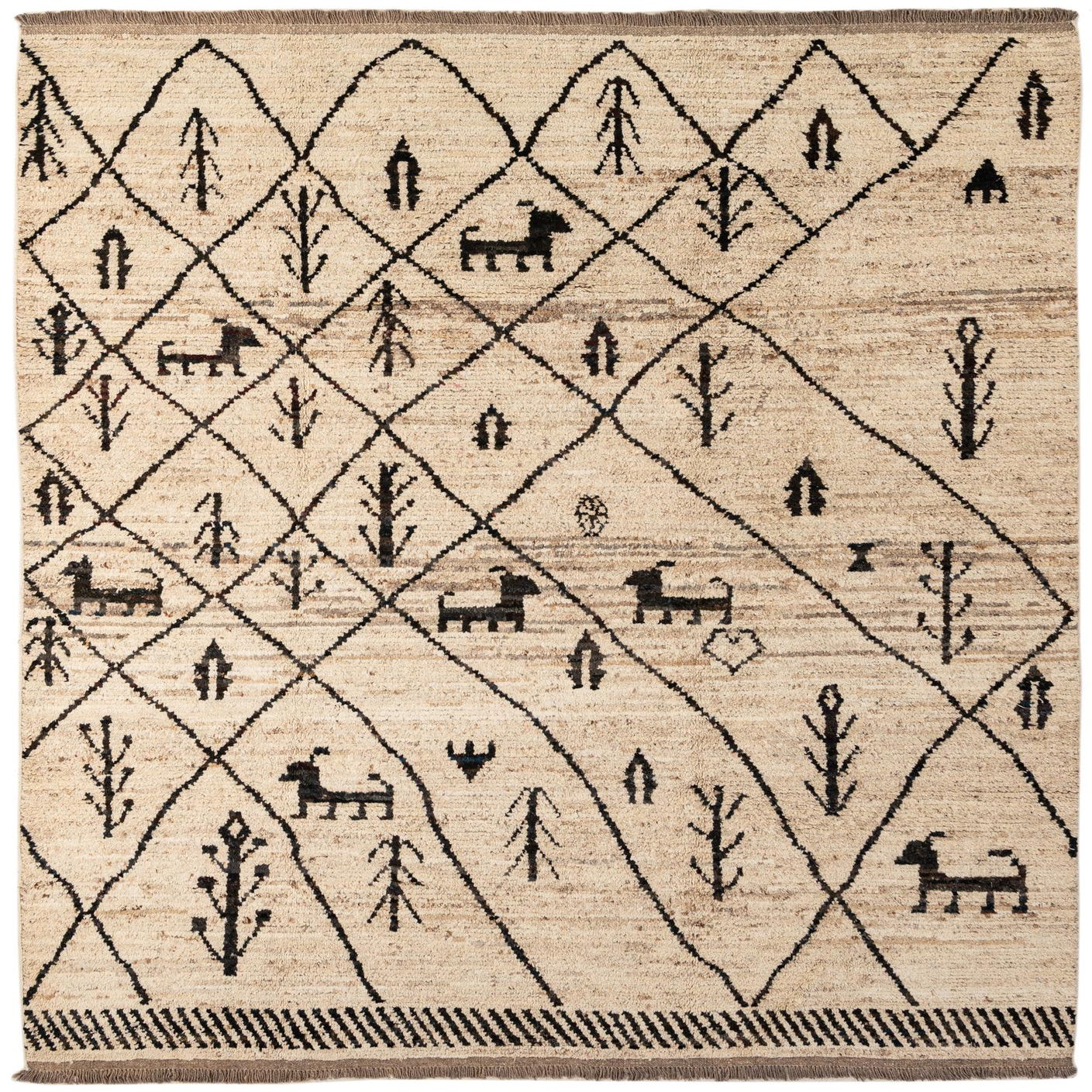 A 7x10 rectangular ivory wool rug with a black tribal pattern of diamonds, trees, and animal figures.