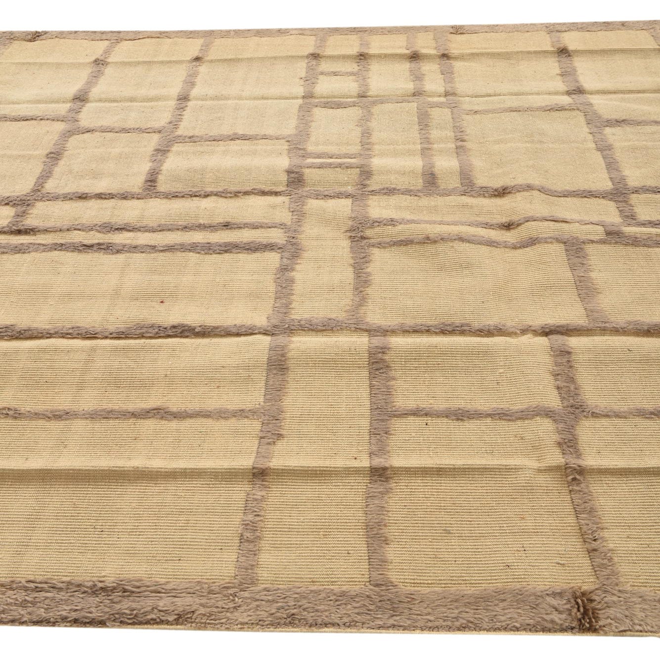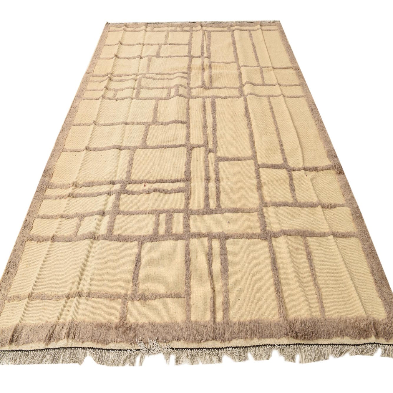 A 7x10 rectangular ivory wool shag rug with a modern tribal abstract pattern in muted cream tones, featuring a textured border.