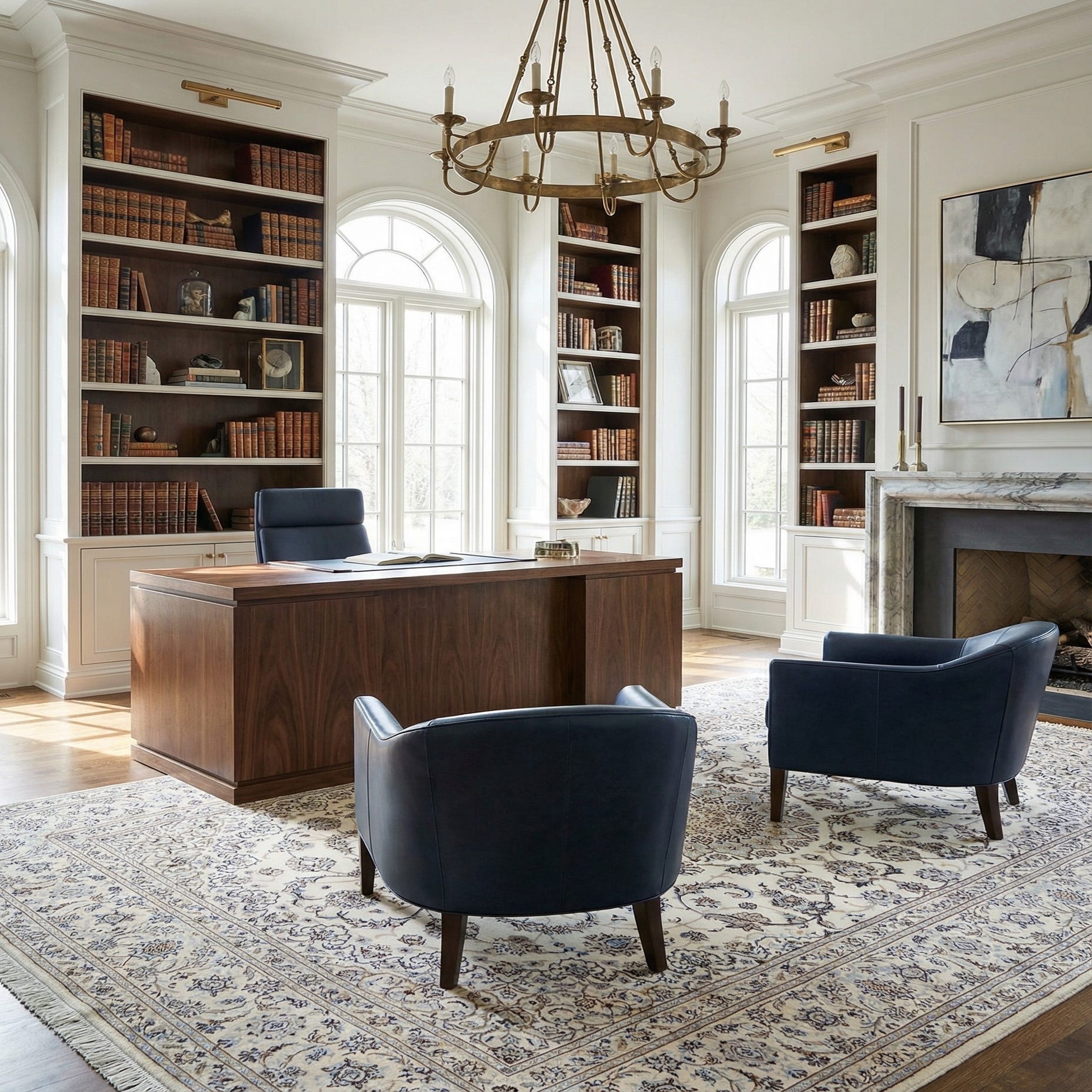 A 7x10 rectangular ivory Persian rug with intricate floral patterns in cream, blue, and brown, featuring a central medallion.