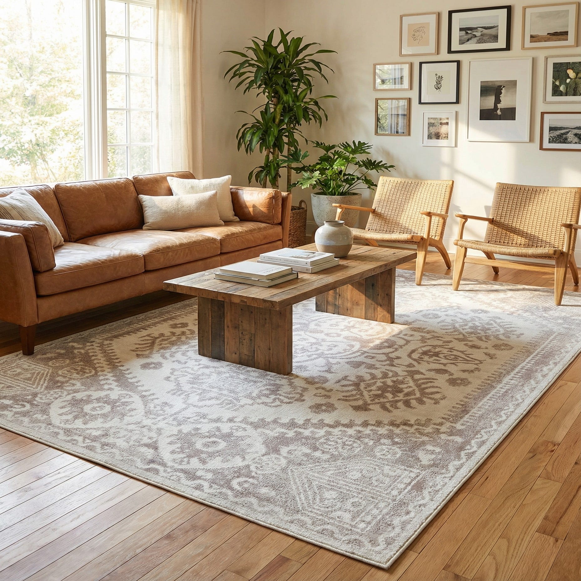 Machine-made from 100% polypropylene, this rug offers consistent pattern clarity and reliable construction for regular use. The neutral cream and ivory palette works well with modern farmhouse, coastal, or transitional interiors; it can anchor a seating area beneath a sofa and coffee table, add a quiet layer under a bed, or provide a calming foundation in a dining room without competing with bold furnishings.